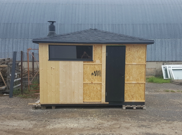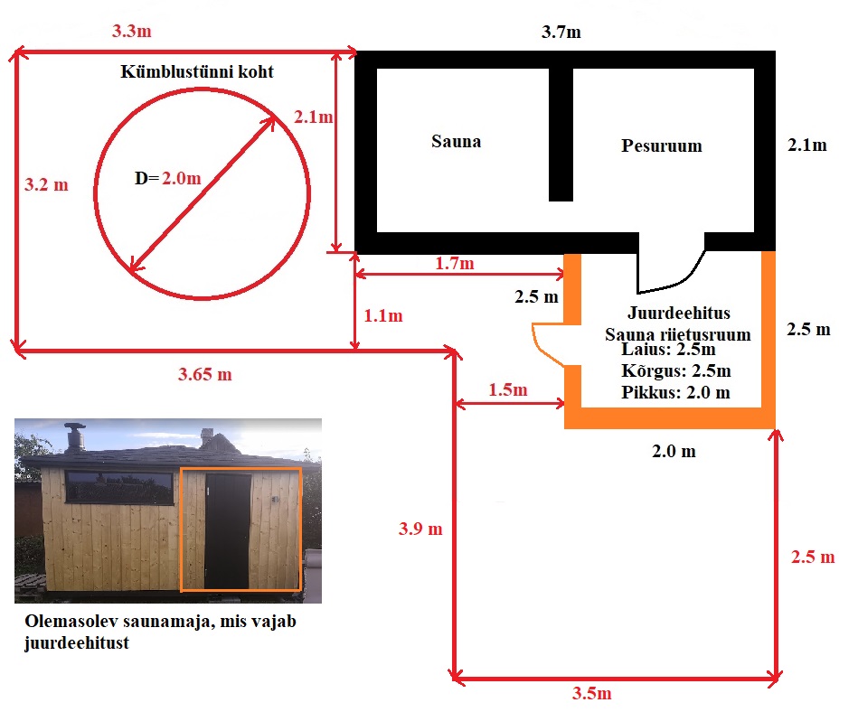 Krundil on paigaldatud valmis saunamaja. Saunamajas on puudu kolmas ruum ehk riietusruum. Antud ruumi vaja juurde ehitada. Ümber saunamaja vaja ehitada terrass astmetega. Terrassi peale läheb paika kümblustünn.