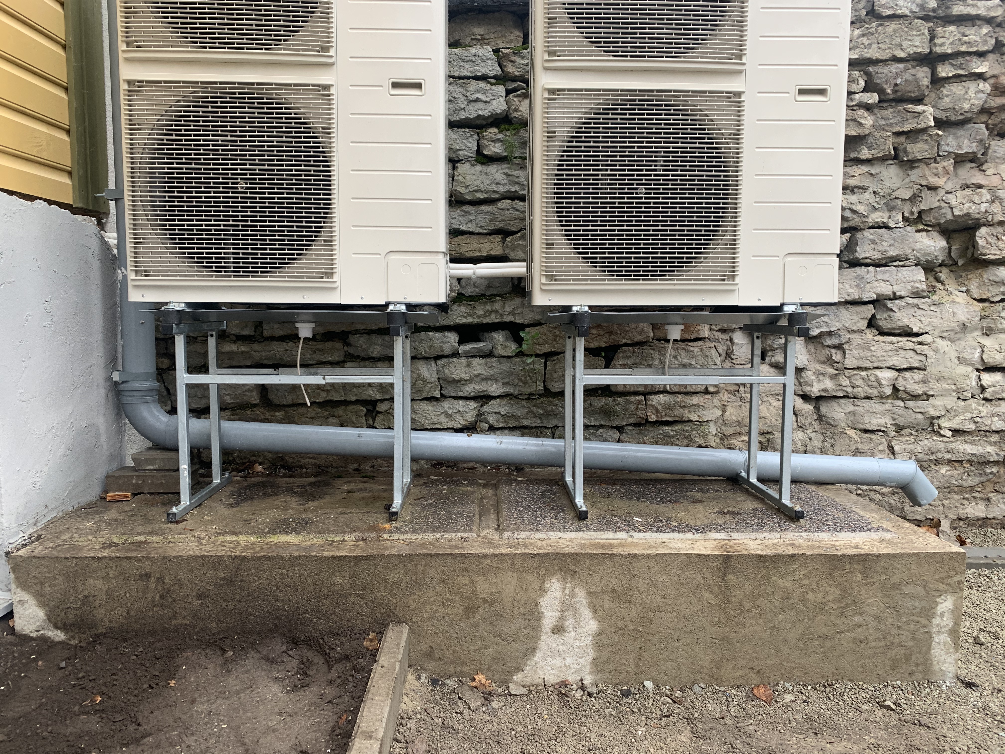 Varjestust kandev karkass vaja ehitada 4-külge, olemasolevale betoneeritud alusele, kinnitada metallnurkadega. Höövellauad vaja paigaldada ainult 2-külge (esikülg ja parem külg), sest soojuspumbad asuvad hoone ja paekivimüüri nurgas.