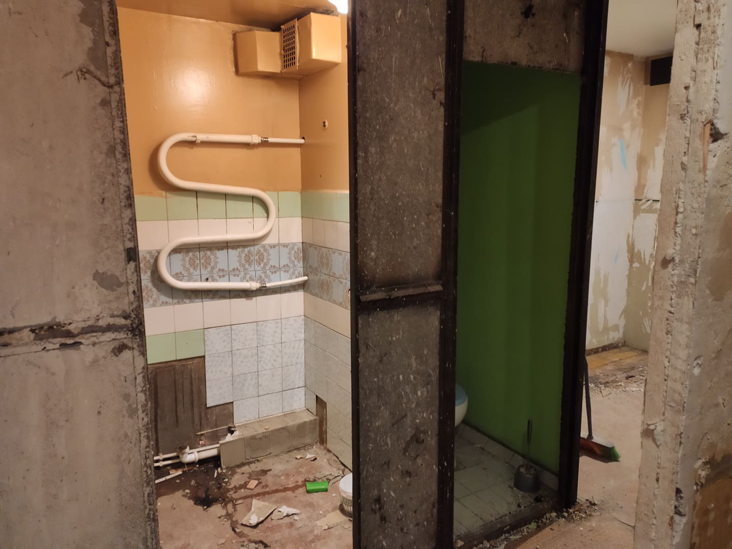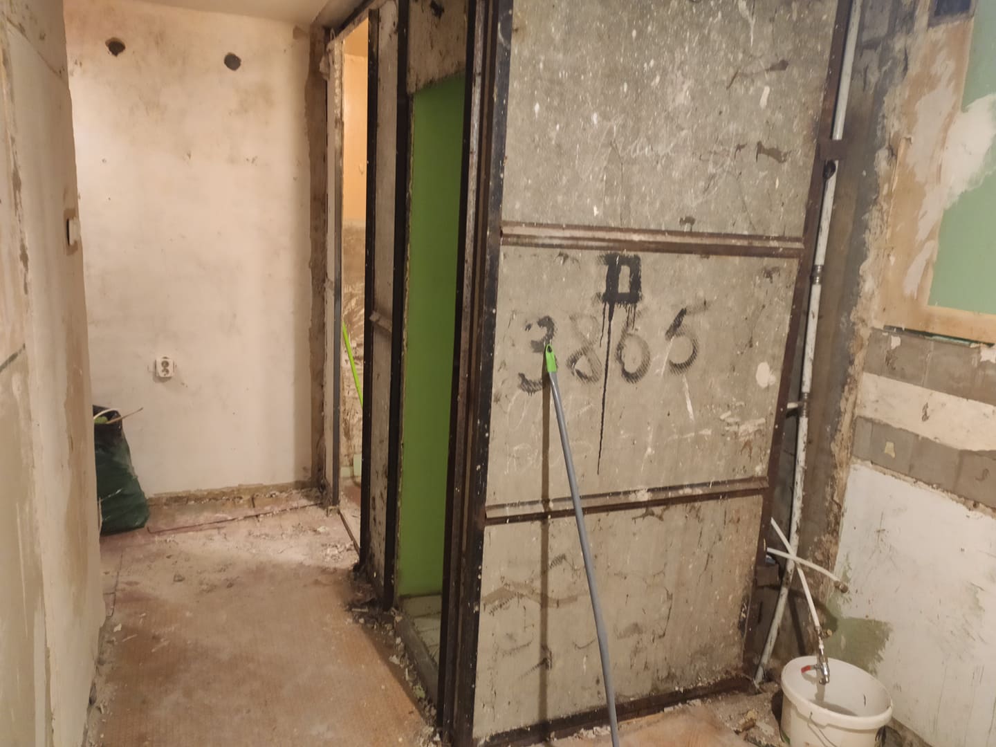 2. Vannitoa/WC karbi lammutus ja utiliseerimine. Ca 1cm paksuse kergbetoonplaadist karbi välja lõhkumine ja utiliseerimine. Karp on metallkonstruktsioonil. Karbi kõrgus ca 2,4 m; ümbermõõt ca 7,2m. Osaliselt on vannitoa poolel keraamilised plaadid seinas. Lisaks tuleb eemaldada vana keraamiline plaat põrandalt ja karbi põhi(tõenäoliselt ca 5-10 cm betooni, pindala 3,12 m2). Tööde teostamise käigus ei tohi vigastada olemasolevat veetorustikku. Utiliseerimisele kuuluvad ka vanad kanalisatsioonitorud kuni püstakuni ja WC-pott. Siugtoru peab pärast karbi lae eemaldamist nt metallvitstega kinnitama korteri laepaneeli külge vältimaks torude kahjustamist/väändumist lammutamise käigus.