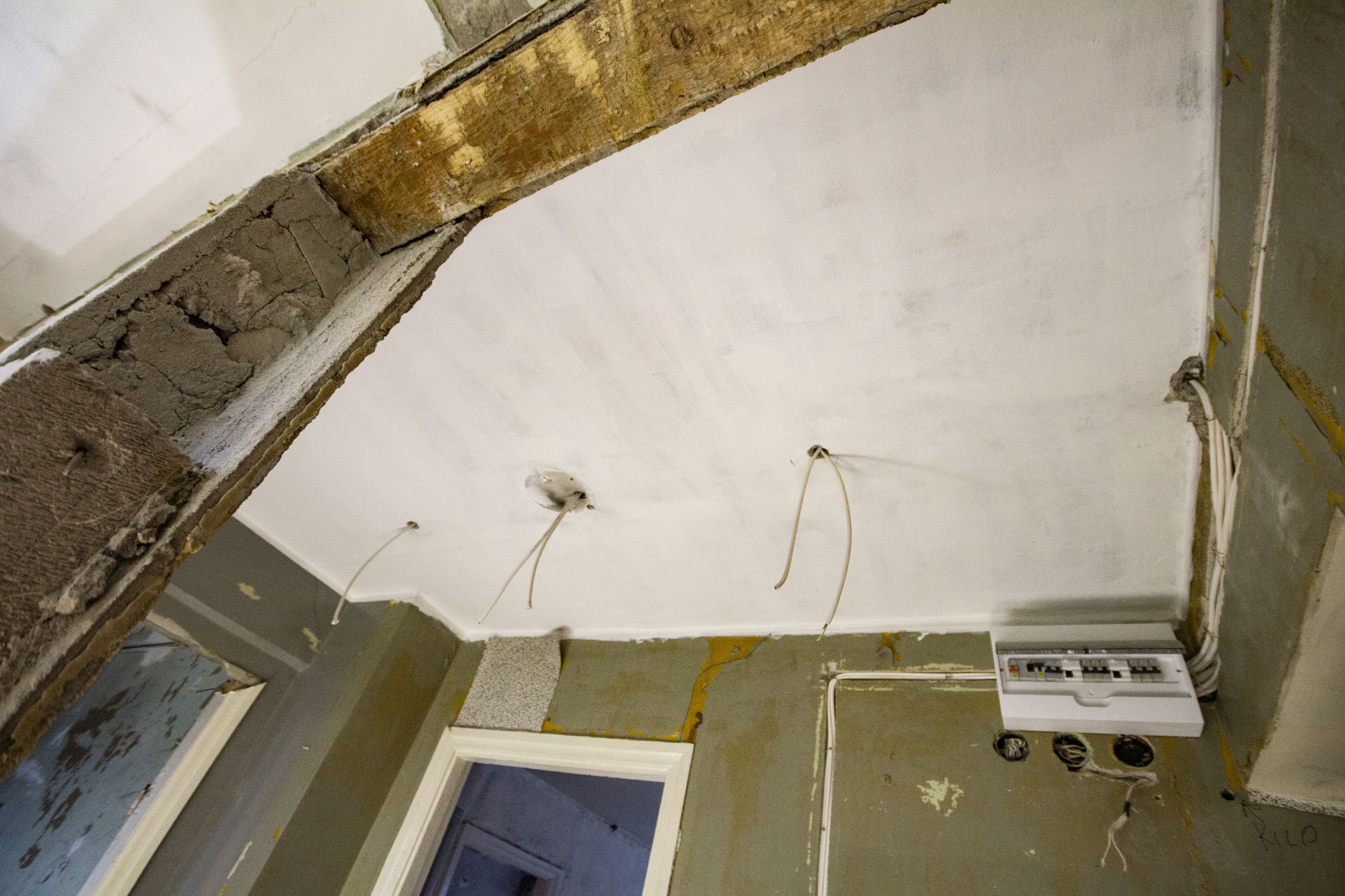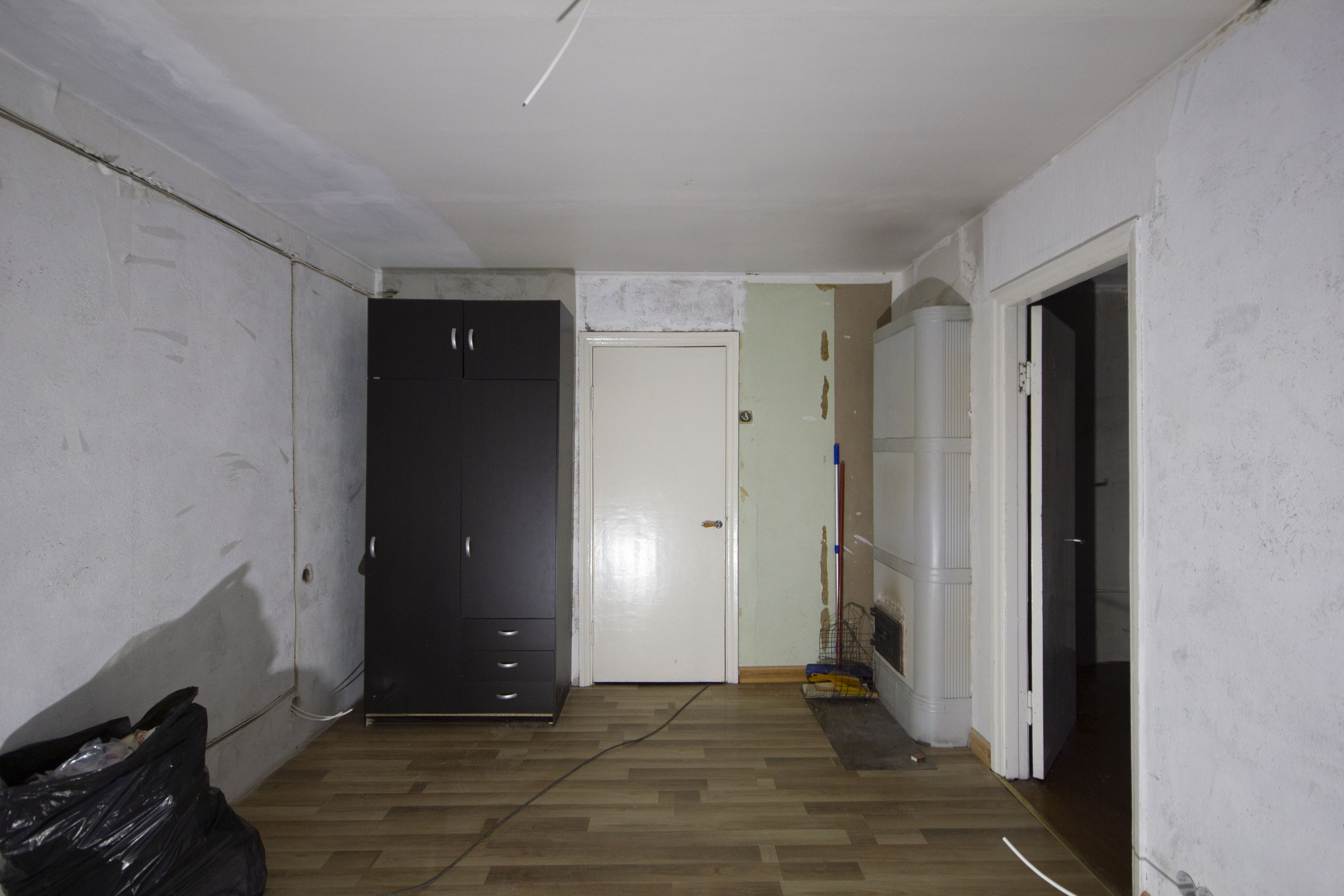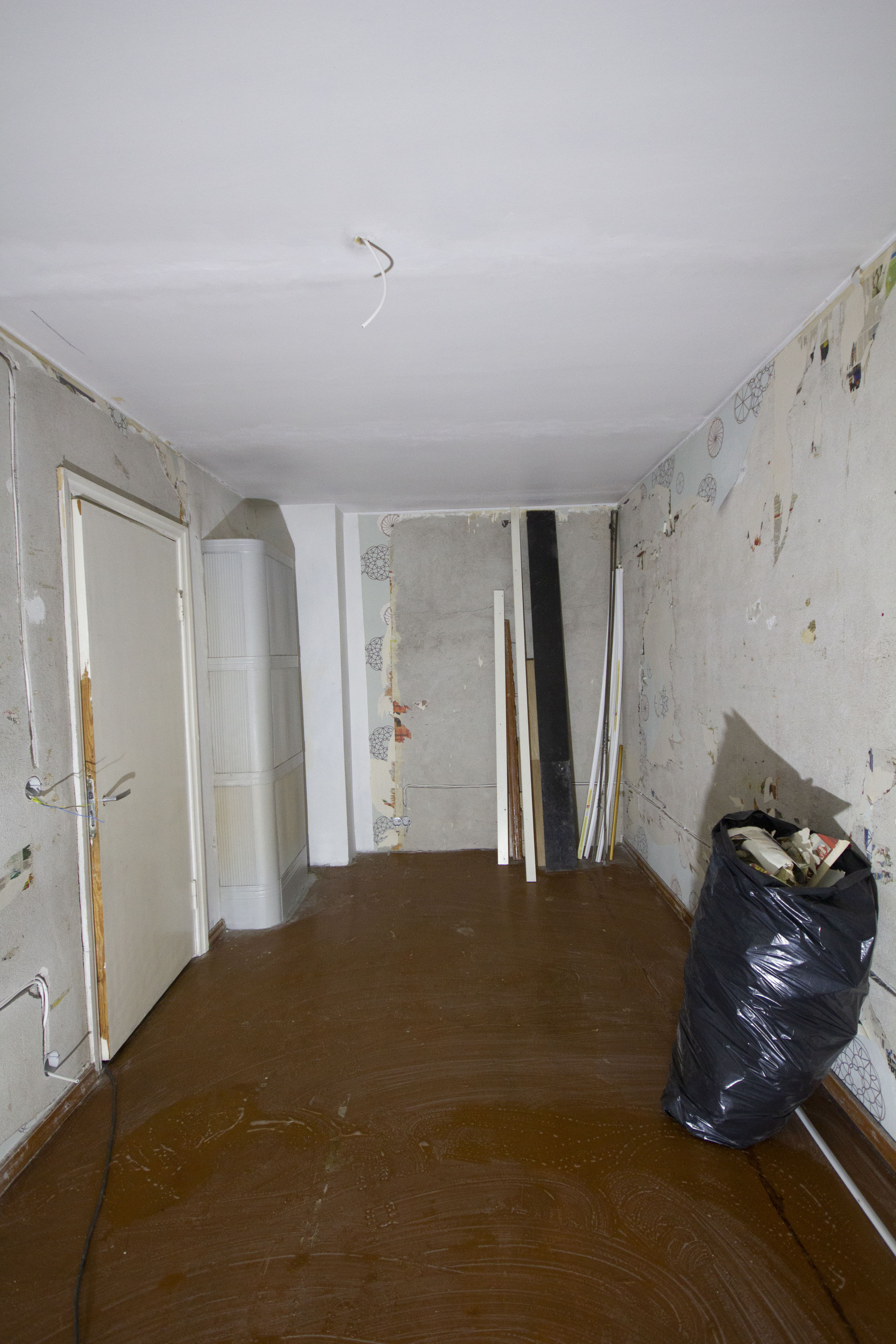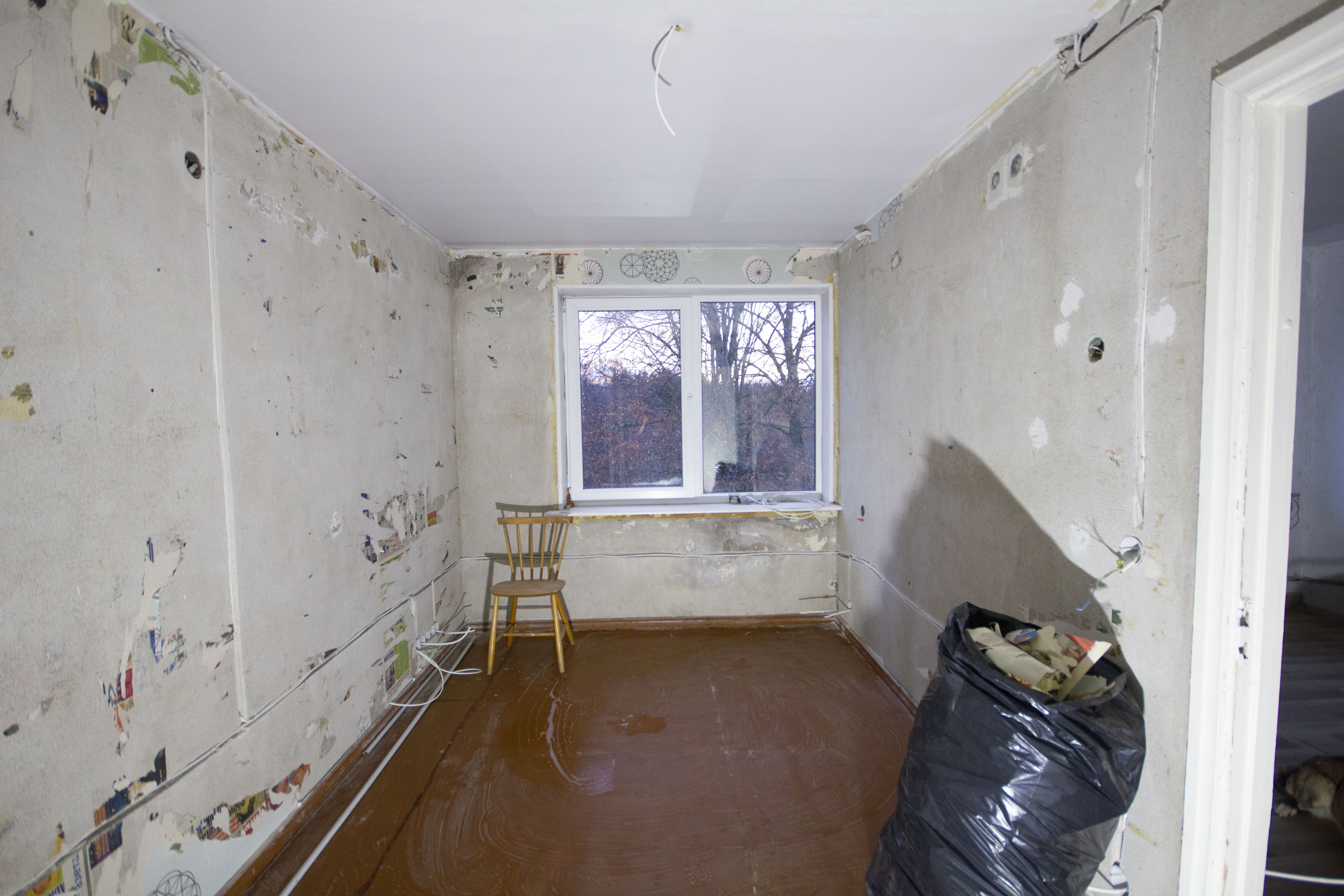 Seinad on krohvimiseks ette valmistatud (lisatud fotod on varem tehtud). Freesitud süvendid on pahteldatud, tapeet eemaldatud, uksed/liistud jms eemaldatud, seinavärv eemaldatud. Samas lagi on värvitud ja lihvimata.