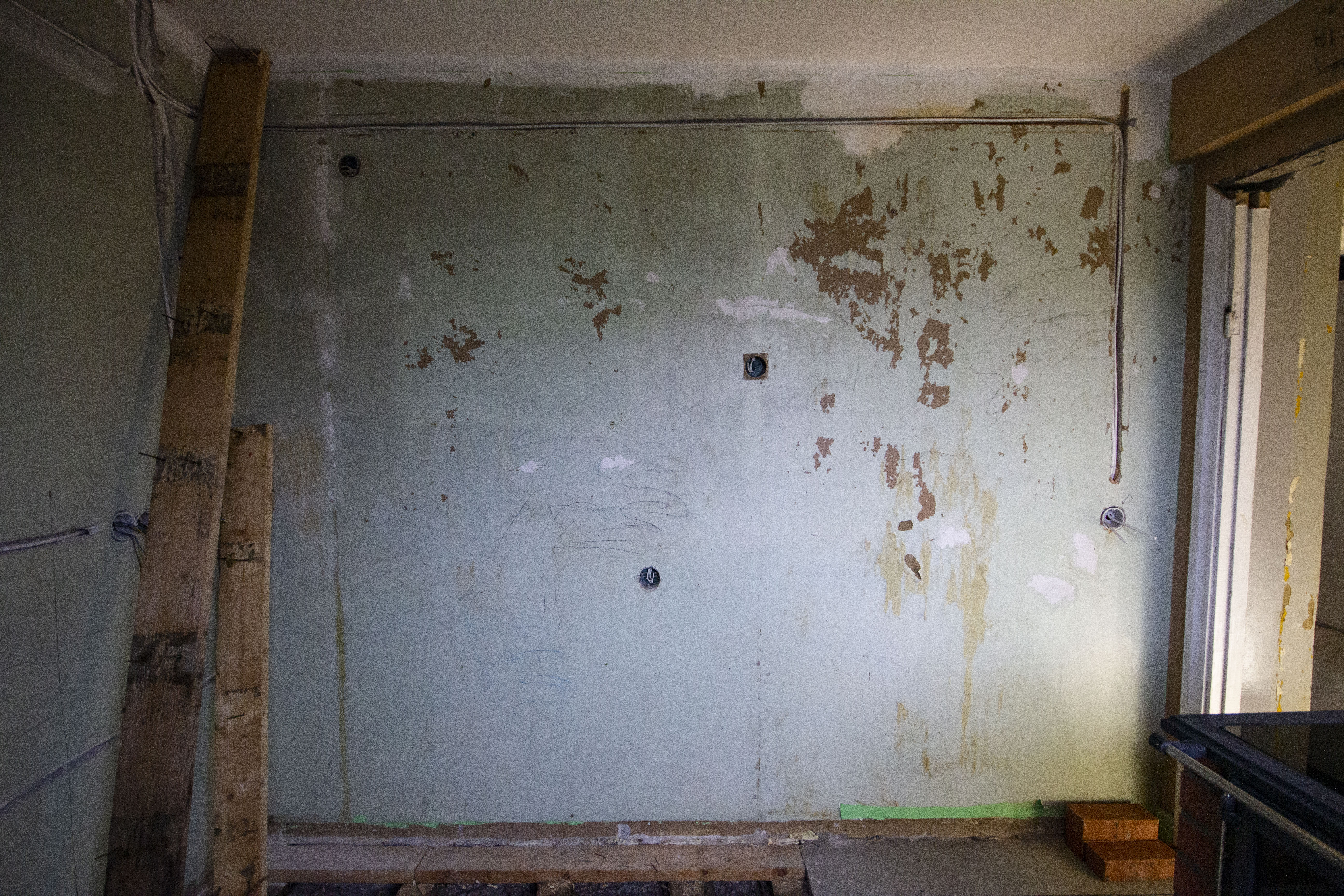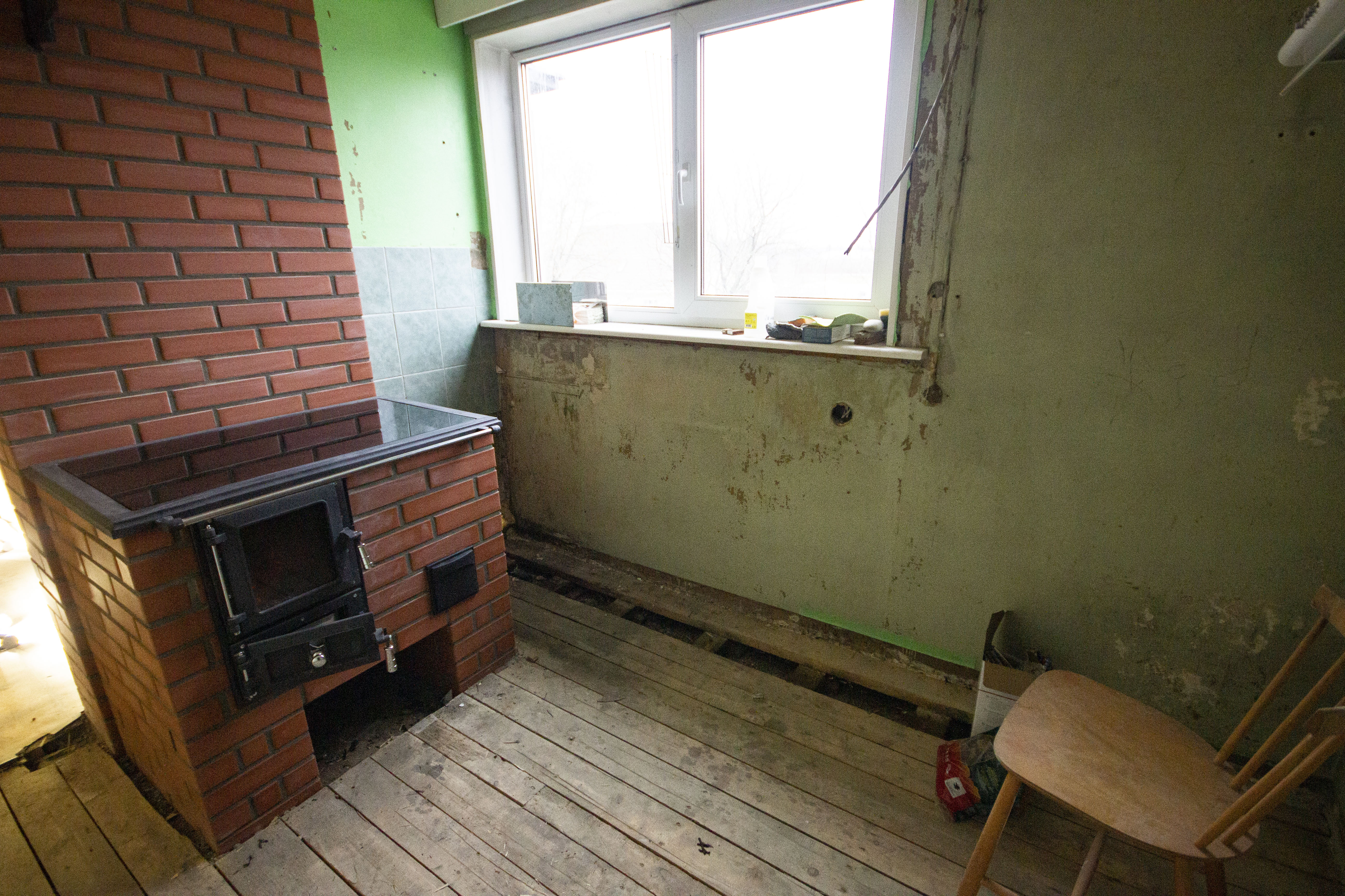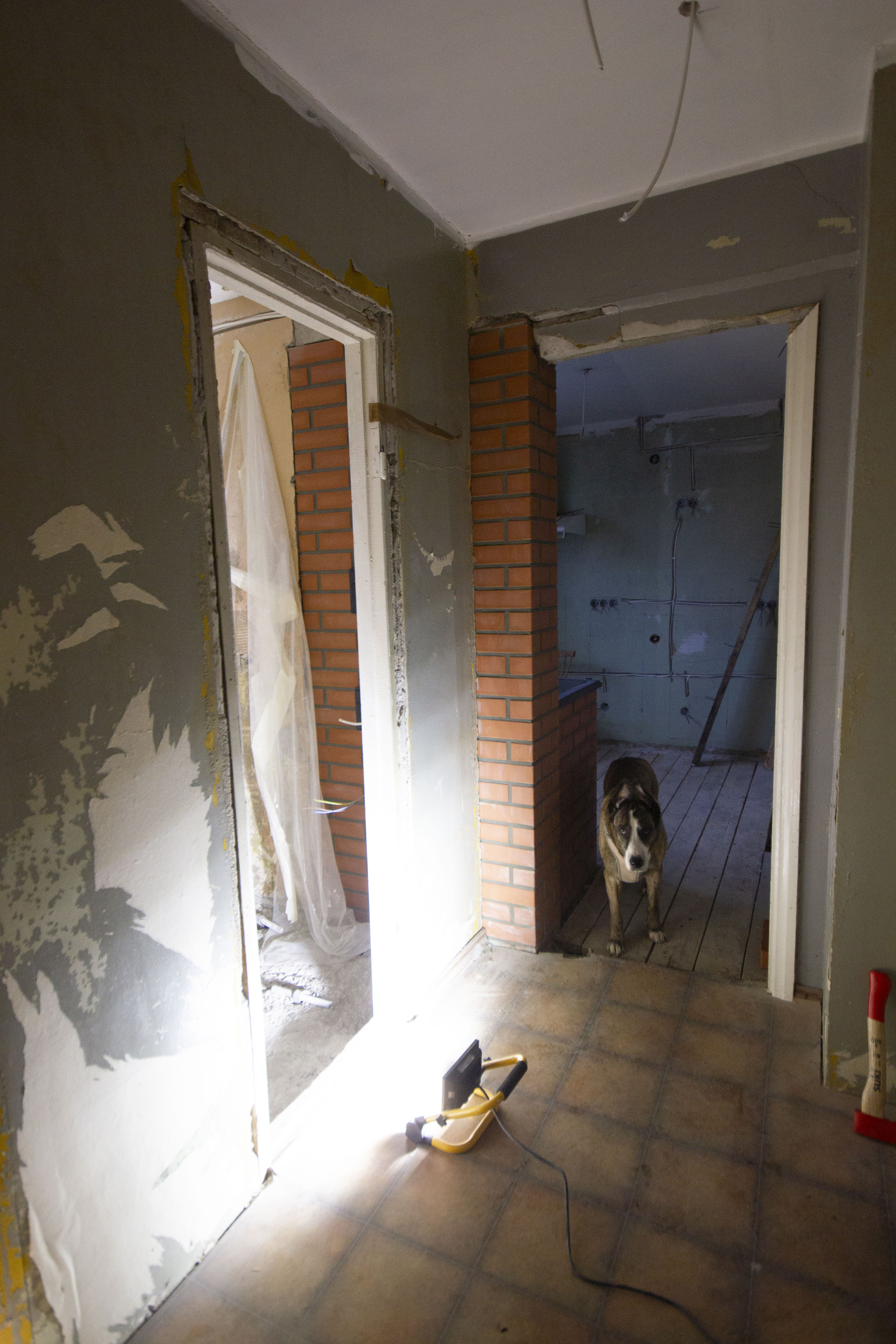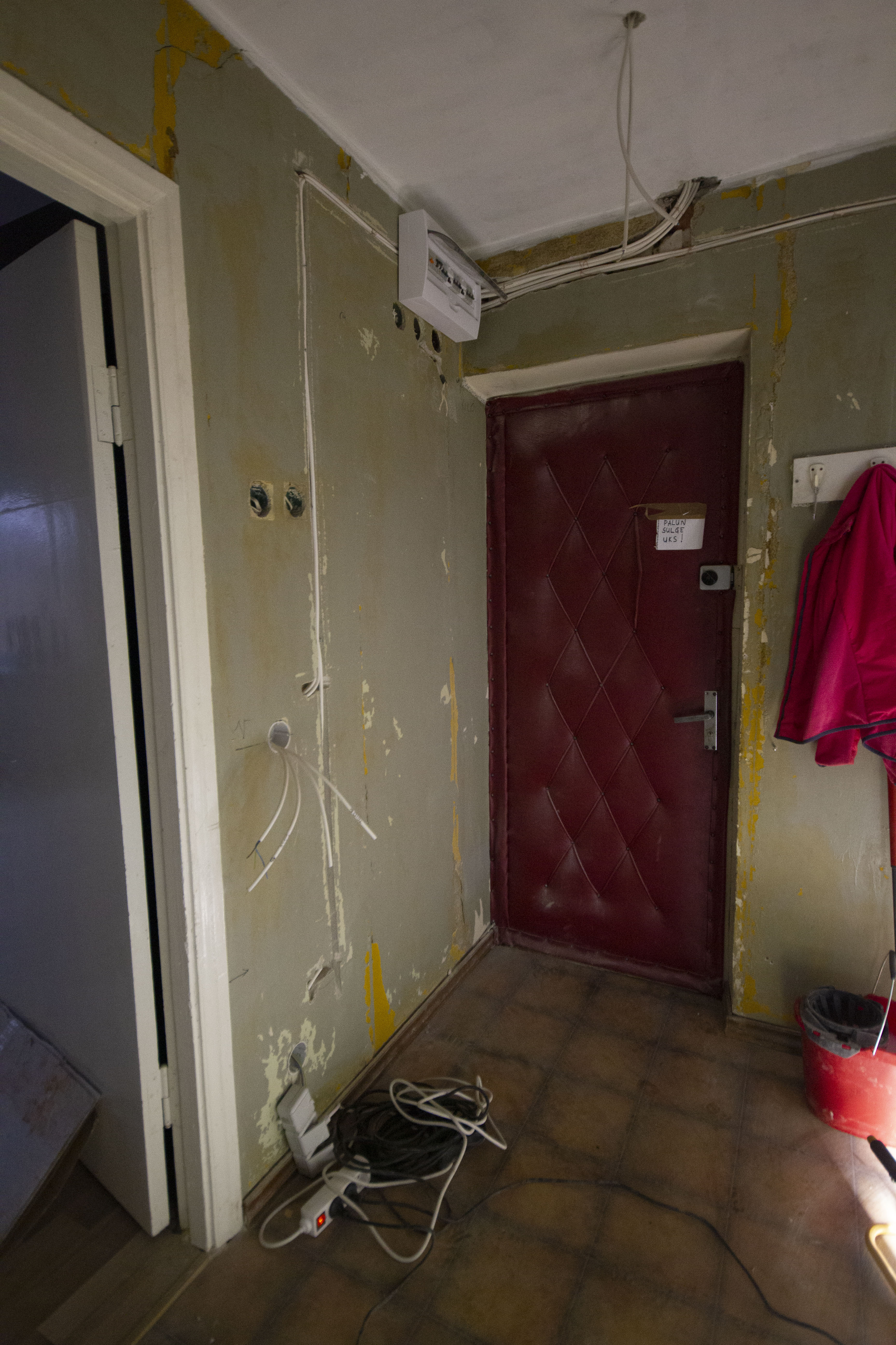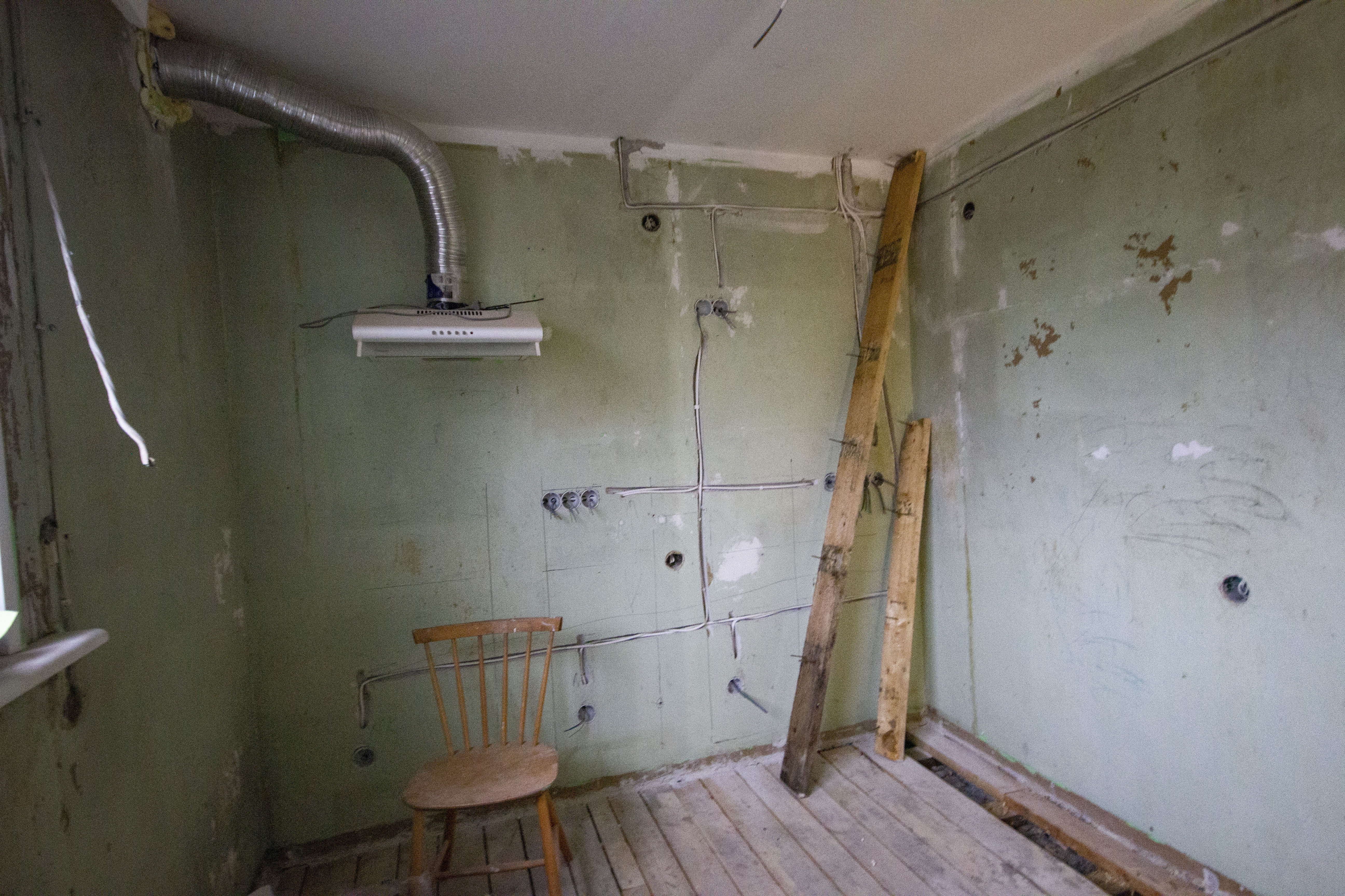 Seinad on krohvimiseks ette valmistatud (lisatud fotod on varem tehtud). Freesitud süvendid on pahteldatud, tapeet eemaldatud, uksed/liistud jms eemaldatud, seinavärv eemaldatud. Samas lagi on värvitud ja lihvimata.