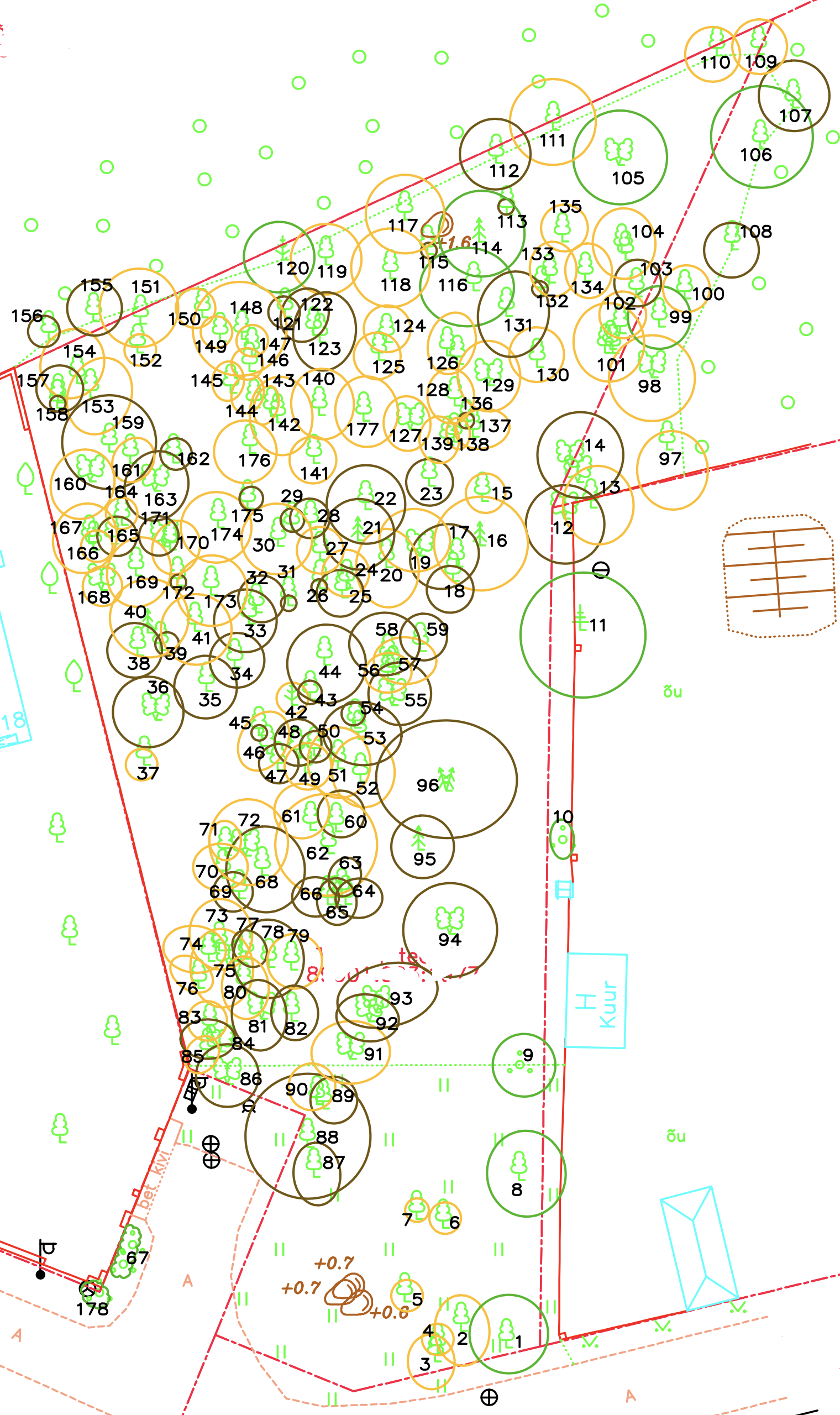 Manuses olevas Excelis väljatoodud eemaldatavate puude nimekiri, koos rinnas-läbimõõduga ja võra läbimõõt ning dendroloogilise uuringu pilt koos puude nummerdusega.