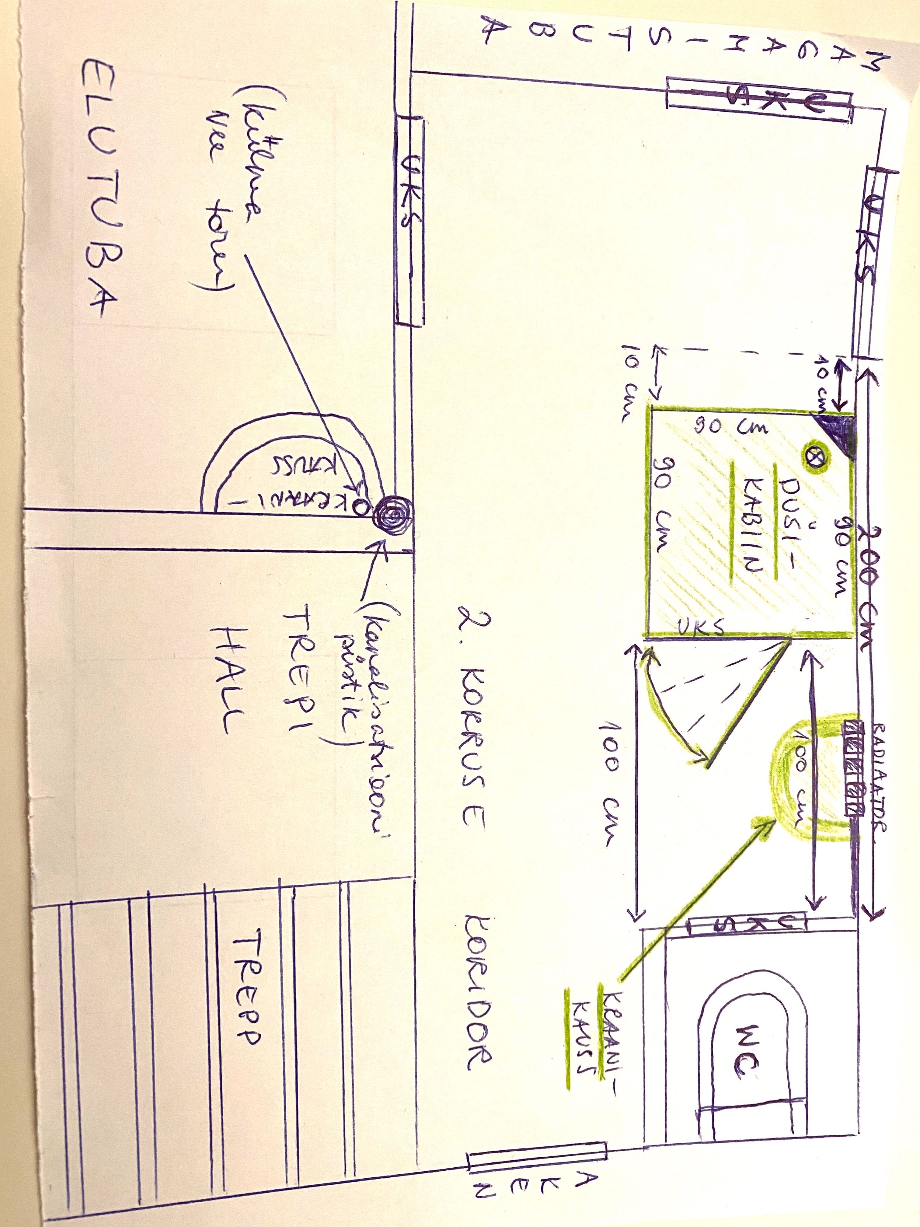 Soovin paigaldada dushikabiini ja kraanikaussi eramajas teisele korrusele. Sooja- ja külmaveetorud ning kanalisatsioonitoru tuleb vedada maja esimese korruse köögist, üle 1. korruse esiku lae (u. 2 meetrit lai) ja seejärel läbi puidust vahelae teisele korrusele. Lisatud joonised täpsema kirjeldusega.
