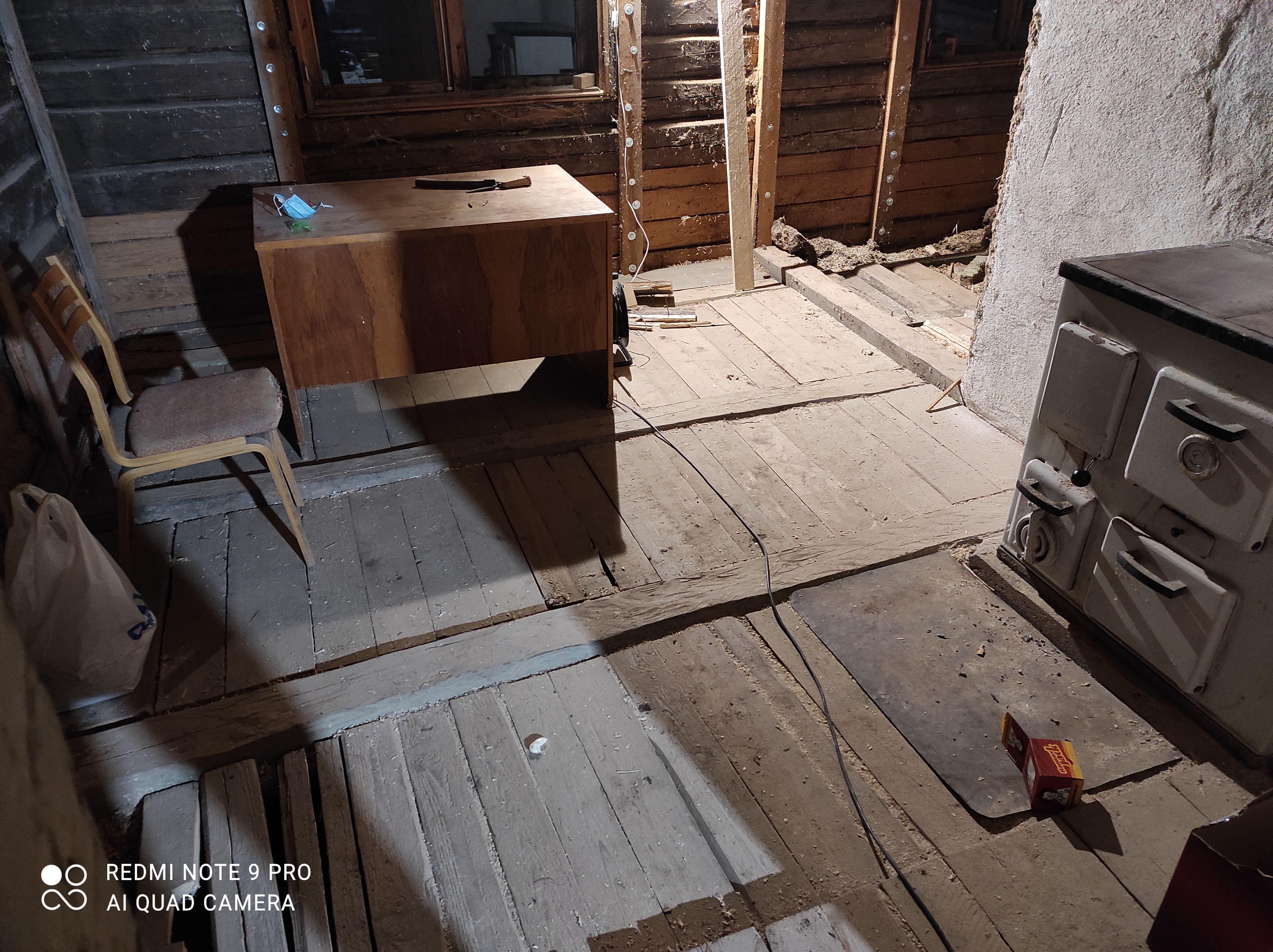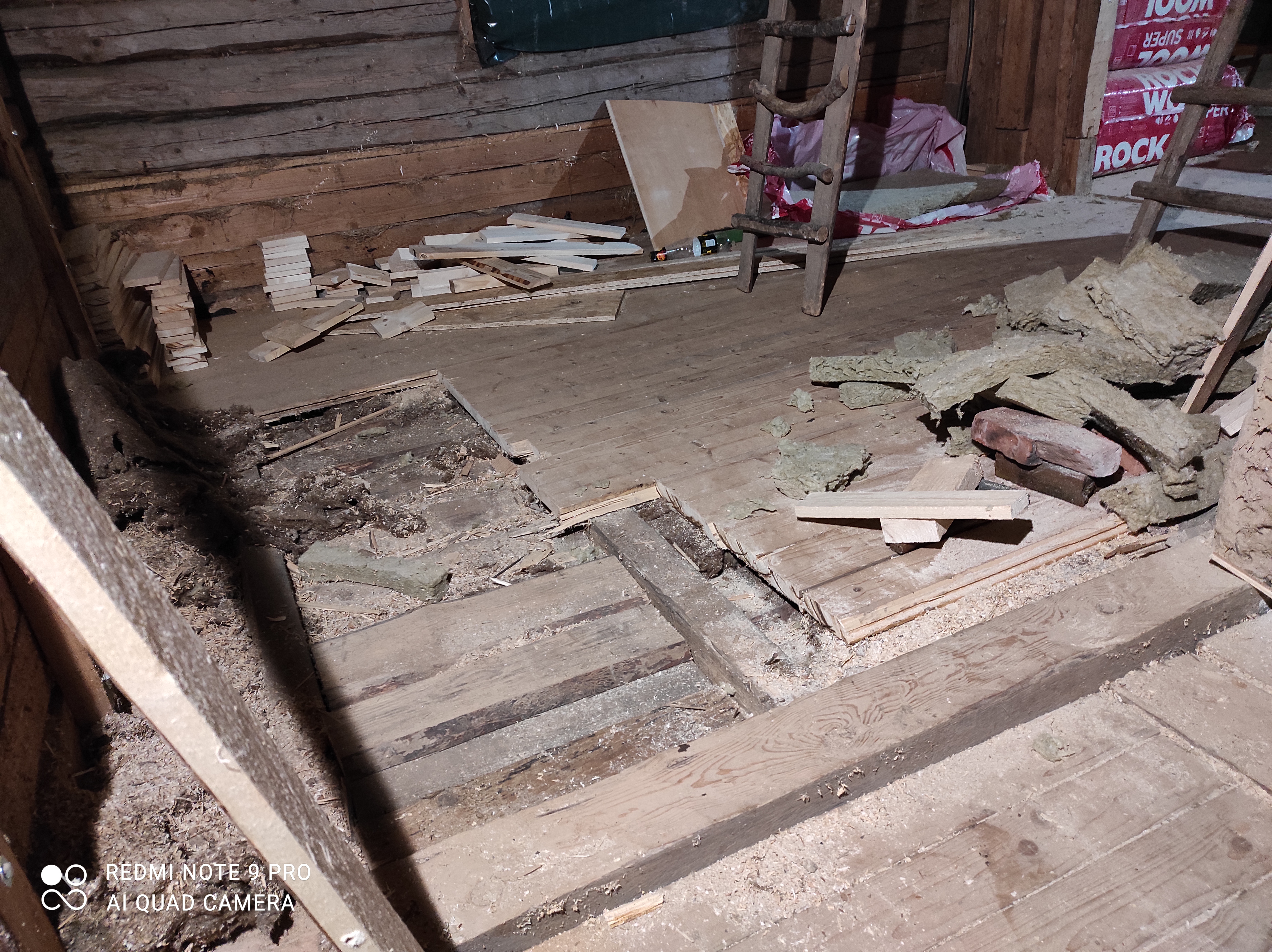 Vana põranda(punnlaua) eemaldamine, laagide uuendamine ja fibo paigaldamine laagide alla toestuseks, rihtimine. Soojustamine penoga, vee- ja kanalisatsioonitorude vedamine. Kokku ca 50 ruutu