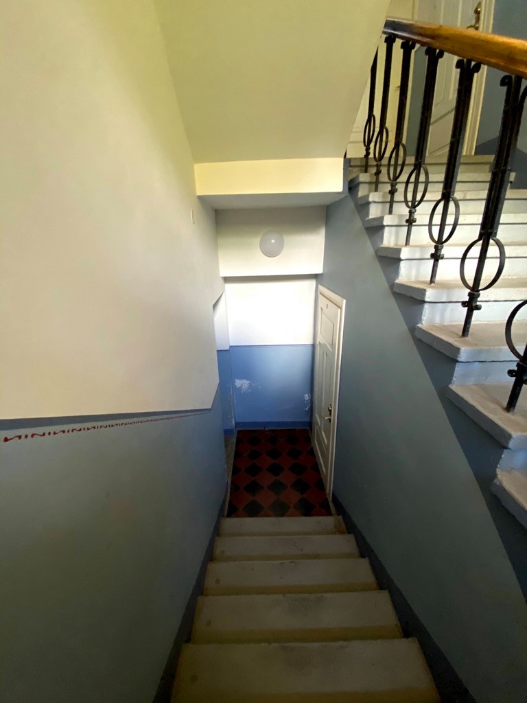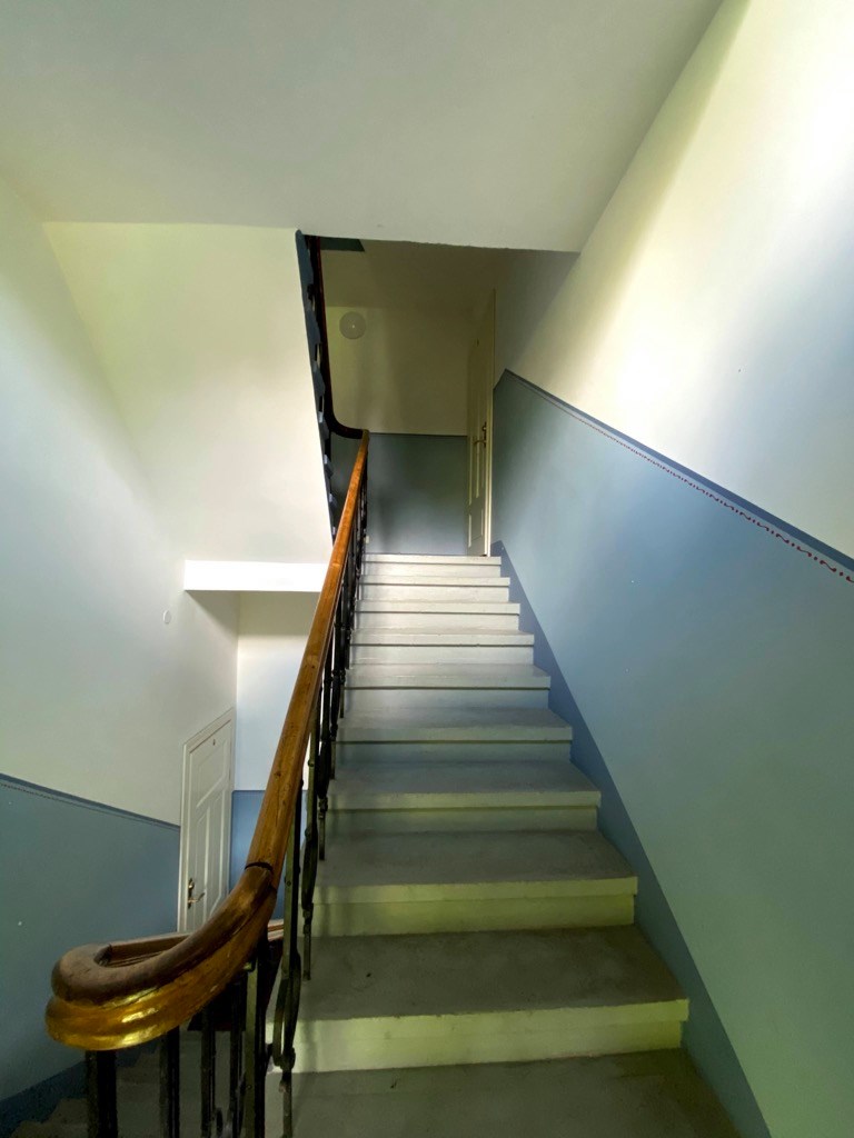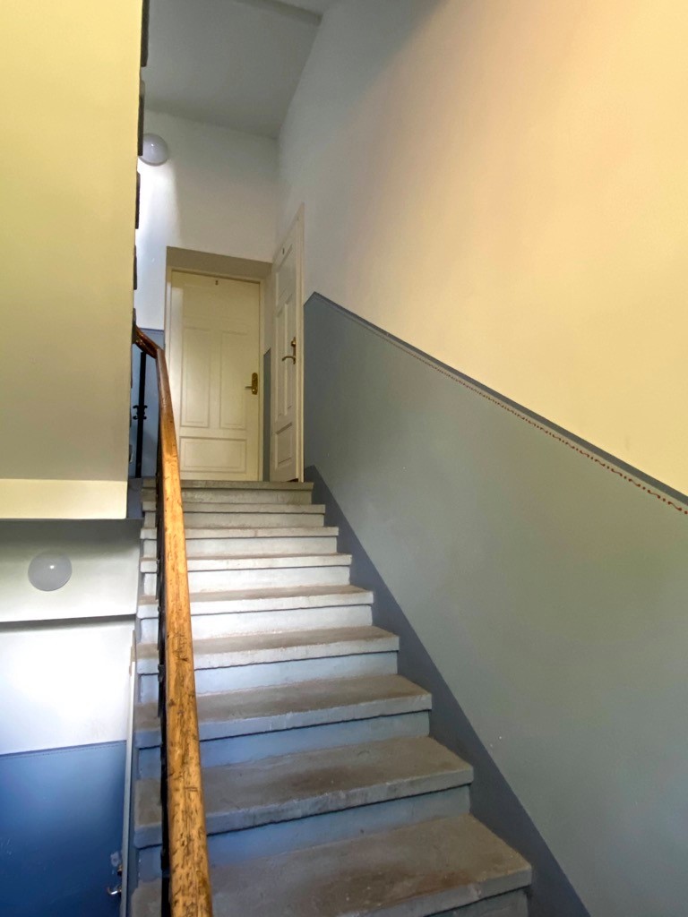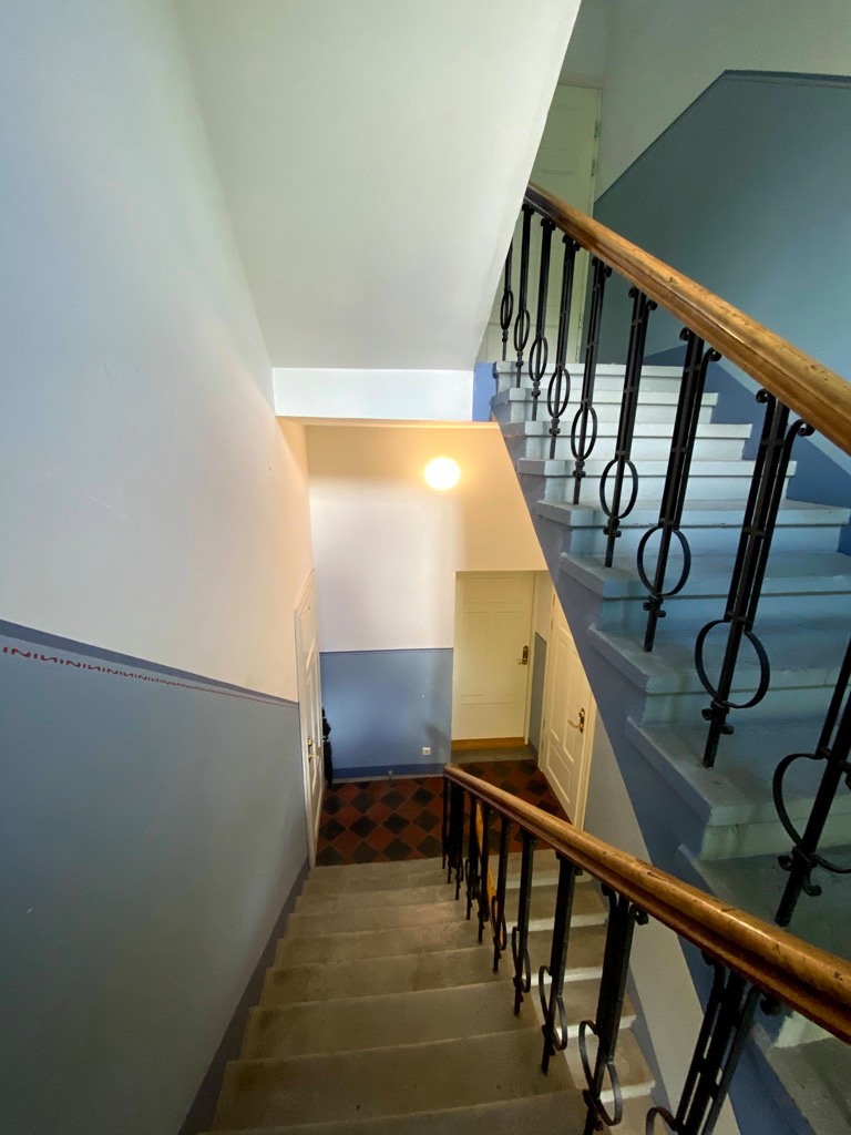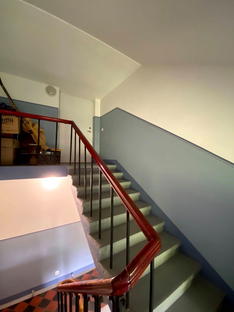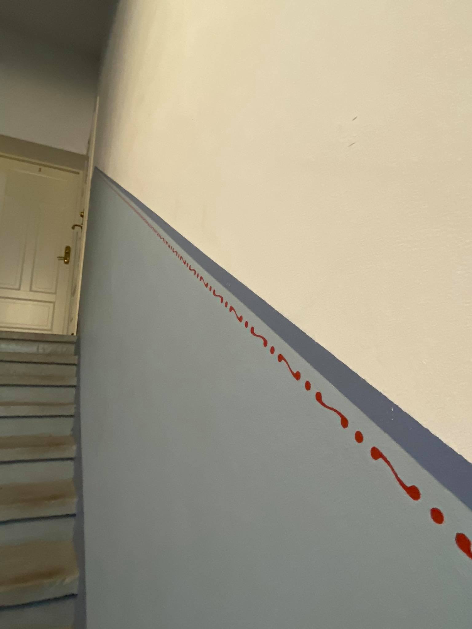 Trepikoja värvimine - Seinte, trepialuste ja lagede + akna/uksepalede värvimine 2x - lagi ja trepialused valged, sein kolmes toonis+triip keskele+ šablooni triip, trepi ääred portevärviga.