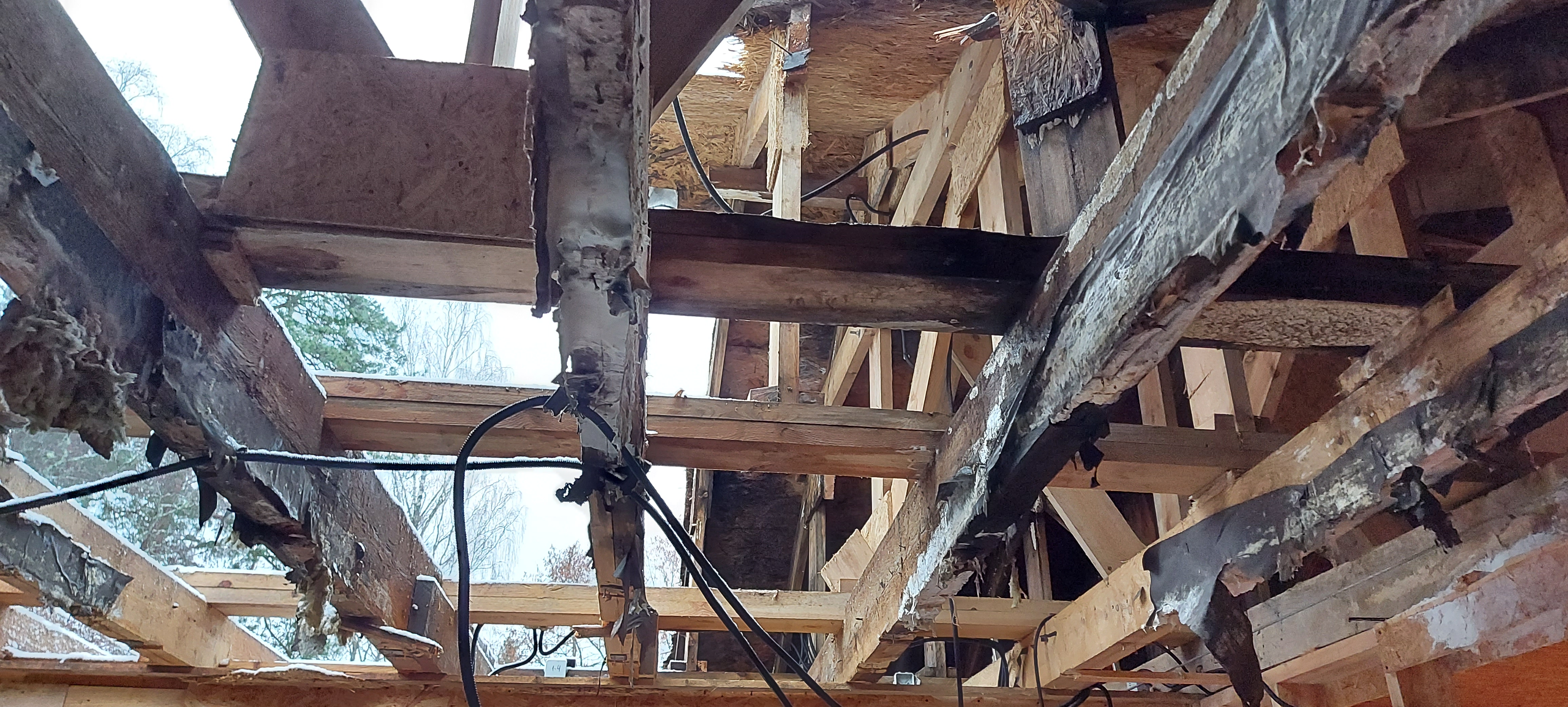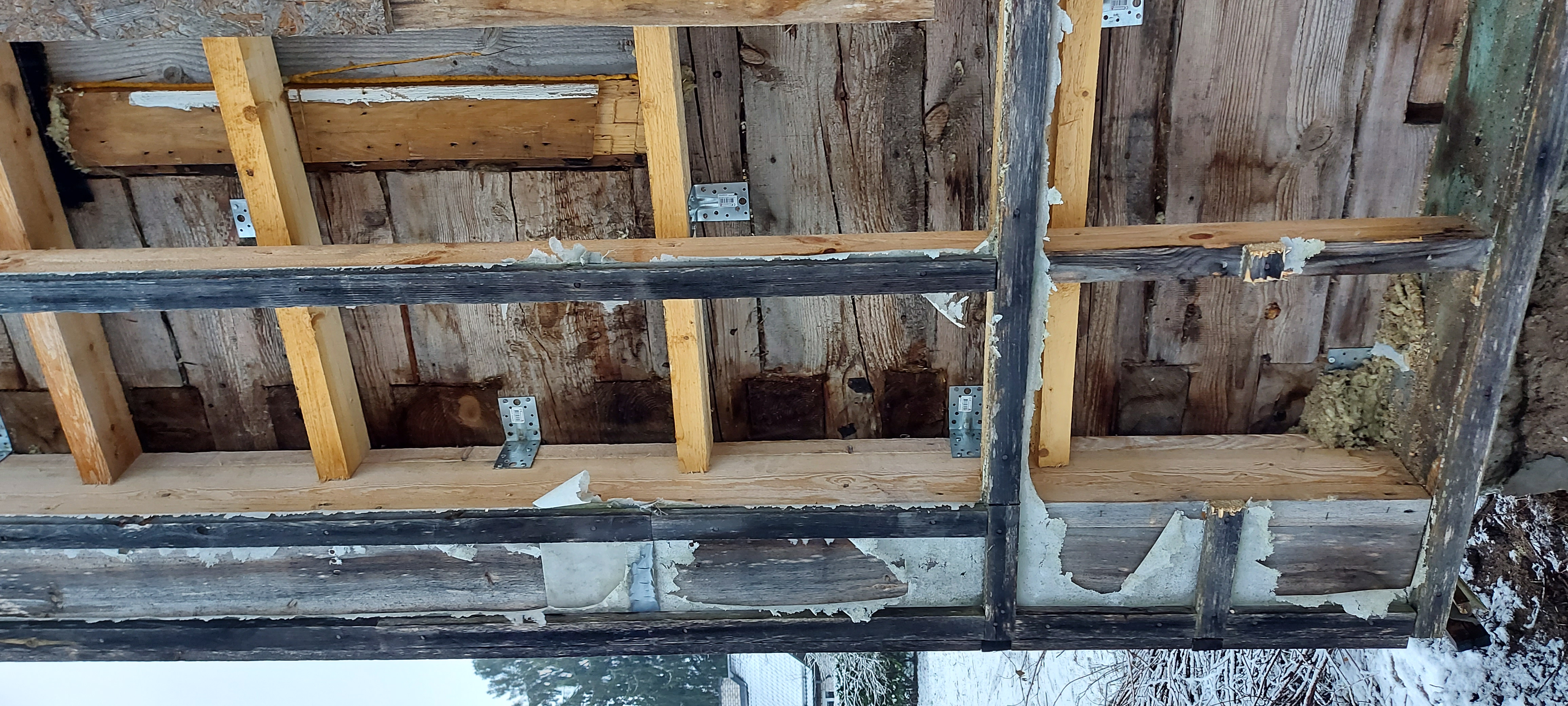 1 ja 2 korrus ehitatud 15 cm läbimõõduga palkidest. vahelaed ja katus prussidest. seintes ja katusel osaliselt osb plaadid. Esimese ja teise korruse põranda vahel soojustuseks kivivill.