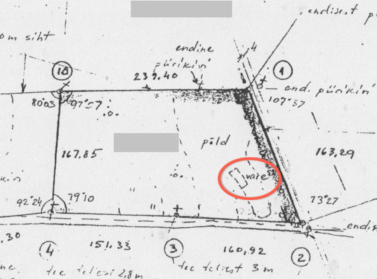 Pinnas paekruusane. Olemas vana šahtkaev, mis täis vajunud. Puurkaev tuleb sinna lähedale.