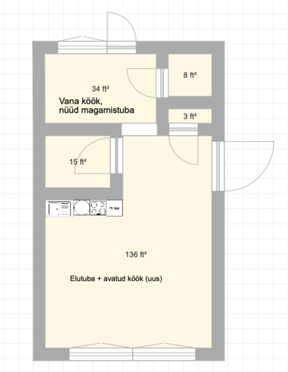 Pildil on näha, kus asus vana köök, millest nüüd on saanud magamistuba ning köök on toodud elutuppa ja on tekkinud elutuba koos avatud köögiga. Pildil olevad mõõdud on ebatäpsed.