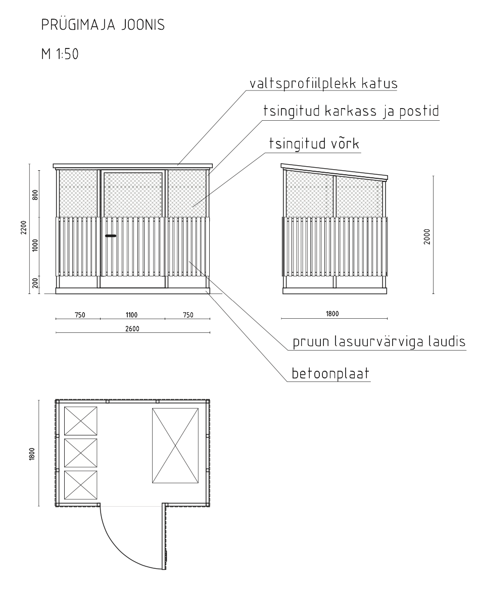 Klassikaline väiksem prügimaja korteriühistu maale 2600mm x 1800mm (kõrgus kaldega 2200mm-2000mm). Valtsprofiilplekk või eterniit katus, tsingitud karkass, postid ja võrk, lasuurvärviga laudis ja maas betoonplaadid/ tänavakivid.