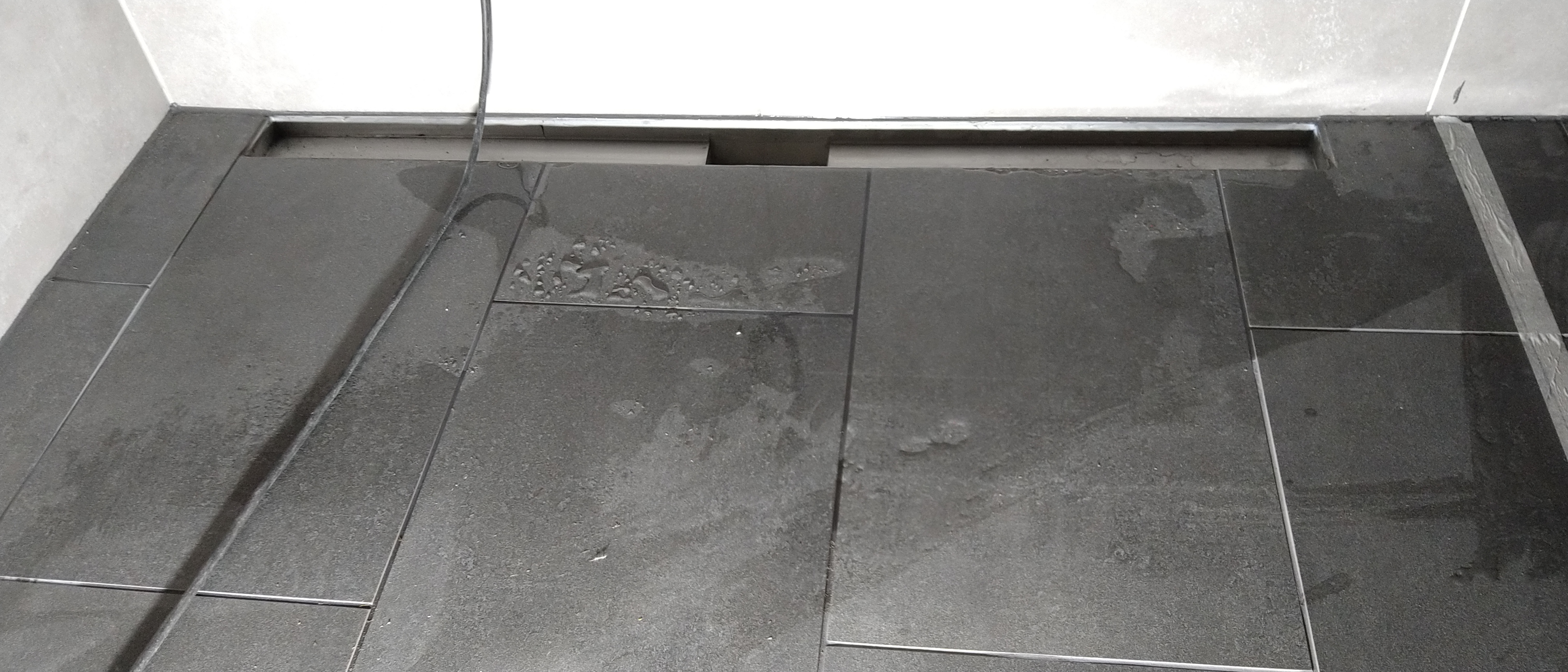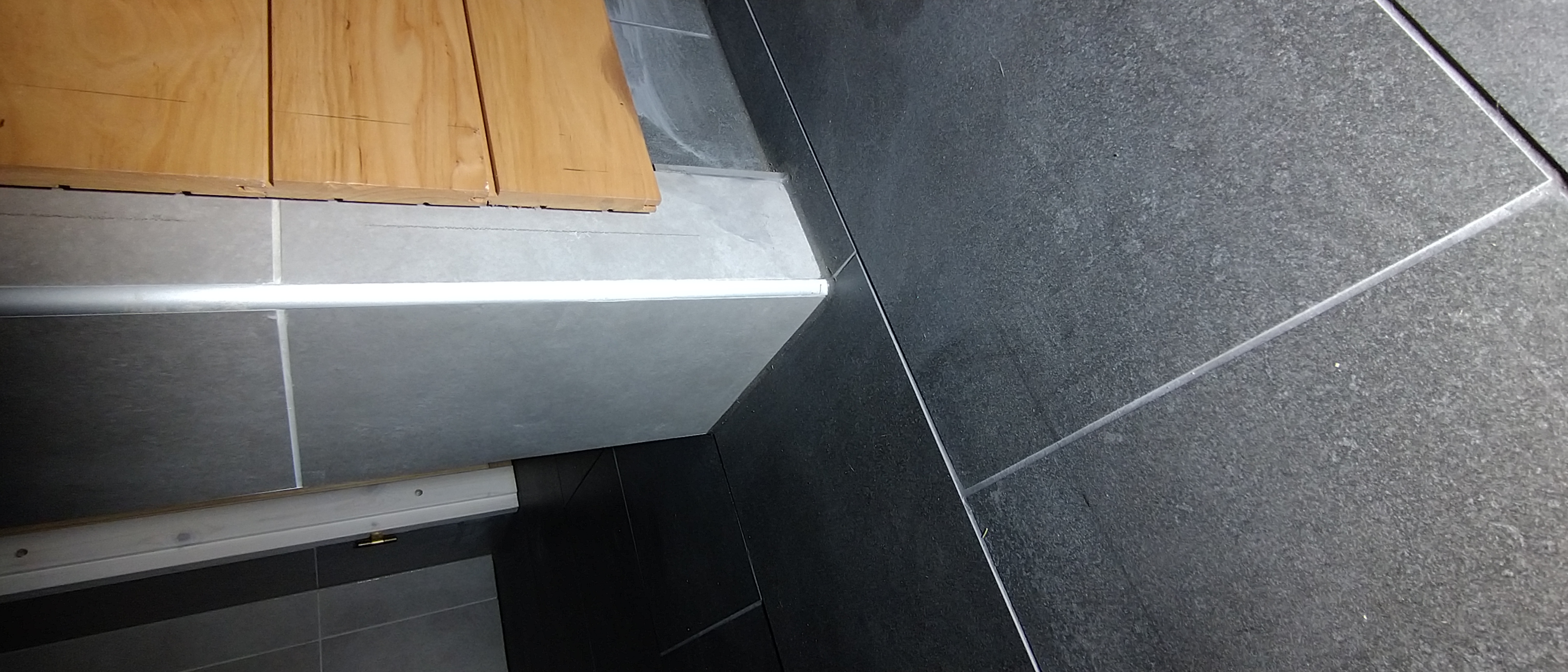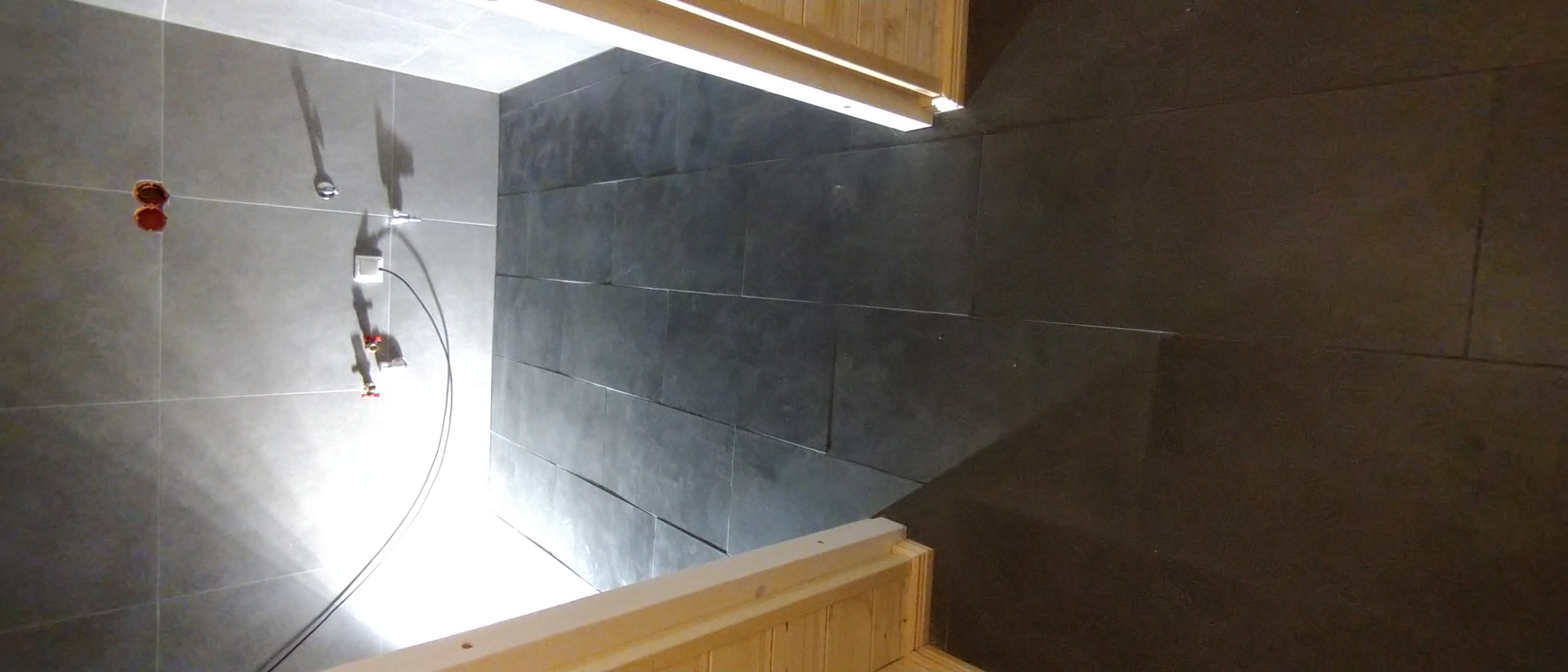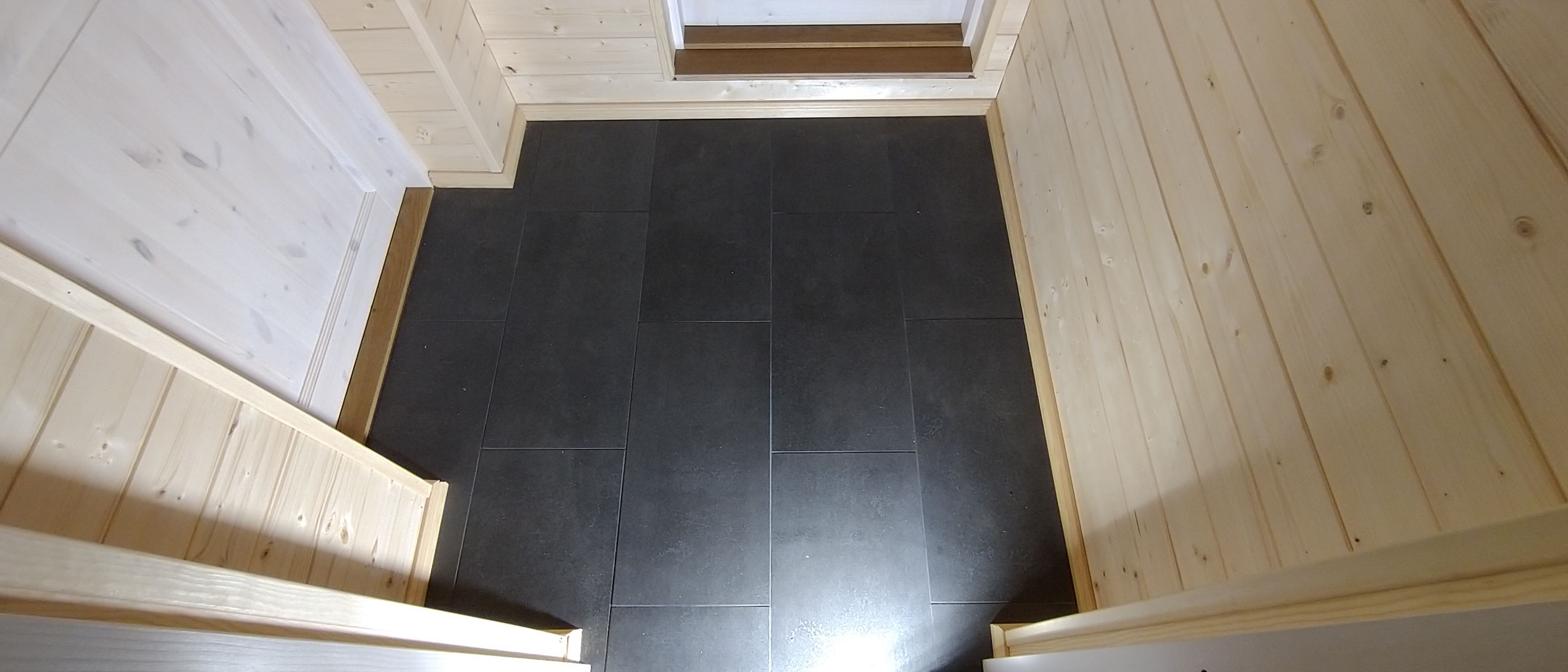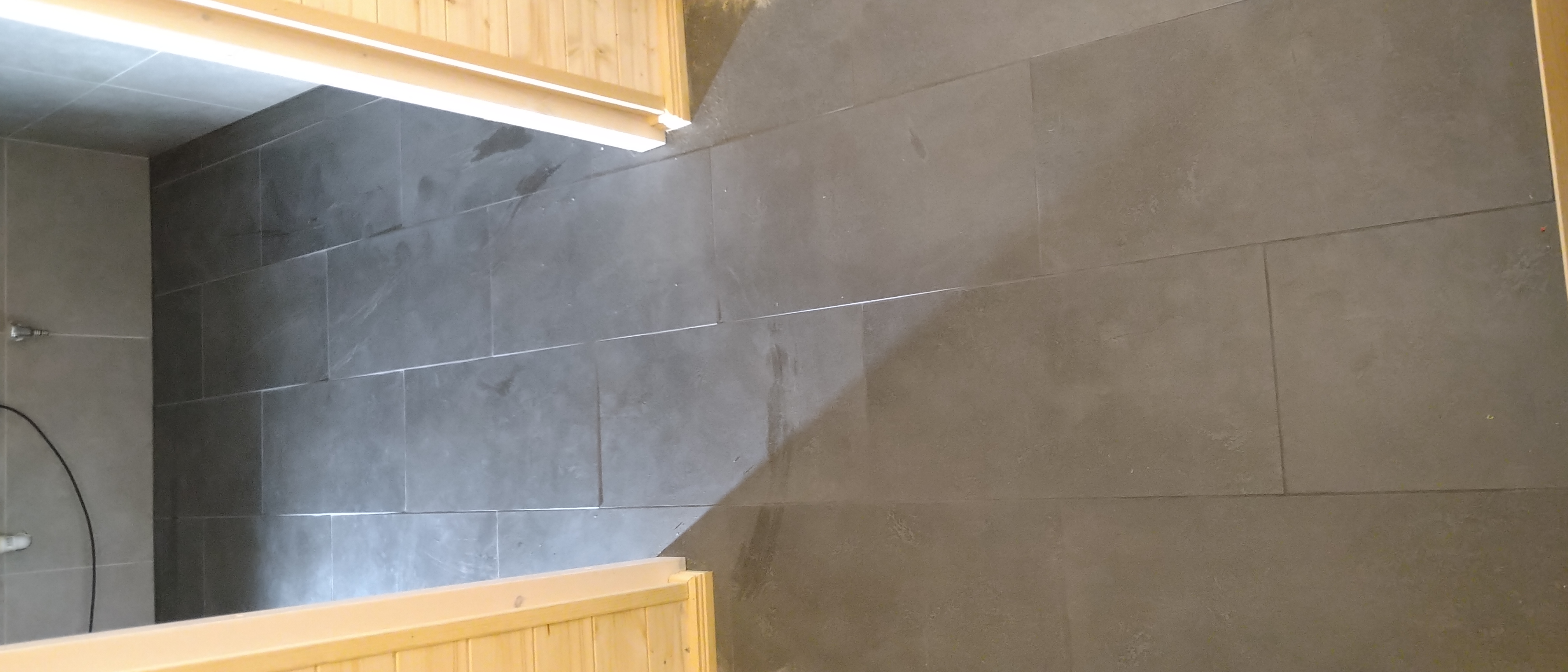Kuskil 10 m2 plaaditavat pinda. Leiliruumi ja vannitoa vahel tuleb klaassein hiljem. Koridoril sammuti sama põrand. Dushiruumis tellitud dushi eraldavad klaassein. Vesi peab voolama seina ääres olevasse trappi, ka leiliruumist.