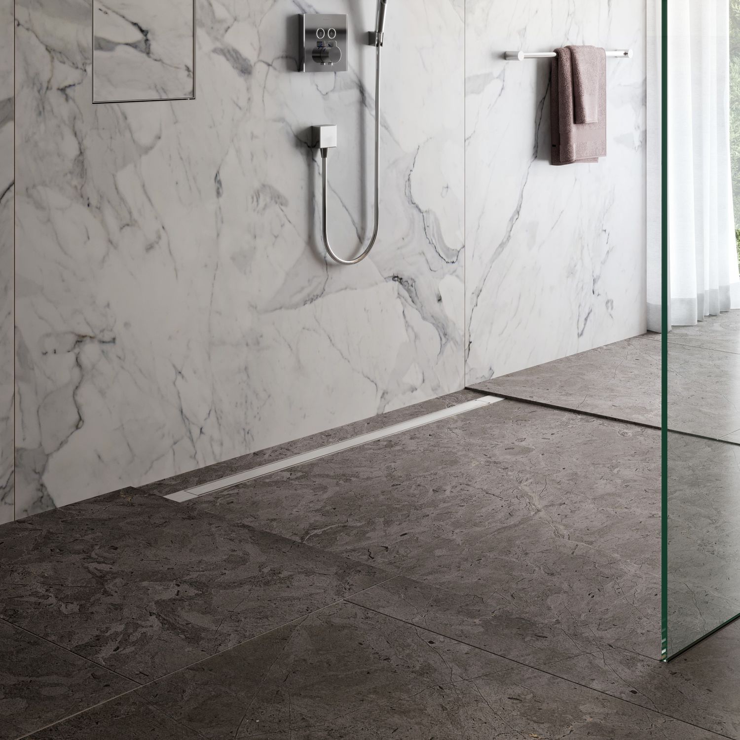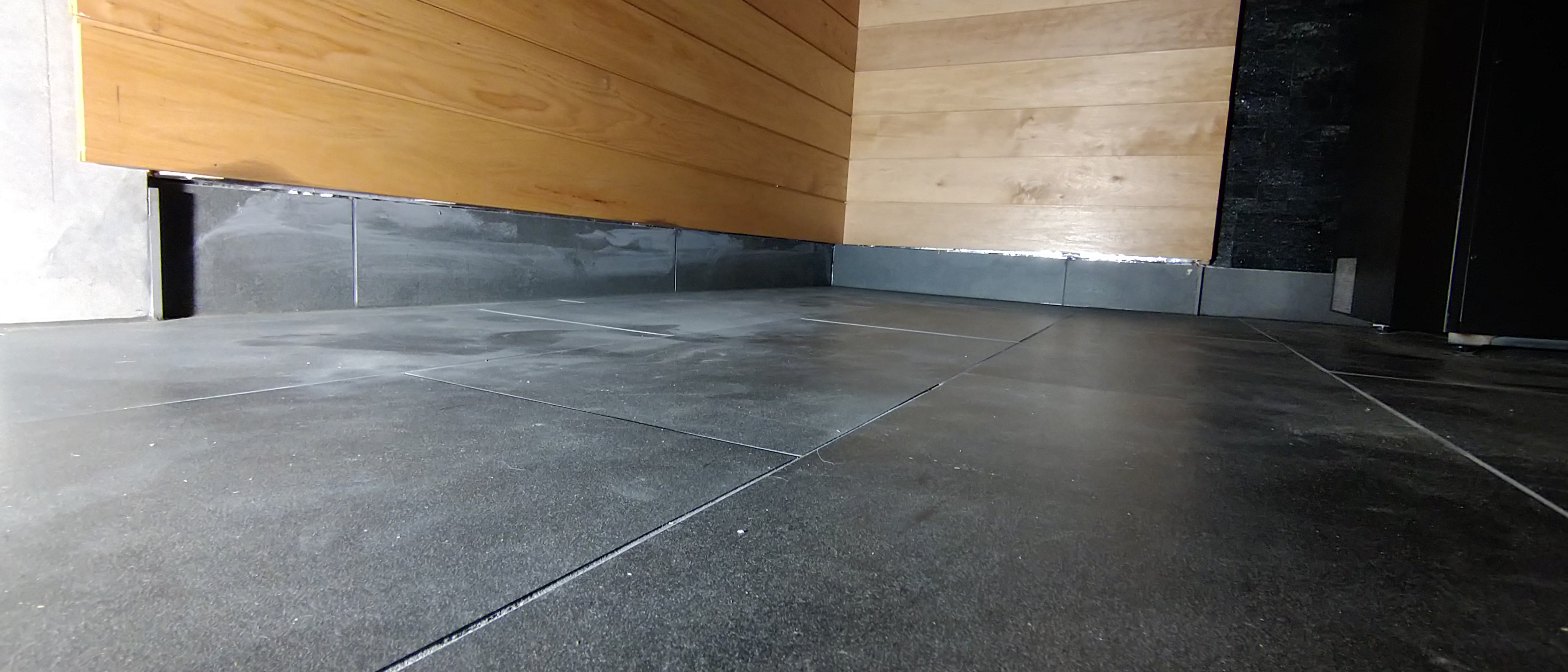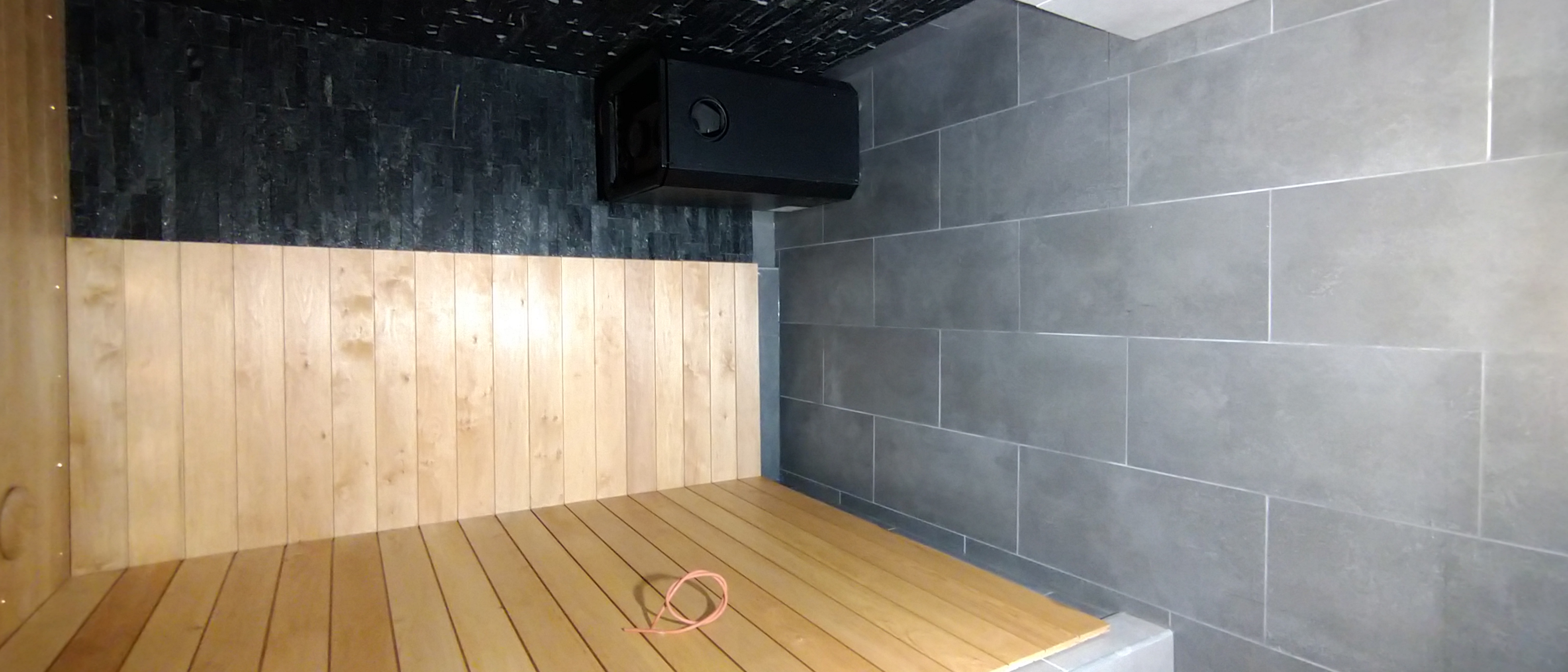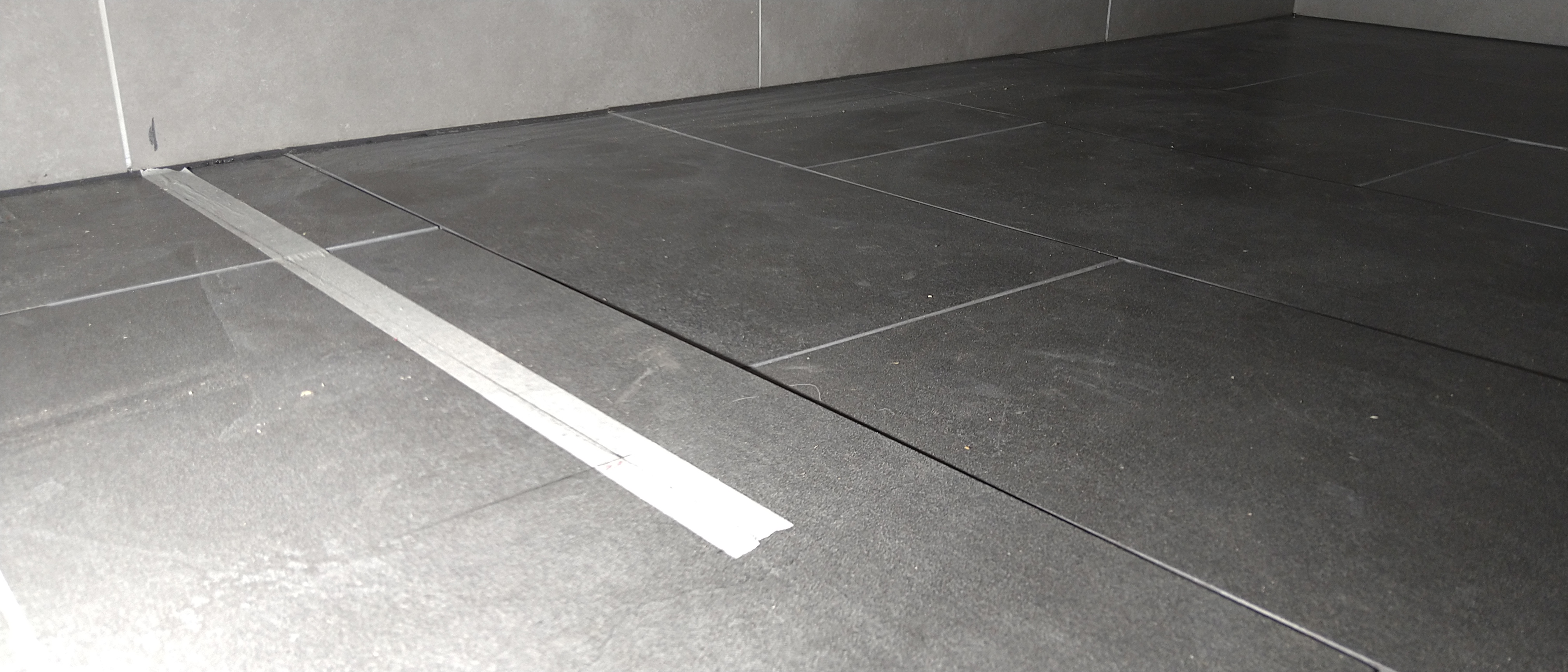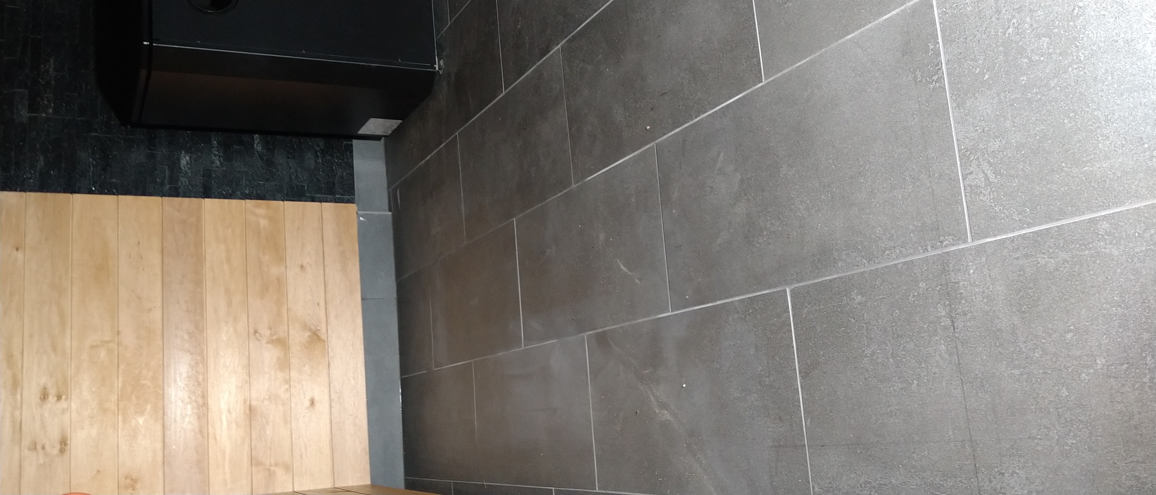 Kuskil 10 m2 plaaditavat pinda. Leiliruumi ja vannitoa vahel tuleb klaassein hiljem. Koridoril sammuti sama põrand. Dushiruumis tellitud dushi eraldavad klaassein. Vesi peab voolama seina ääres olevasse trappi, ka leiliruumist.
