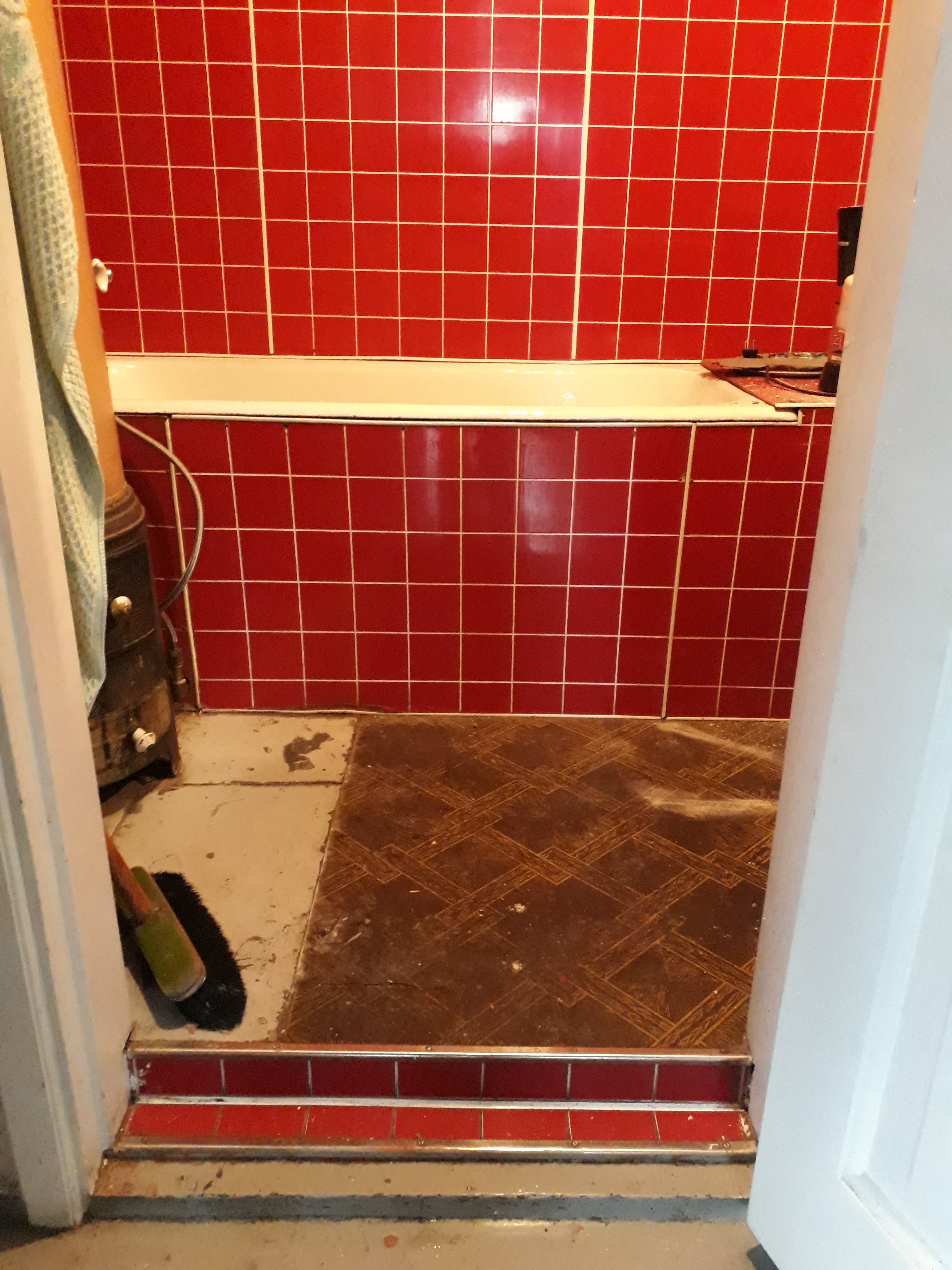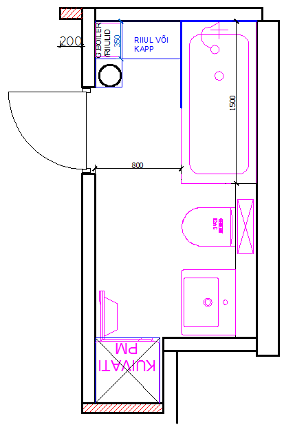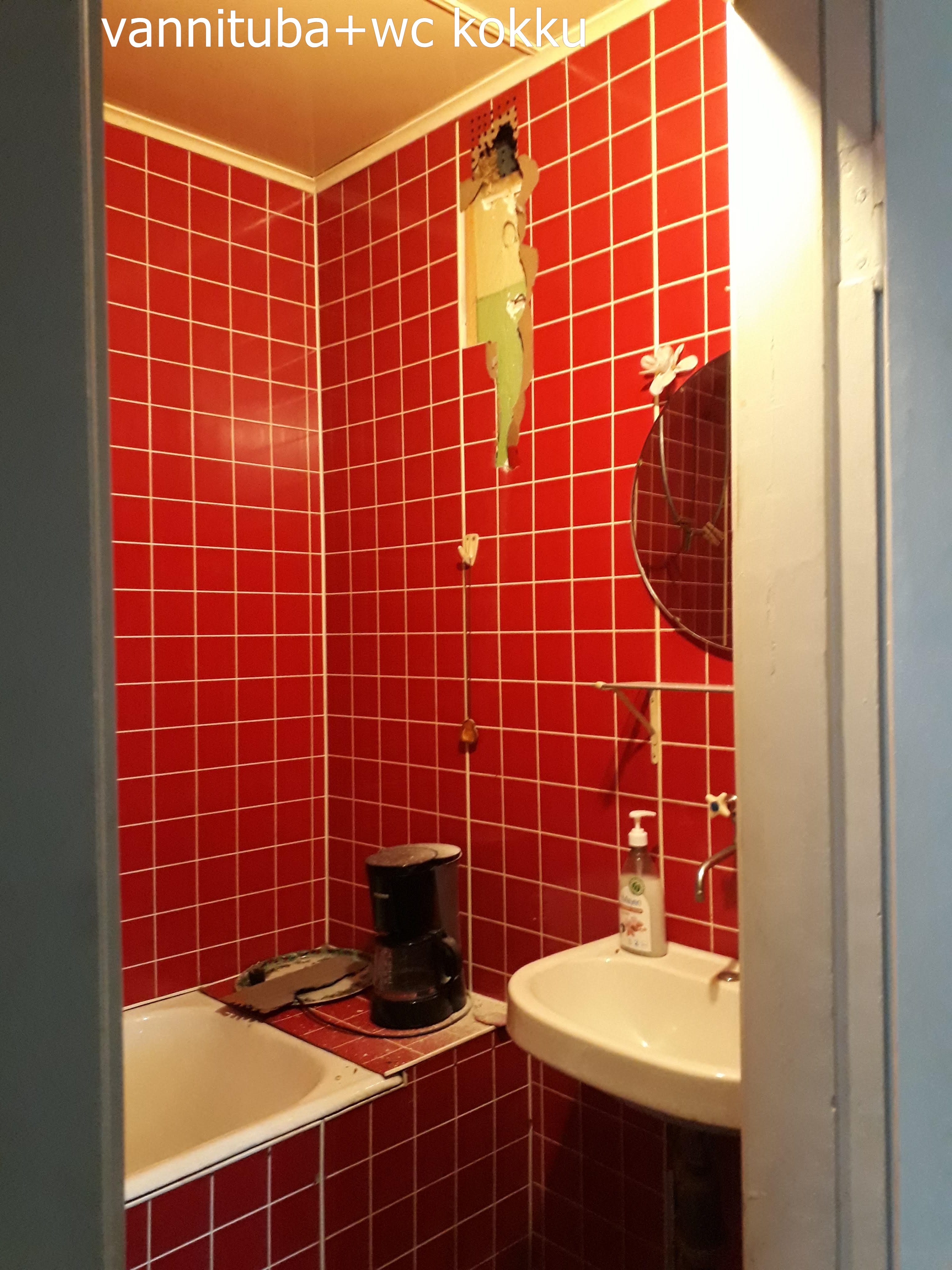 hetkel on eraldi, kuid soov kokku ehitada. Puitlae paigaldus. Põranda- ja seinaplaadid. Seinapealne wc-pott. Vann jm santehnika paigaldus. Pesumasina paigaldus niši, mis tekib juurde esikugarderoobi ruumi arvelt. Soe vesi tuleb köögist, gaasikatlast. Torutööd (kööki nõudepesumasina ja valamu valmidus)