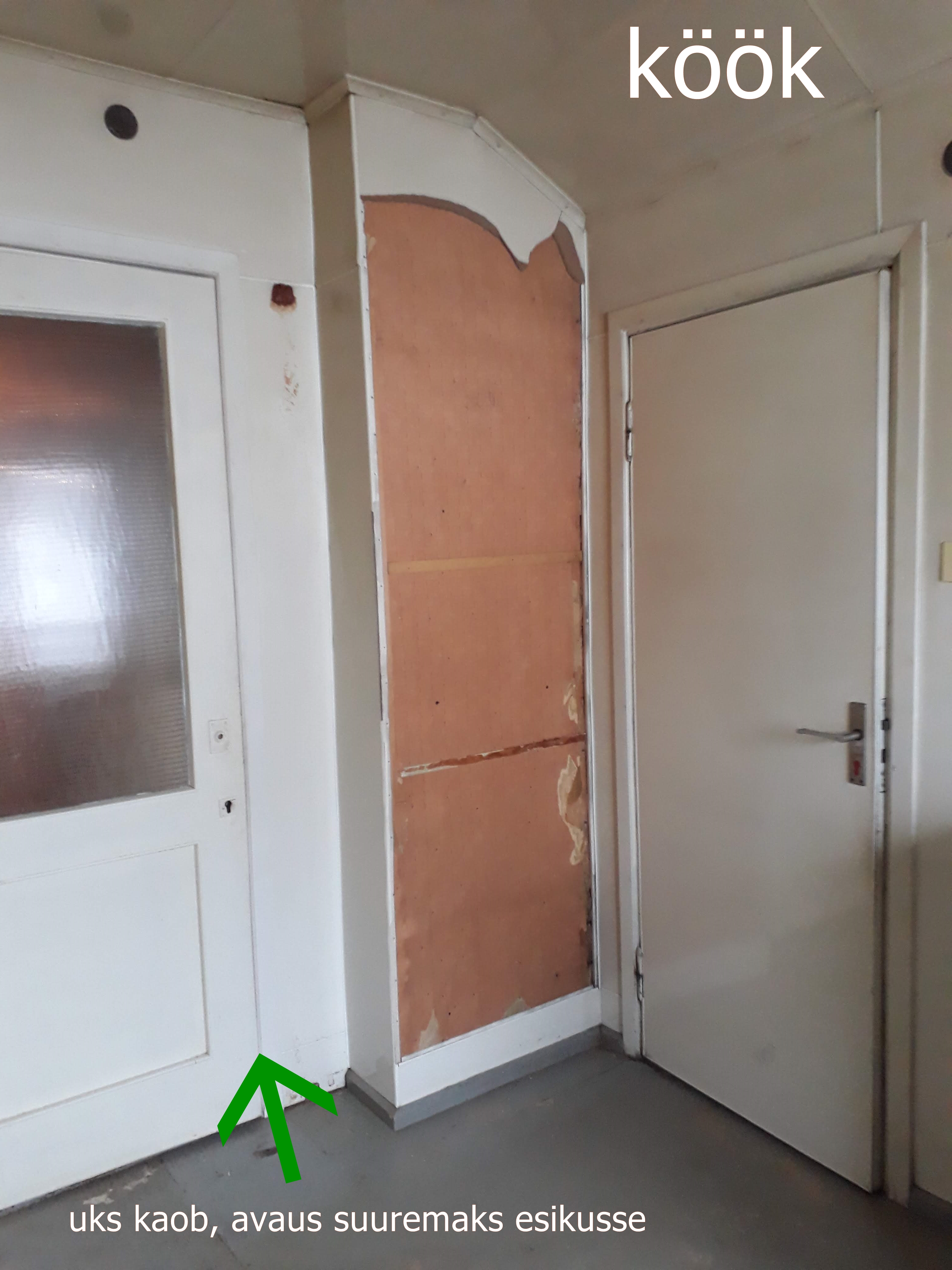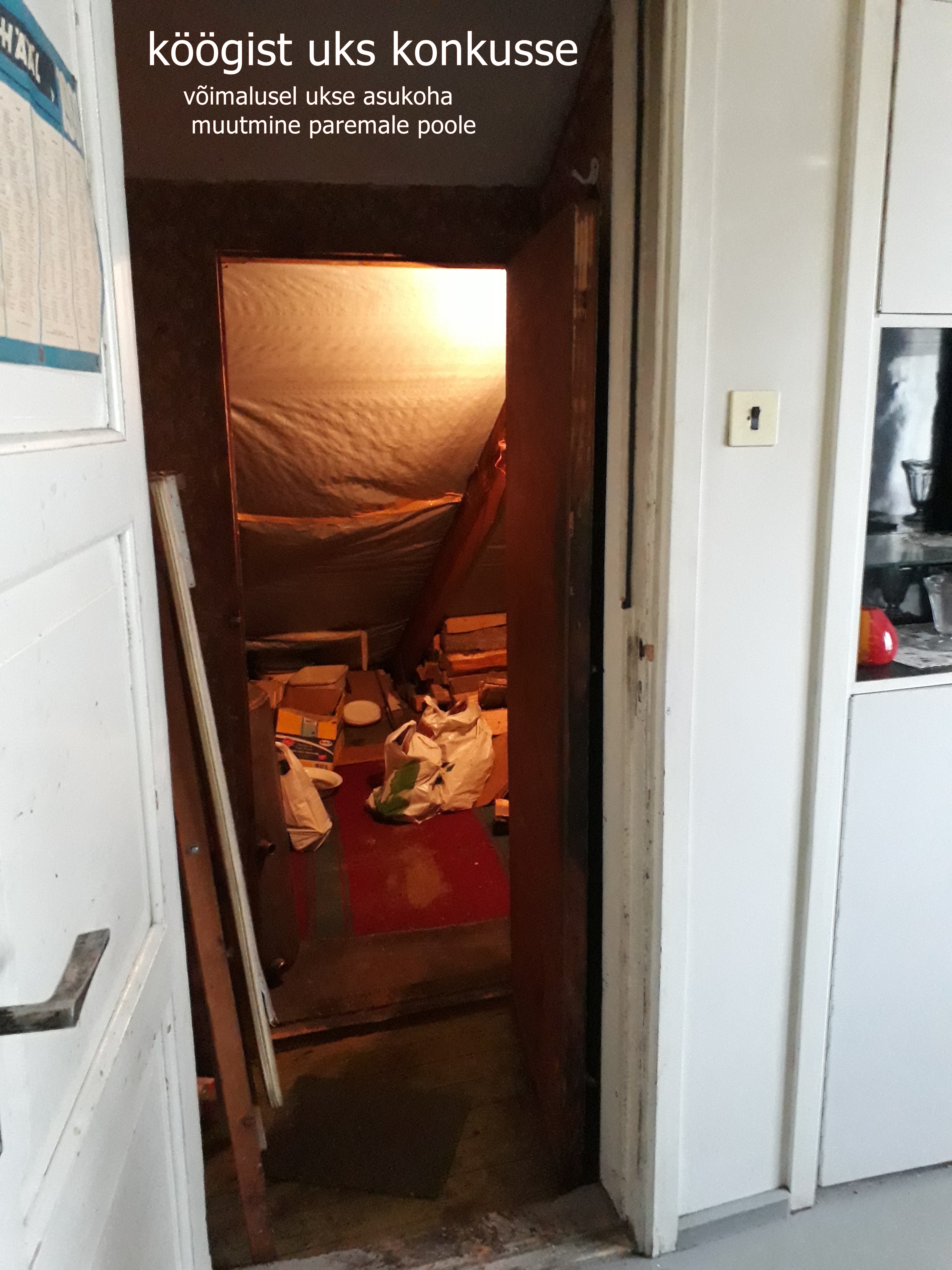 köögist viib uks edasi väikesesse katusealusesse ruumi. See oleks vaja soojustada ja teha siseviimistlus, elektritööd nagu mujalgi. Ukseava tõsta teise kohta (ust ette ei tule). Praegune ukseava sulgeda.