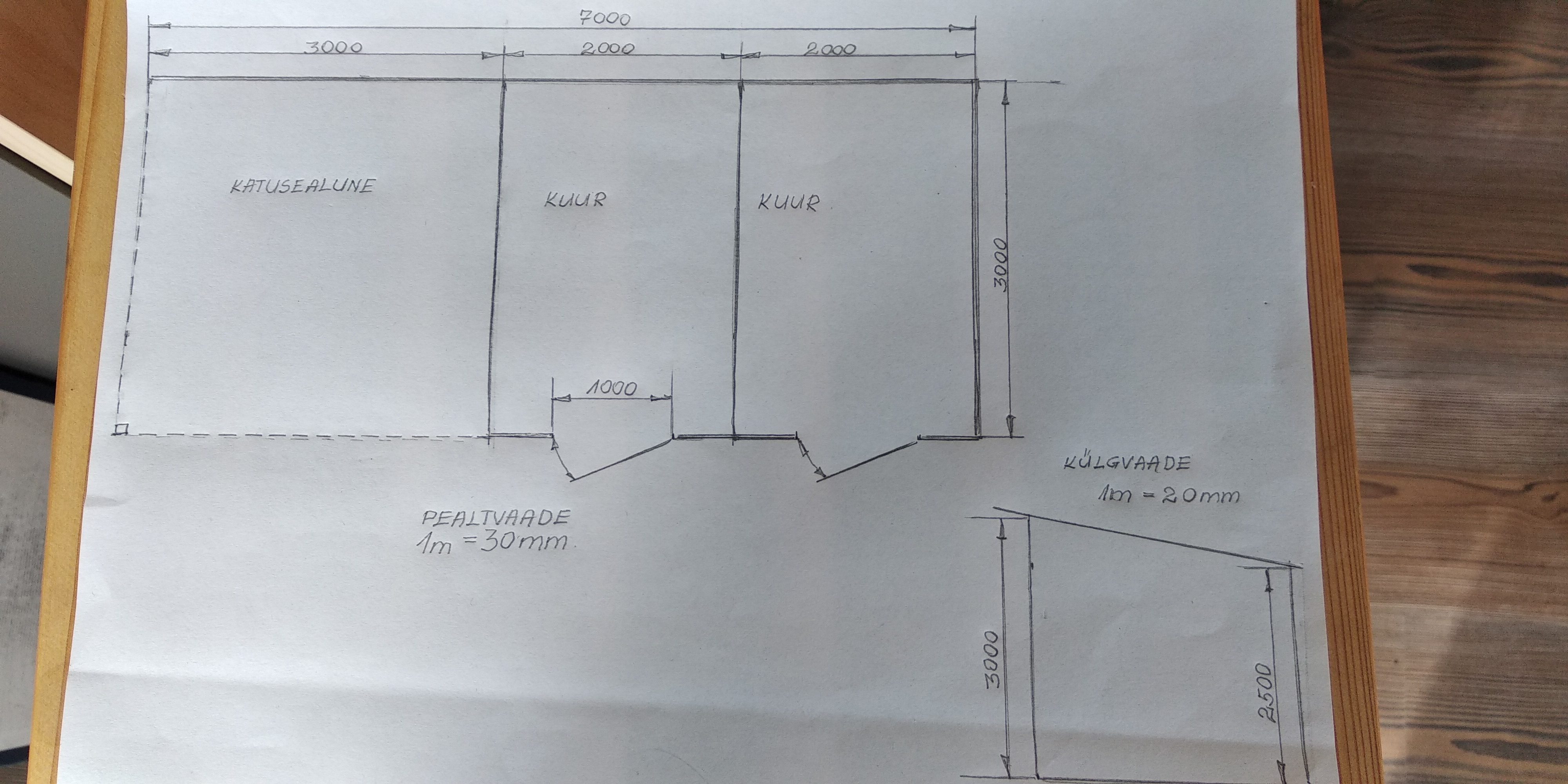 Kuur koosneb 3-st osast: puukuur 2x3 m, tööriistakuur 2x3m ja katusealune 3x3m ( kahest küljest avatud). Ehitus võiks olla paigaldatud postvundamendile, materjaliks puit ja plekist kaldkatusega.