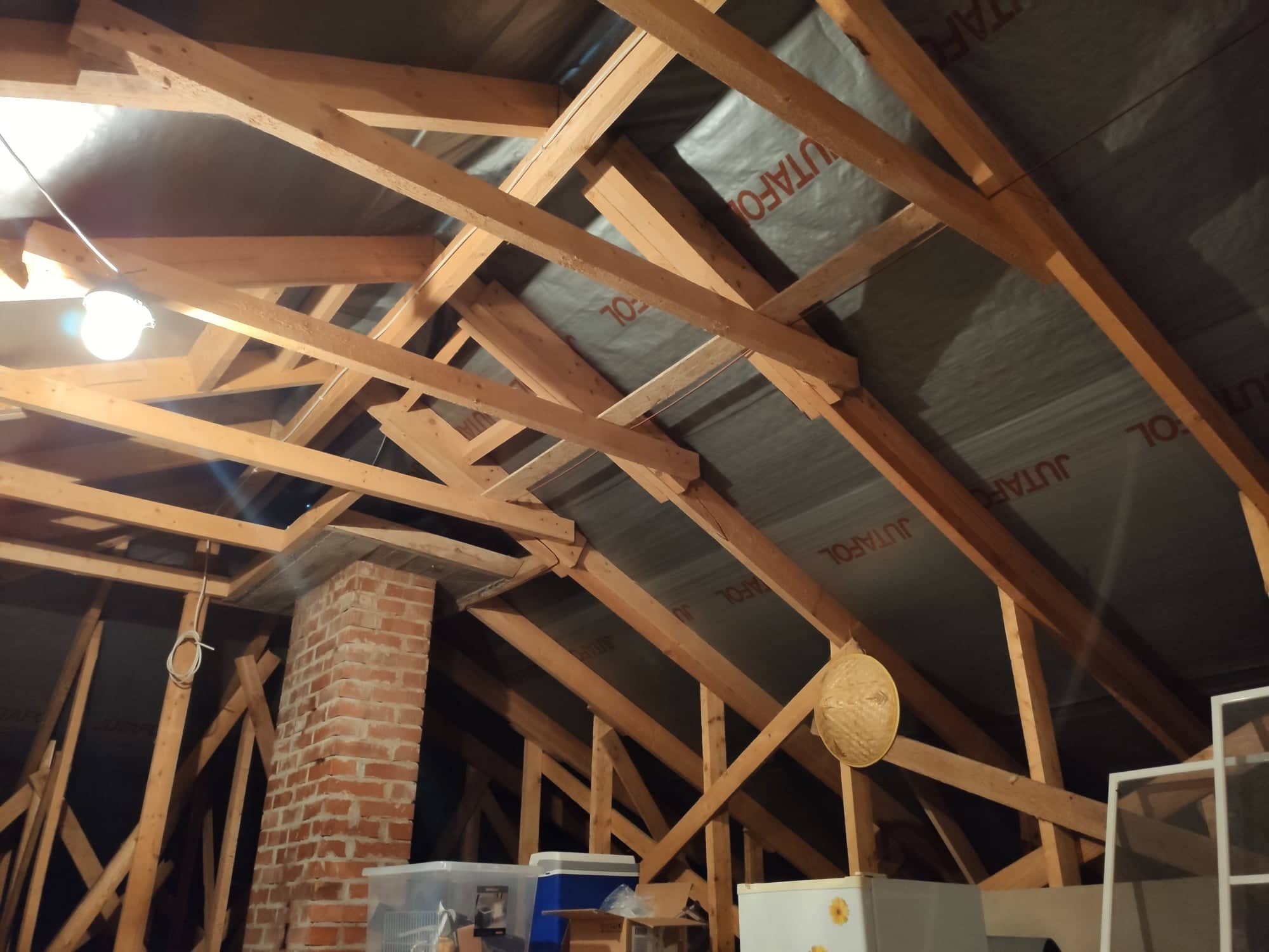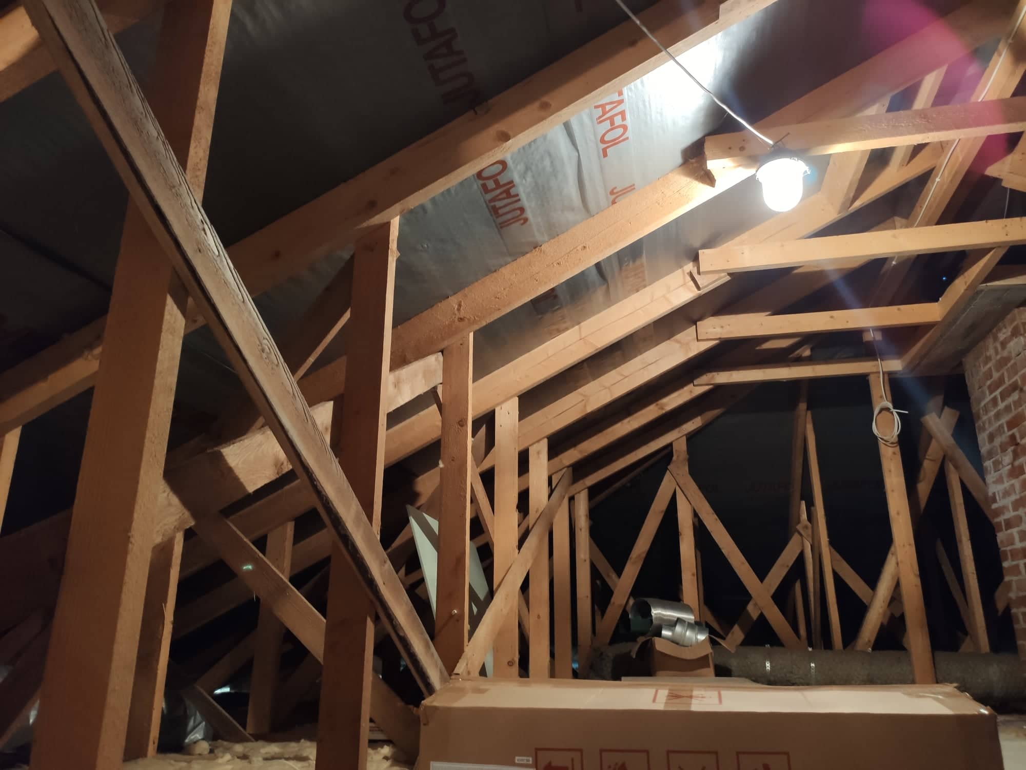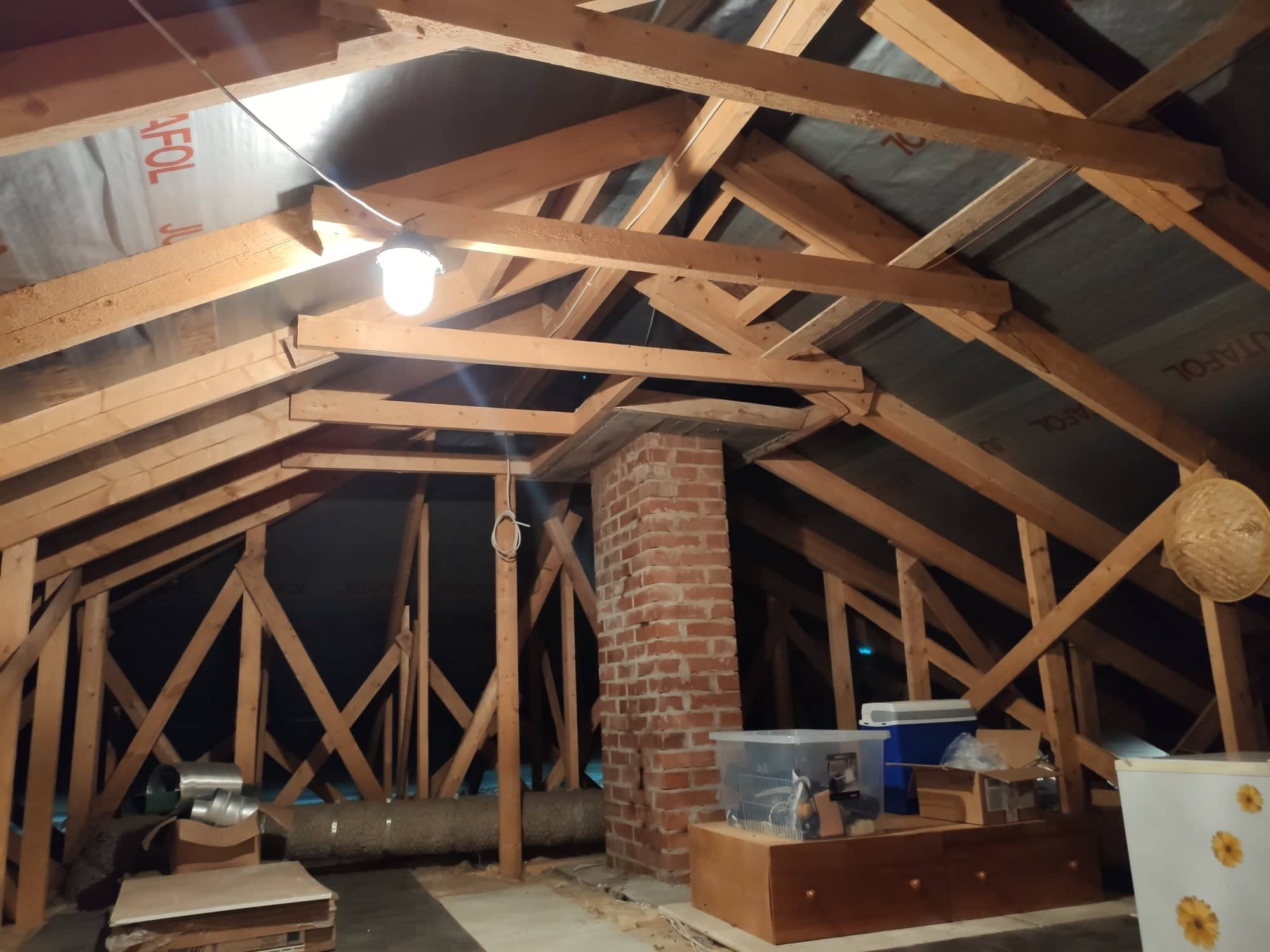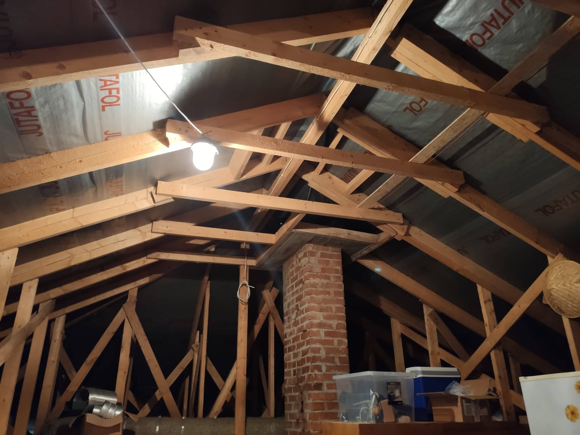 Pildide peal on näha, mis olukord on hetkel pööningul. Elamu pind on majal 97m2, katus on 4 osas kaldega. Katuse kõrgus on kuskil 257cm kõrge (lisasin jooniseid). Põrand on soojustatud ja peal on pannud vanad MDF plaadid. Katuse soojendatav pindala on umbes 150m2. Katus on plekkist. Sarikate vahe kuskil 0,7m. Sarikad ise 150x50mm.