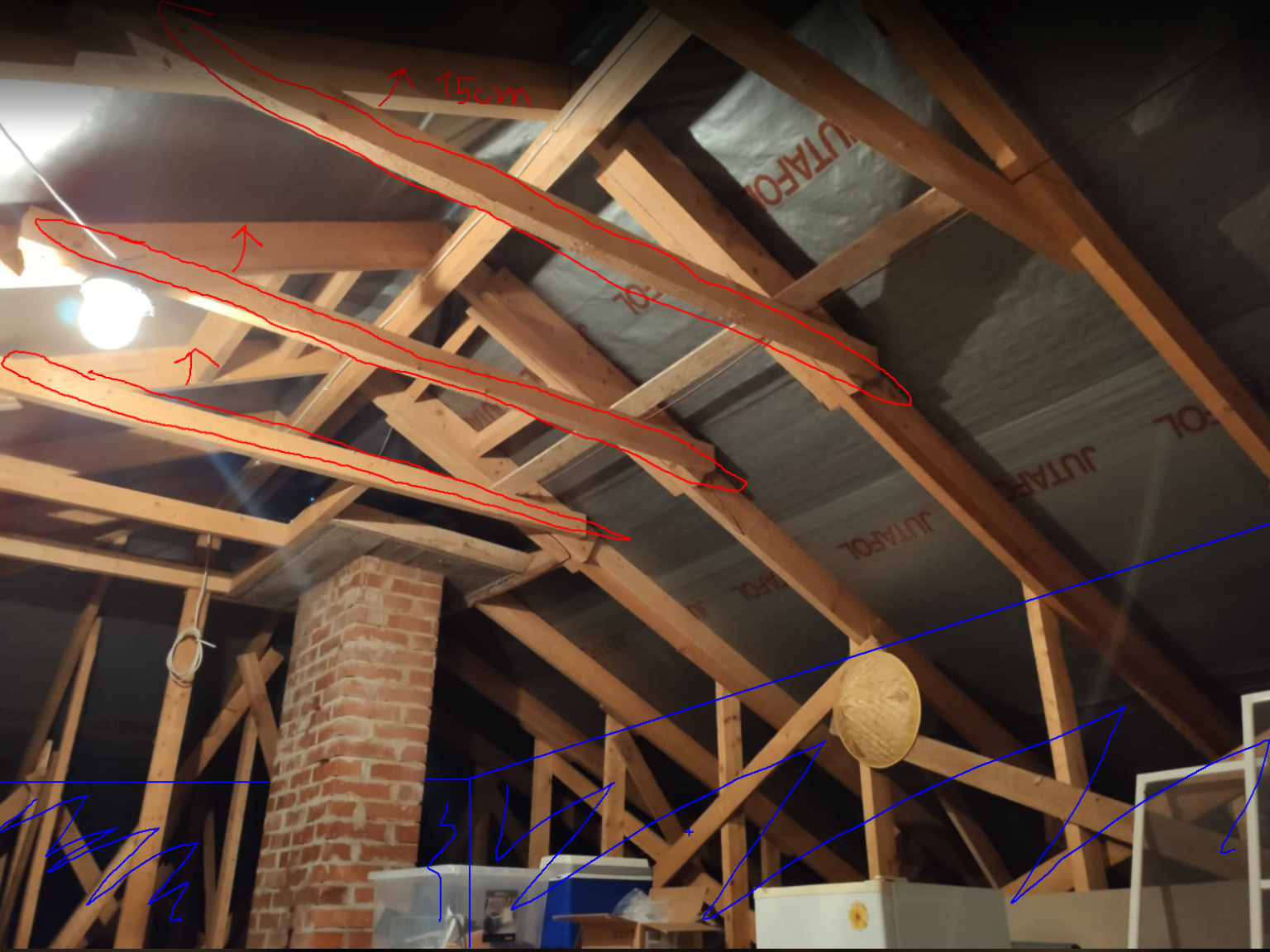 4. Ühe pildi peal sinisega on näidatu osa, kuhu tuleks panna OSB seinu (ilmselt mõne luugiga, mis lubaks seina taha midagi panna või vajadusel hooldust või muu ligipääsu jaoks), et tekkiks pööningule ruum (seinte taha pole põrandat vaja). Selle ruumi suuruseks mu jämeda arvuruse järgi tuleks kuskil 16m2.