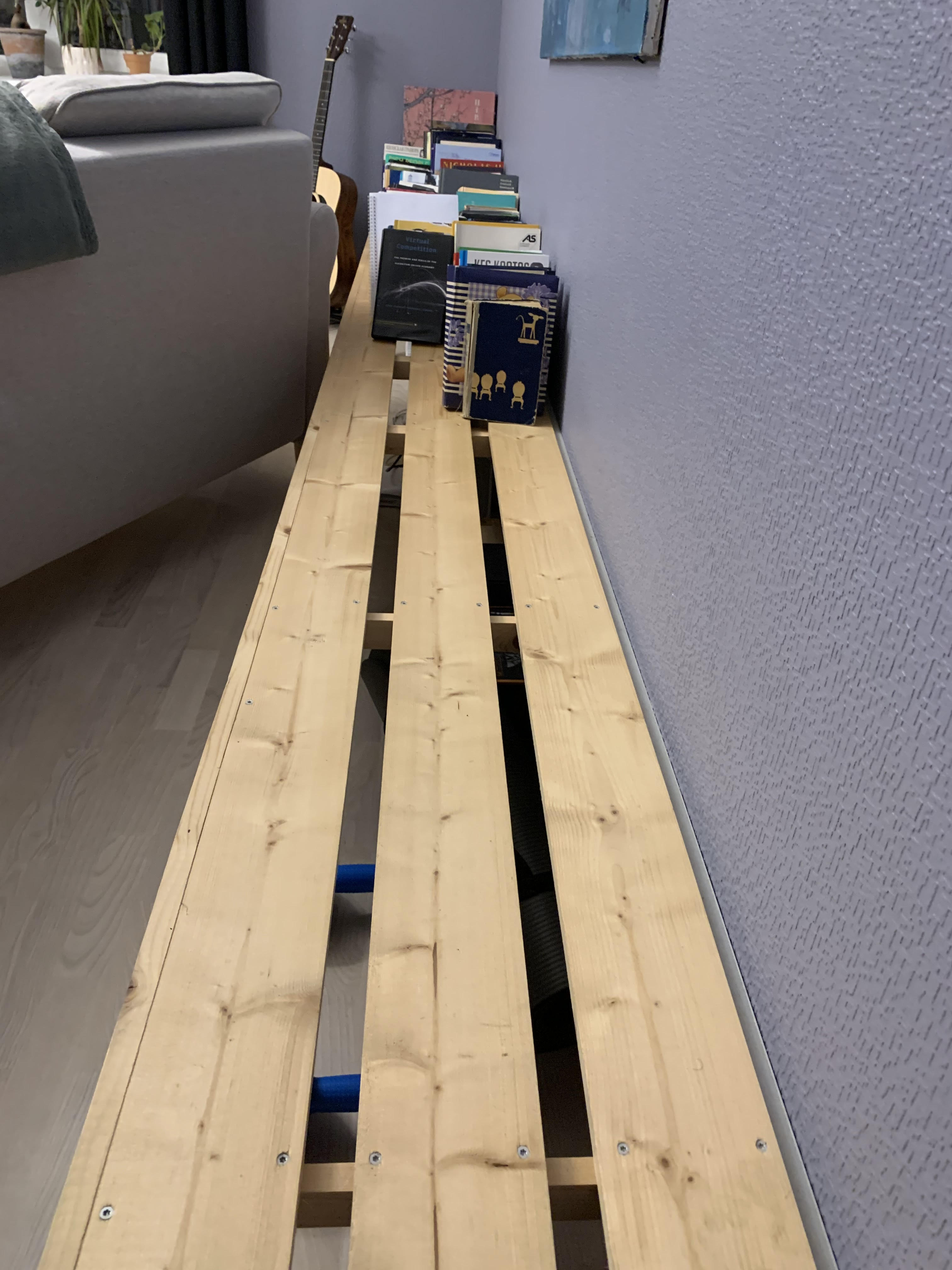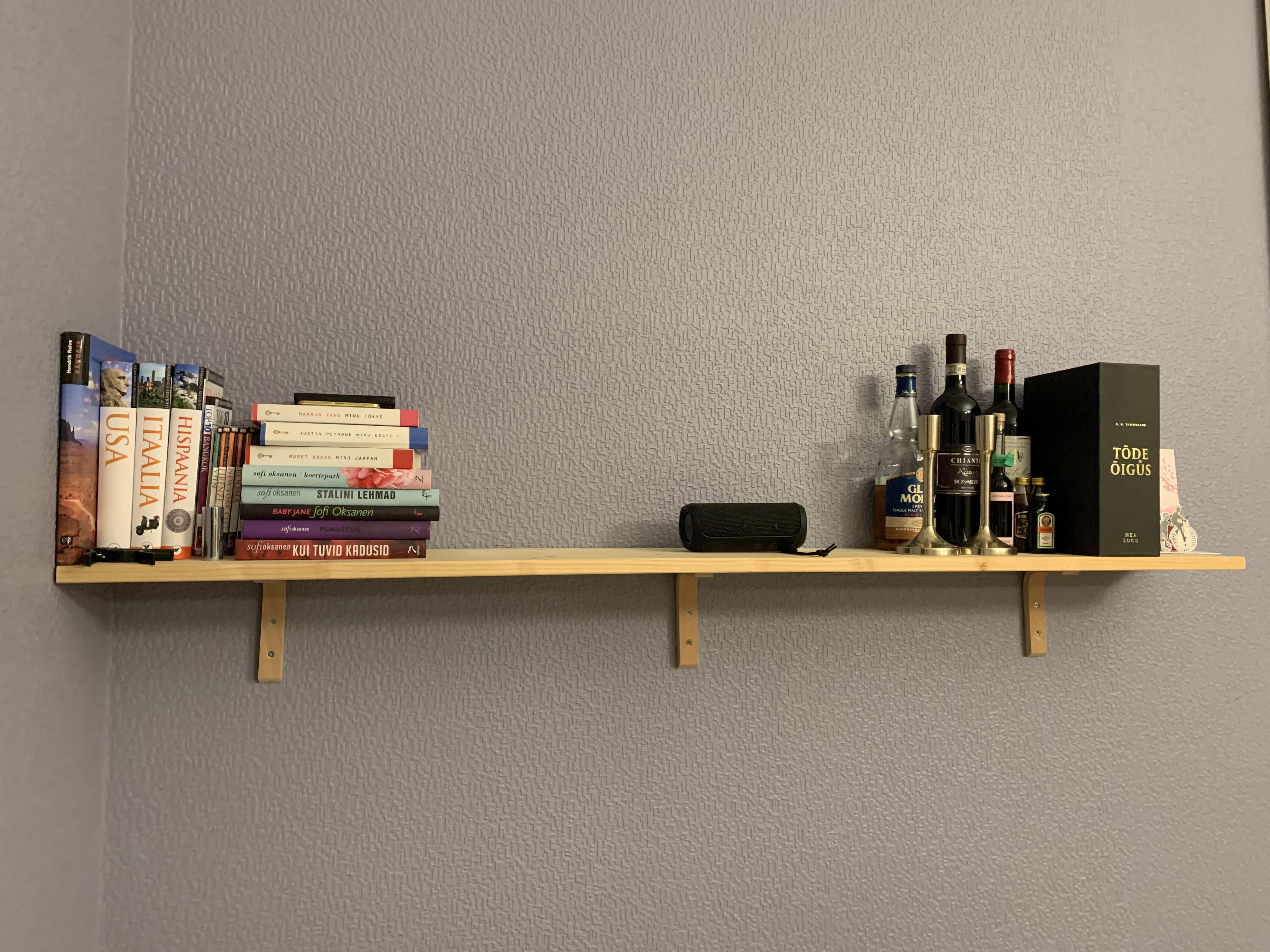 Sein tehtud kipsplaadiga. Seinal värvitav tapeet, Seina külge kinnitatud laiupidi LED-tuledega pink. Samuti seina külge kinnitatud kaks riiulit. Vaja on pink ja riiulid seinalt eemaldada. Ei ole teada, kas seina on võimalik niimoodi taastada, et tapeet üle värvida (eeldatavasti mitte). Seega oleks vaja sein parandada ja lisada uus tapeet (eelistatavalt ka värvitav, sama tooni ülejäänud toaga).