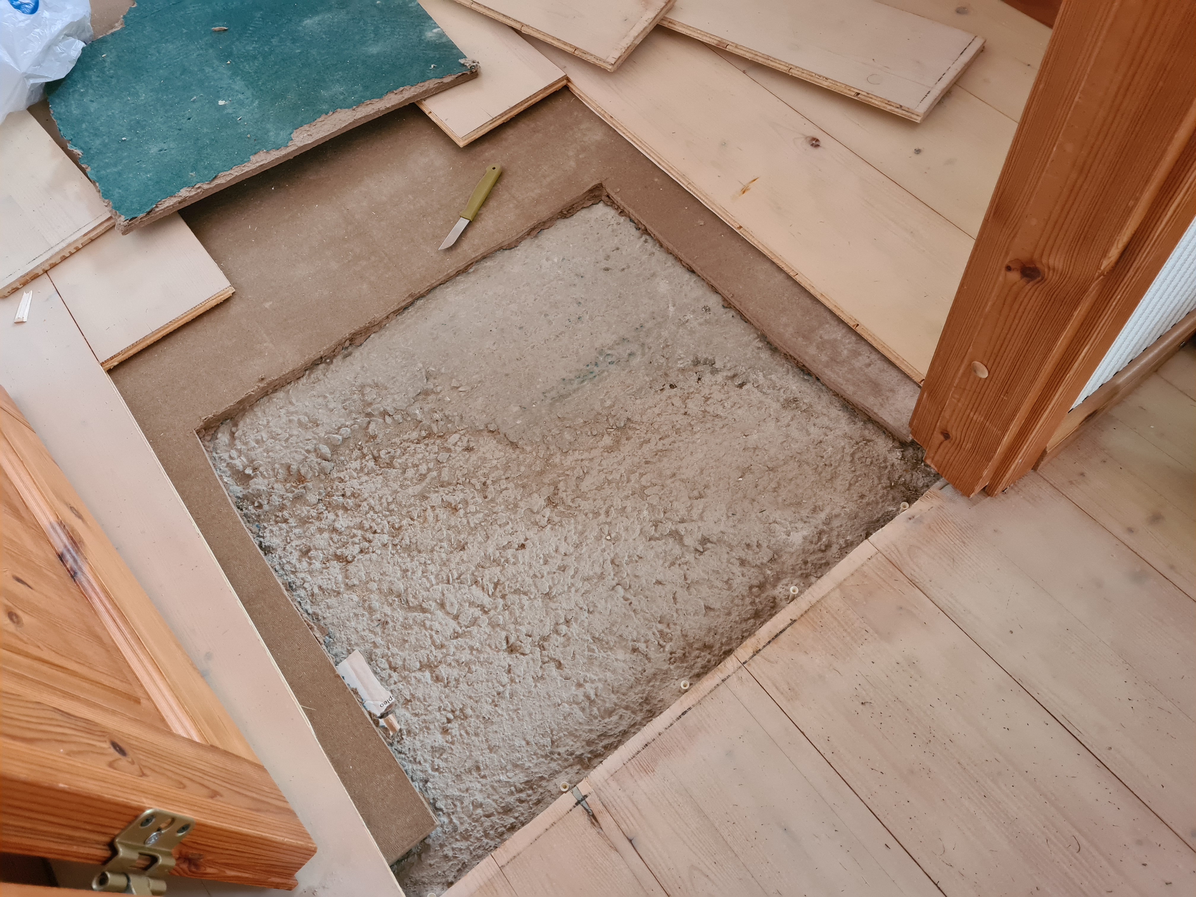Maja esimesel korrusel 65ruutu (suur elutuba-köök ja kabinet). Kõik tööd saab ühe korraga teha st maja alumise korruse saab 100% puhtaks teha (ka köök läheb välja). Vana põranda eemaldame ise. Vaja olemasoleva betooni tasandamine, sest pole loodis ja on väga poorne. Ilmselt siis ise valguva seguga üle valada ja lihvida vm. Pilt lahti võetud põrandast.
