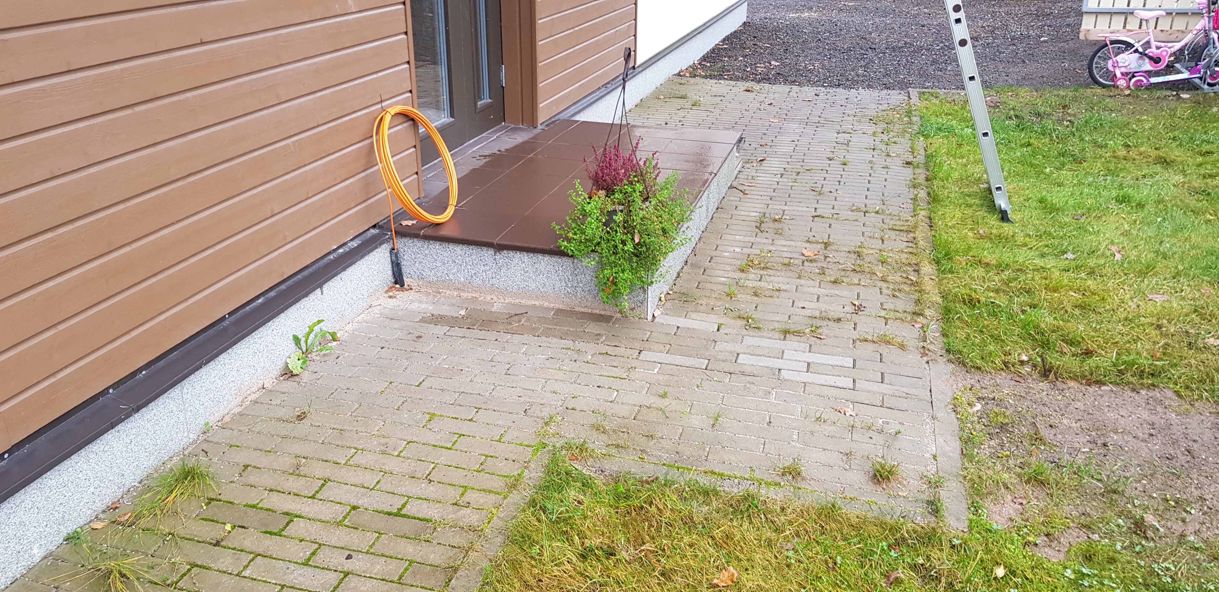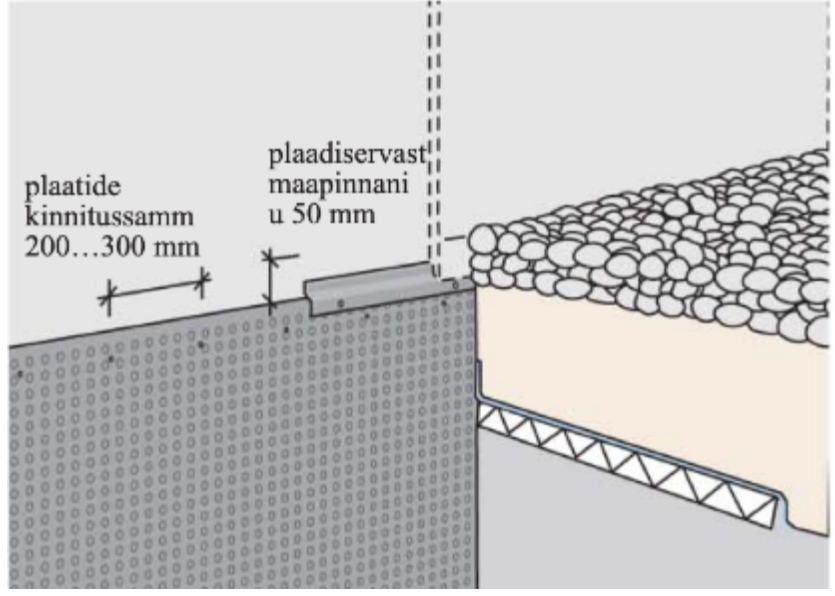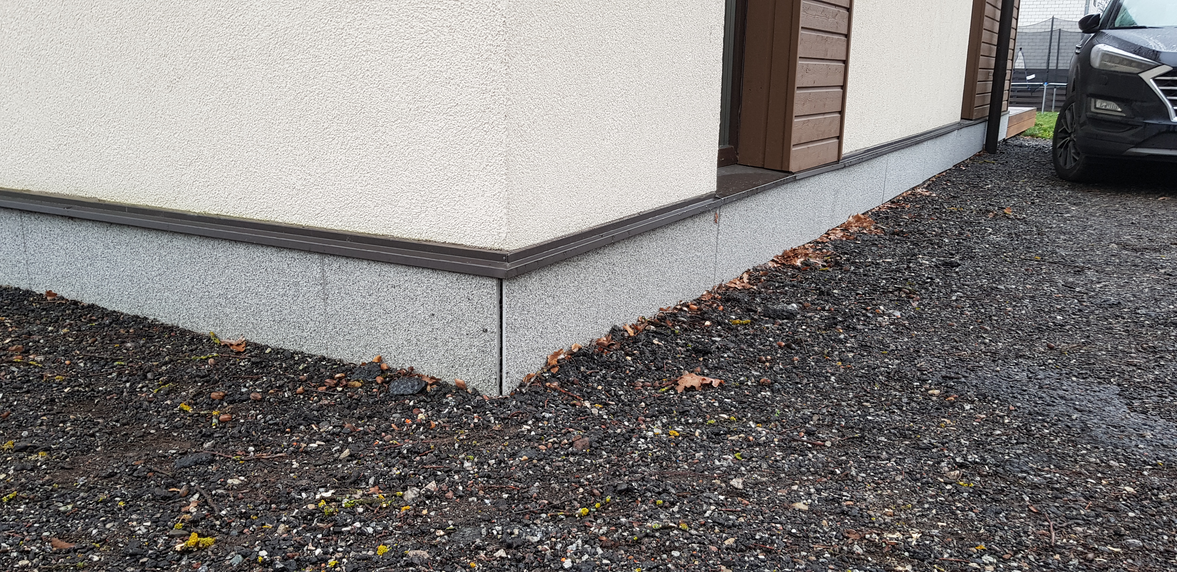 Maja sokli äär on vaja labida sügavuselt lahti kaevata ja paigaldada vundamendi katteliist EPS ja pinnasekaitse peale, et juhtida pinnasevesi eemale . Joonisel näidatud lahendus. Avada tuleb unikivi, terrassi lauad maja hoovis ning tagasitäide.