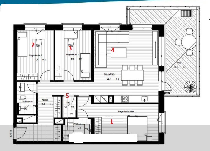 5) kahes magamistoas (joonisel 1 ja 3) on laevalgustid, mis on vaja kas eemaldada töö ajaks või kinni katta. Koridoris kohtvalgustid lae sees.