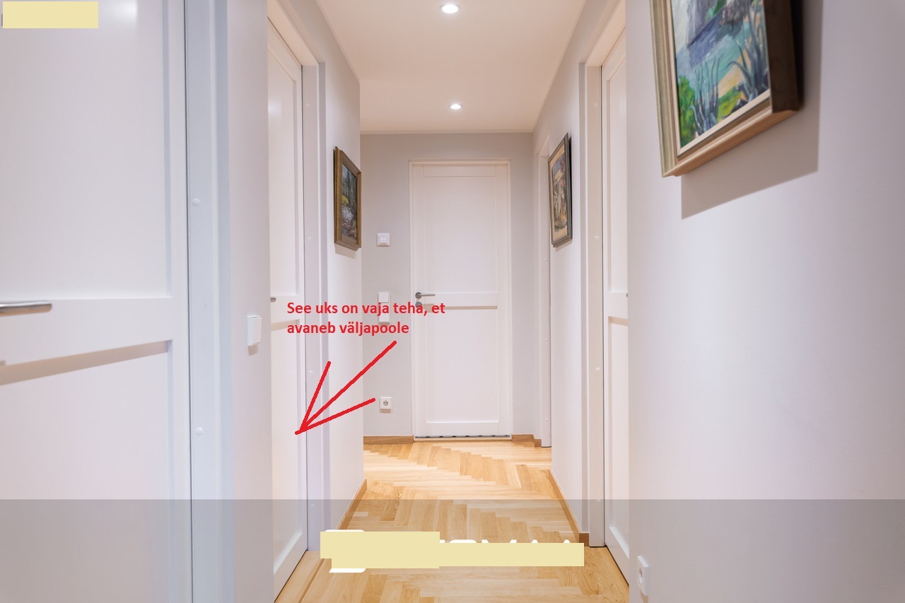 6) majapidamisruumi ukse eemaldamine ja teist pidi asetamine (praegu uks avaneb sissepoole, on vaja, et avaneks väljapoole). Seal ruumis ka sein värvida. Joonisel nr 5.