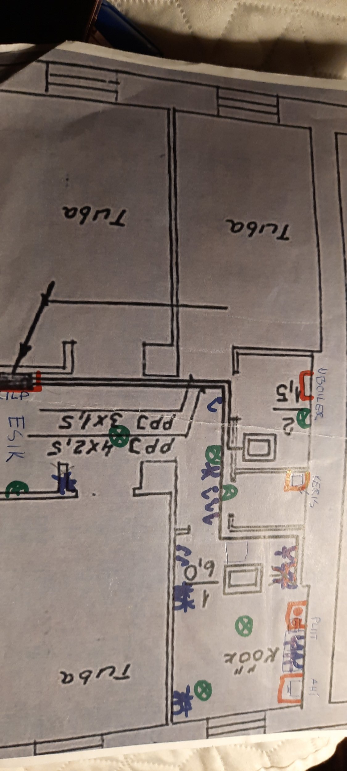 Esikus: 2x2 pistikupesa; 1 laelamp (veksel), 1 seinalamp (veksel), 1 seinalamp, lülitid vannitoa ja sauna jaoks;