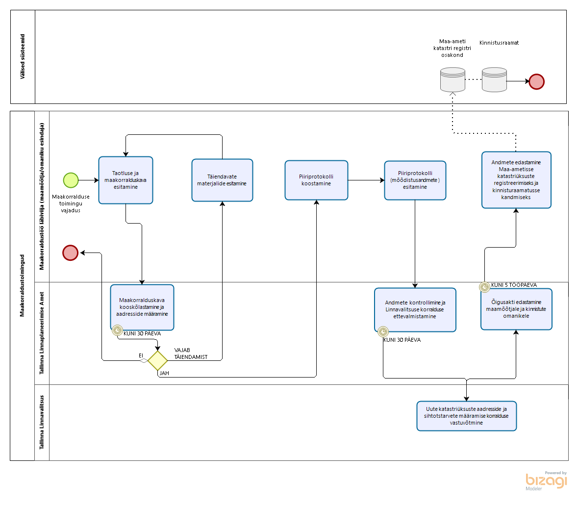 Tallinnas, Kristiine linnaosas, kahe elamumaa kinnistu jagamine kolmeks kinnistuks. Kuna eesmärgiks ei ole maksimaalne ehitusmaht ja kõik on kooskõlas üldplaneeringuga, siis vajalik koostada maakorralduskava ja piiriprotokollid - https://www.tallinn.ee/est/Kinnistu-katastriuksuse-moodustamine-jagamine-uhendamine-ning-piiride-muutmine