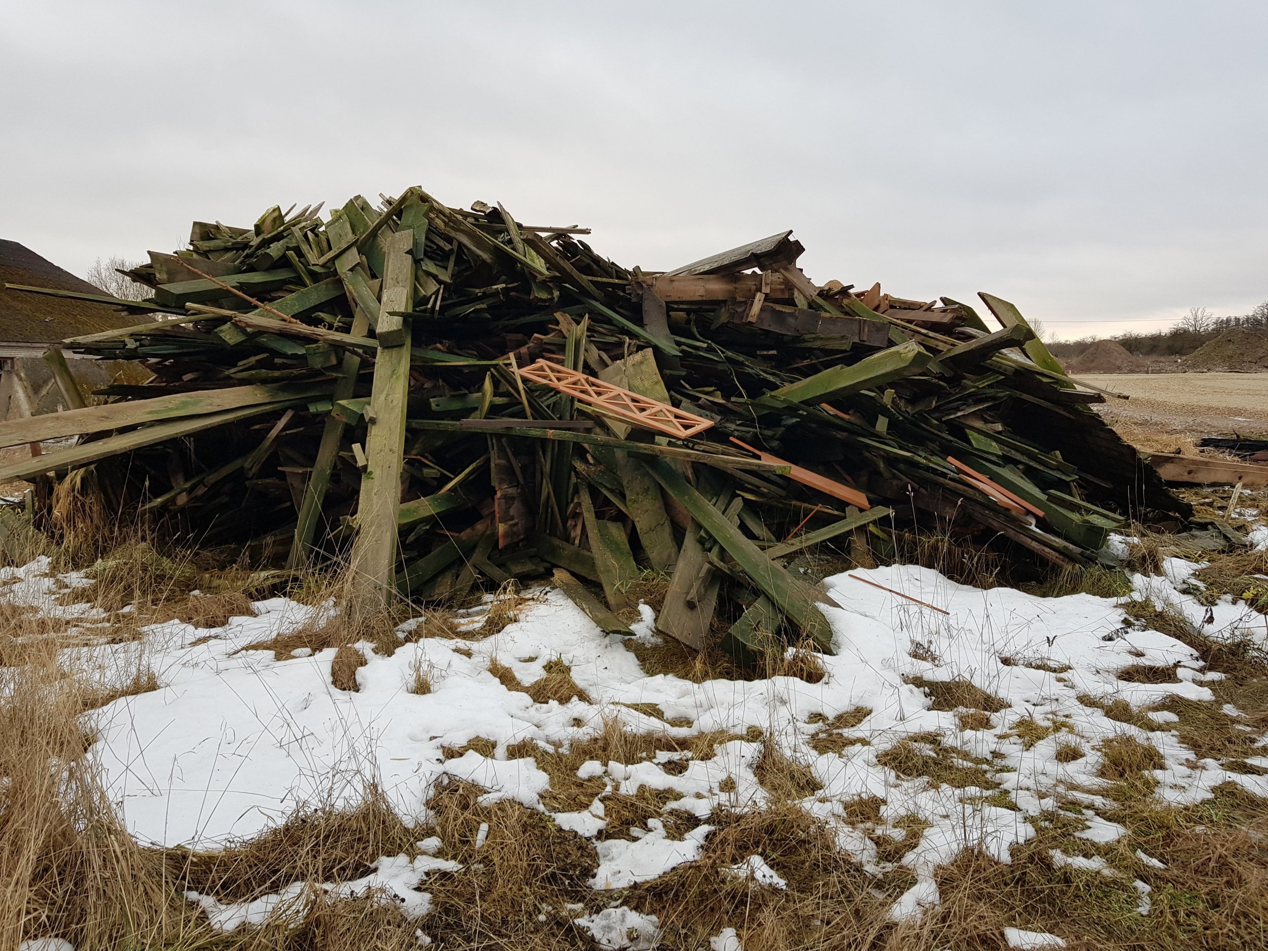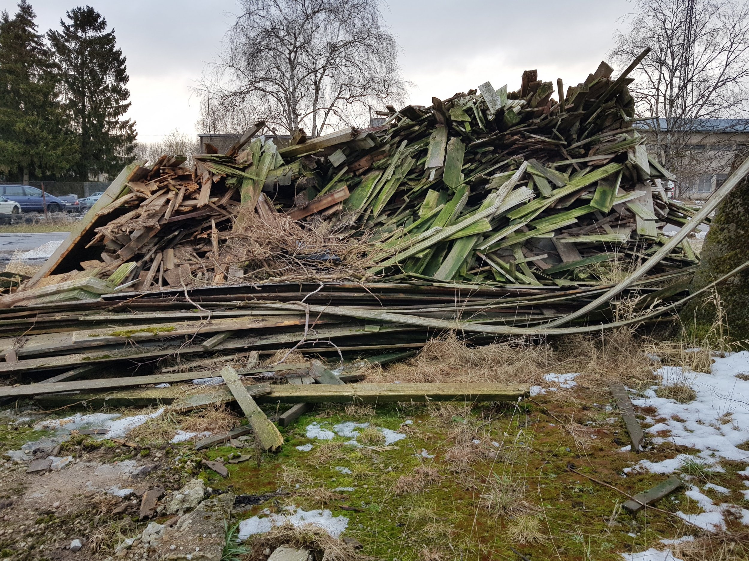 Lammutusest alles jäänud puitmaterjali ära vedamine. Puit on virnastatud üheks kuhjaks kohe kõvakattega tee kõrvale, nii et laadimine oleks lihtne.