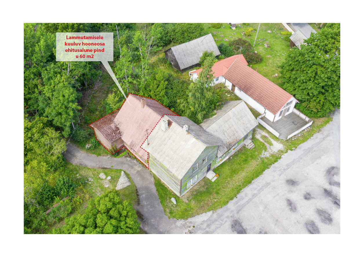 Lammutatav hooneosa on tähistatud fotol ja plaanil punktiirjoonega.