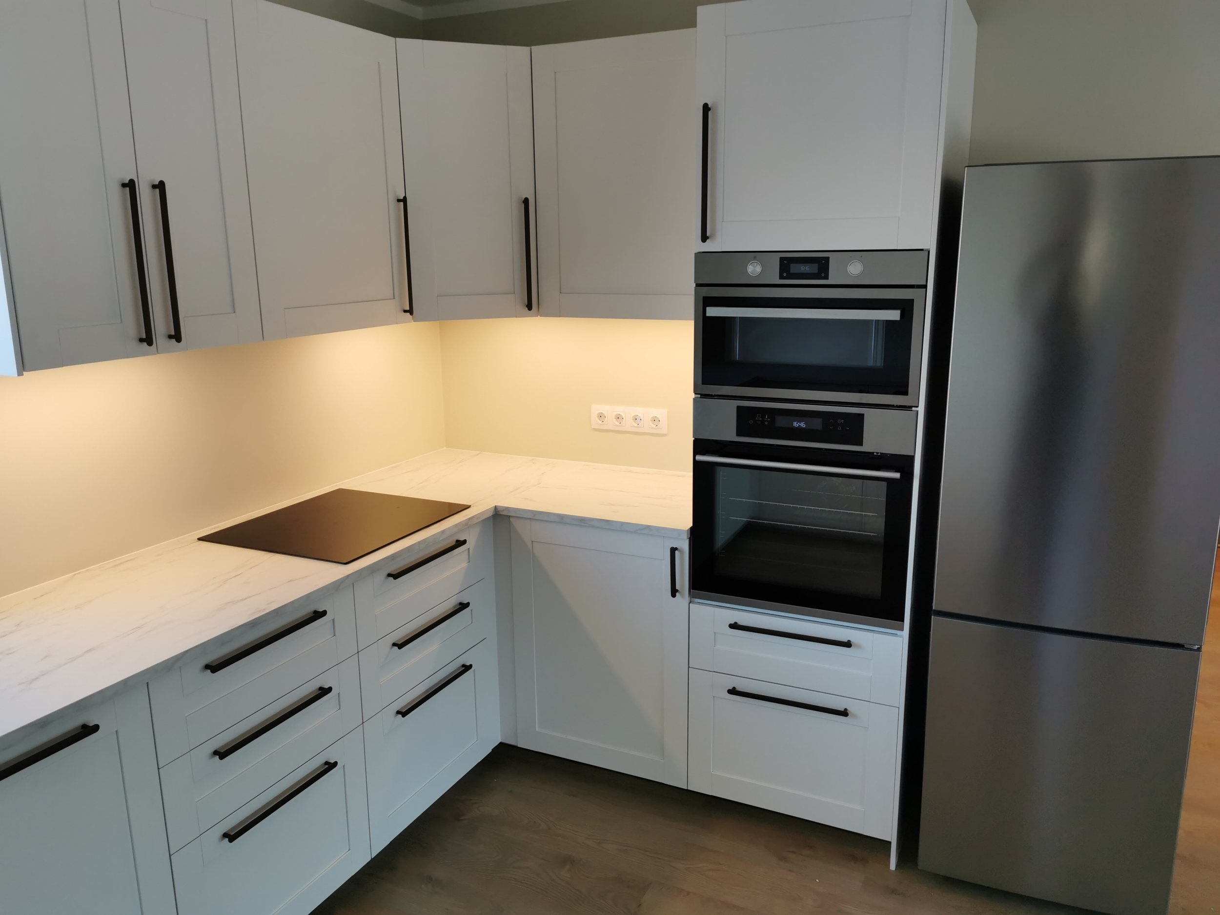Köögi taustseina plaatimine (kipssein), taustseina mõõdud 194,5x56 cm ja 127x 56 cm. Lühemas seinas pistikud.
