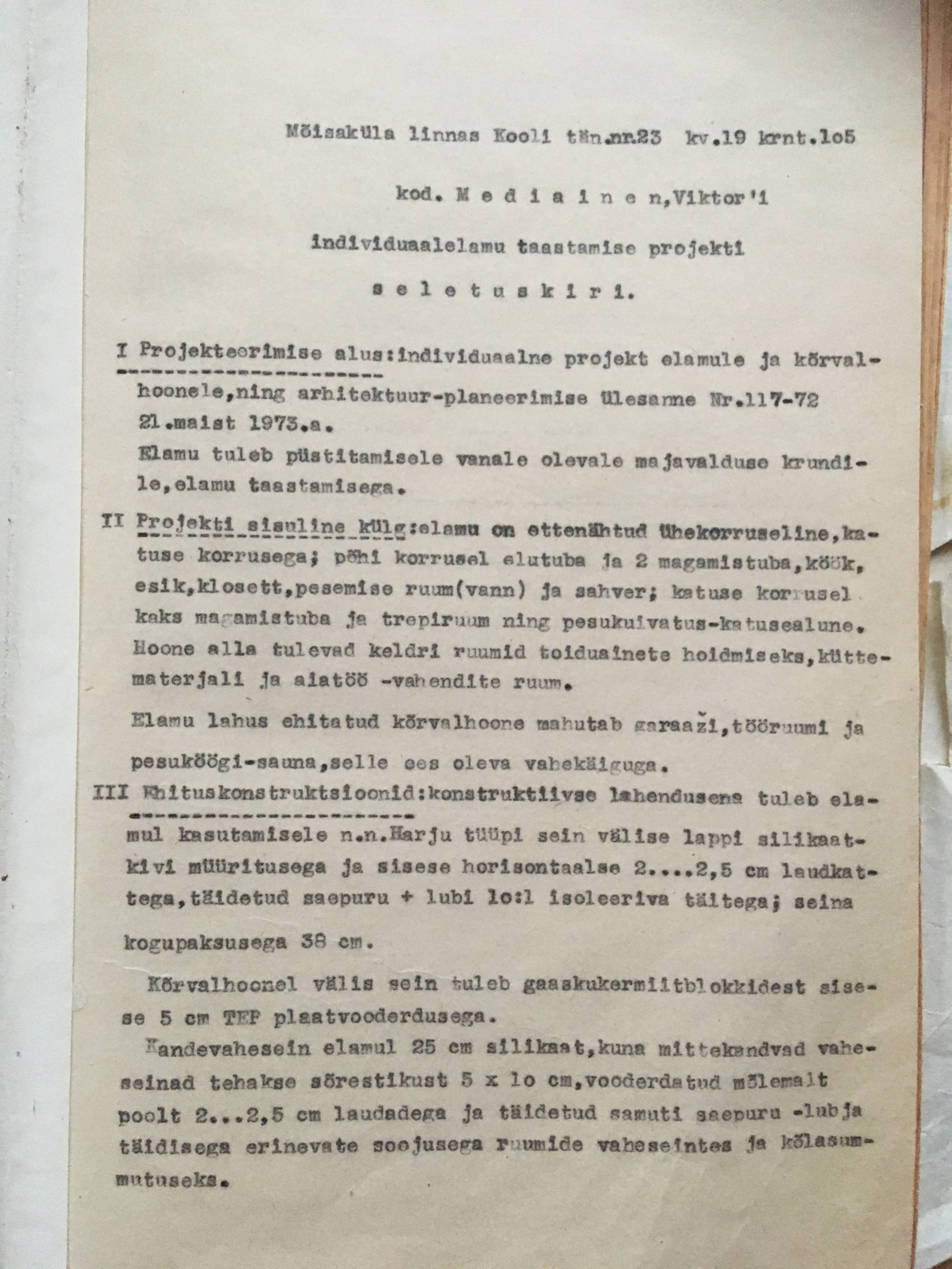 1978. aastal valminud eramu välisseinte (fassaadi ja sokli) soojustuslahenduse väljatöötamine ja projekteerimine. Projekti on vajalik ehitusloa taotlemiseks, Kredex-i väikeelamu rekonstrueerimistoetuse taotlemiseks ja ehitustööde tellimiseks.