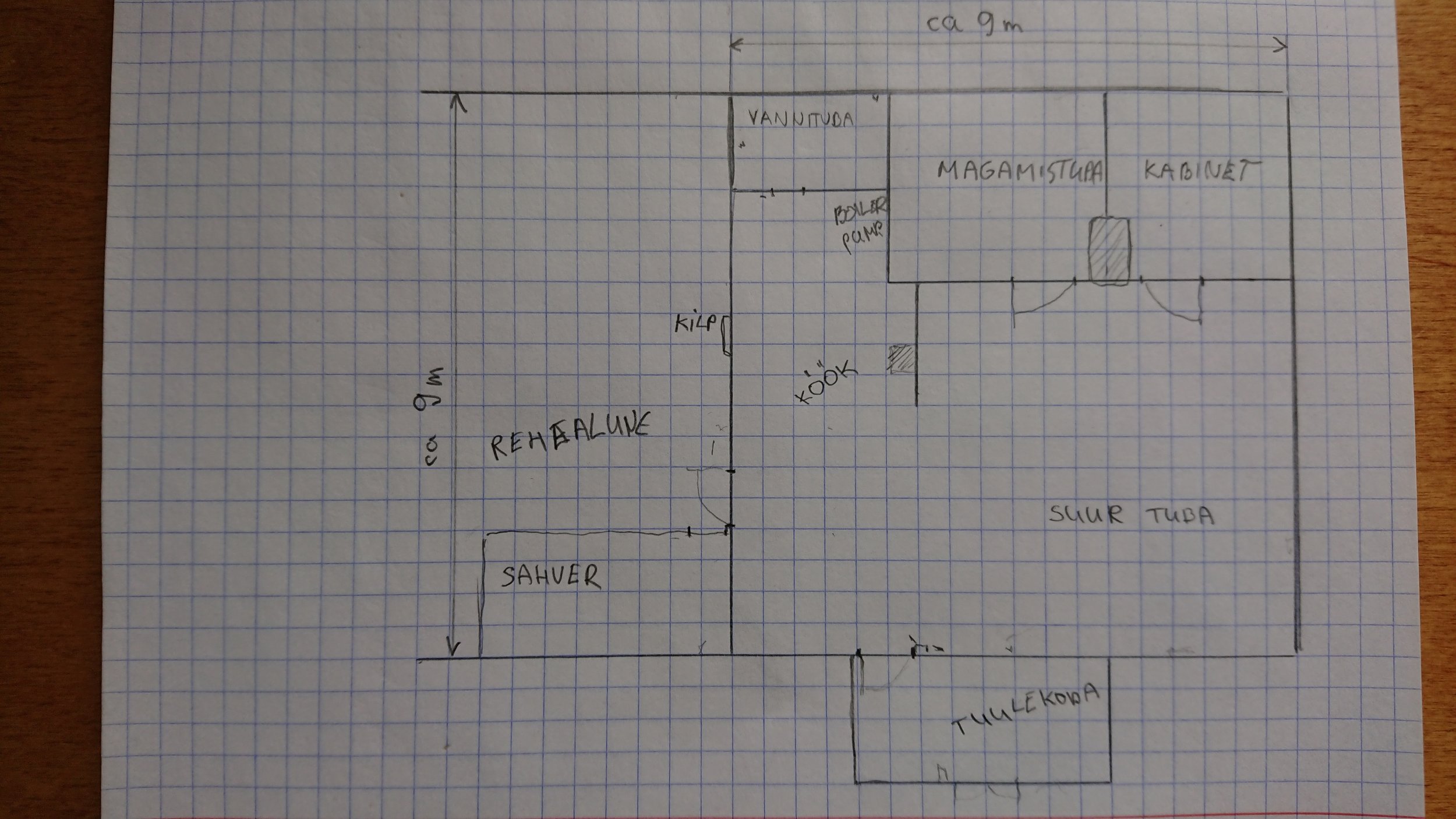 Vannituba: üks pistik pinnapealne ja üks kipsseina, valgusti (üld + peegel samast lülitist), põrandaküte (regulaator jääb köögi poole), ventilaator