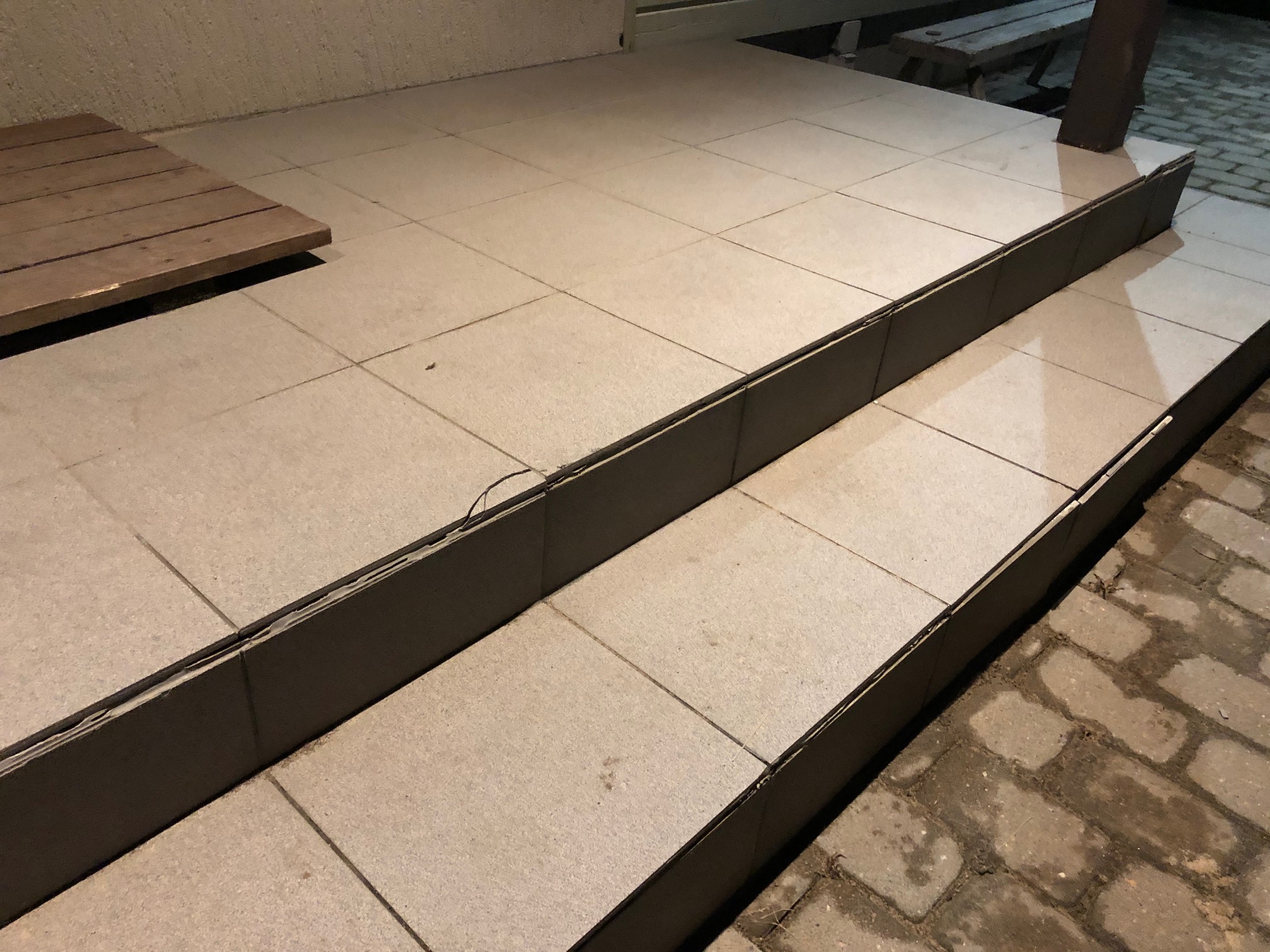 Hinnapakkumine sisaldab endas vanade plaatide eemaldust ja nende utiliseerimist. Betooni pinna ettevalmistust (plaatimissegu piikamist ja lihvimist, vajadusel tasandusvalu). Trepi ümber olevate tänavakivide eemaldust ja pärast ka uuesti paigaldust. Tumedama halli graniidiga (Steel Grey flamed) betooni katmine. Arvestatud on 20mm paksuse materjaliga. Astme- ja mademekivide ülekate varbakivide suhtes jääb 10-15mm. Trepi esiservad on faasitud 2x2 faasiga. Vuugid tehakse veekindlaks. Tulemus jääb väga ilus ja kindlasti ka vastupidav!