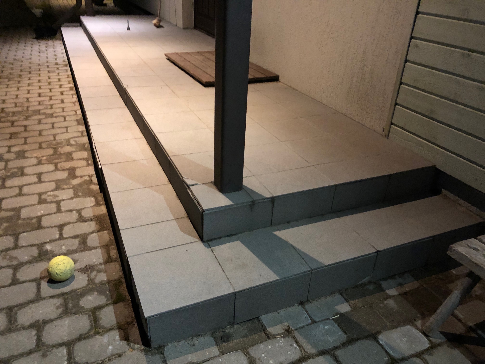Pesubetoonplaatide paigaldus ( hetkel on välisukse ja plaadi vahe ca 3 cm, seega vana plaat tuleb kindlasti eemaldada ja võimalik, et betoonikihti ka maha võtta, sest muidu ei hakka uks avanema)