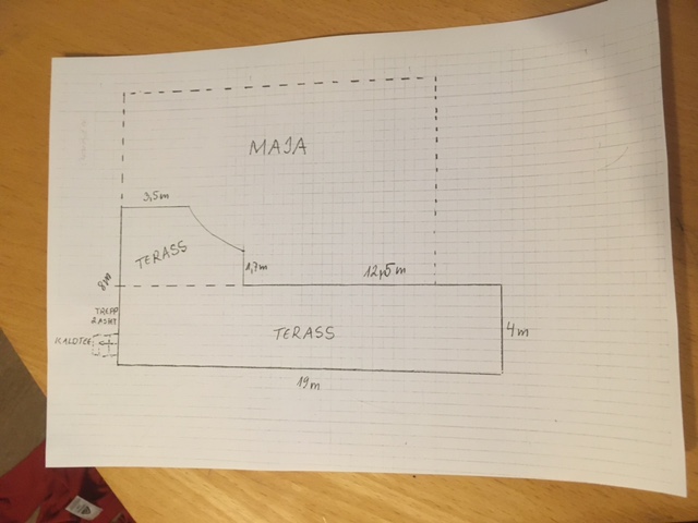 Soov on ehitada terass. Terassi suurus u 100 ruutmeetrit. Objekt asub Jõelähtme vallas.