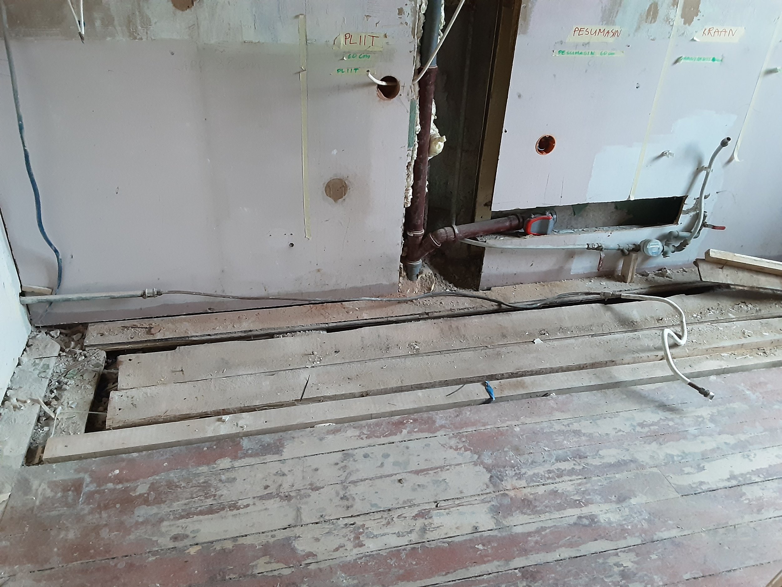 Vanade torude eemaldamine ja uute paigaldamine. Vannitoas on vaja 1. luua valmidus pesumasina ühendamiseks vee ja kanalisatsiooniga (praegu jookseb pesuvesi dušinurga vanni), 2. valmidus bideeduši ühendamiseks. 3. Boileri asukoha muutmine - olemasoleva boileri lahti ühendamine, uue boileri kinnitamine ja ühendamine uude asukohta. 4. WC äravool lekib, tuleb tuvastada leke ja parandada, see nõuab ilmselt poti eemaldamist kuna keldri poolt ei pääse ligi.