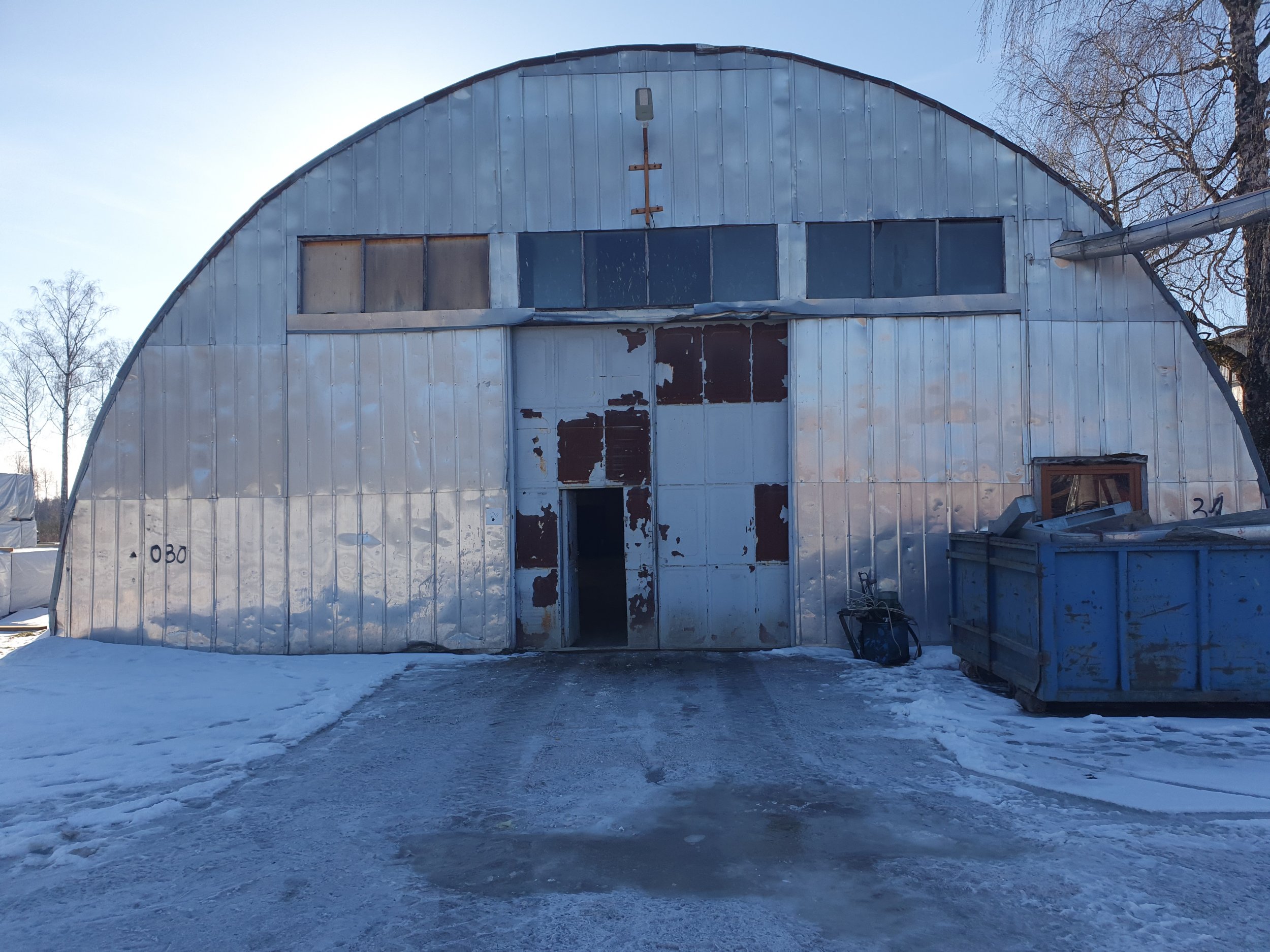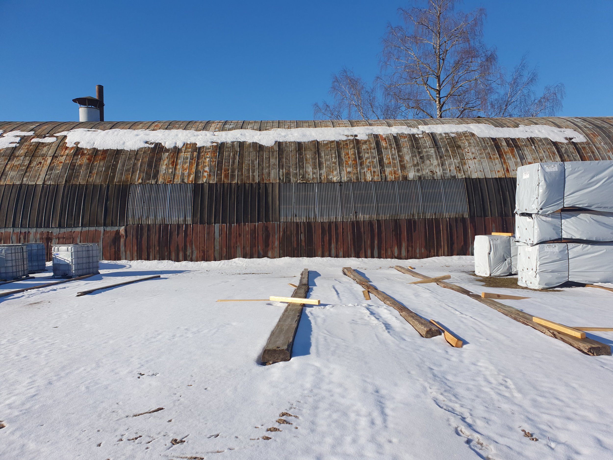 Nõukogudeaegse kaarhalli katusekooriku ja otsaseinte renoveerimine. Katusekoorikuks on kaarte vahele kinnitatud 50x100 puitprussidele toetuv konstruktsioon, pealpool kumer kaarhalli plekk, soojustuseks 100mm nõukogudeaegne "roosa" soojustus, allpool plekitahvlid. Konstruktsioon on osaliselt läbi sadanud ja puitosad ilmselt kahjustatud. Renoveerimise käigus tuleb defekteerida ja vajadusel osaliselt välja vahetada konstruktsiooni puitosa, paigaldada uus soojustus ja katta konstruktsioon pealt uuesti sobiva kattematerjaliga Ühte seina tuleb paigutada kihtplastist aknad vastavalt eskiisile. Hetkel olemasolevate akna- ja muude avade sulgemiseks, tuleb konstruktsiooni sisekülge paigaldada ca 110m2 siledat katteplekki. Otsaseintes tuleb vahetada soojustus ja katta seinad uuesti laineplekiga. Ühes otsaseinas paiknev 4X4 m tõstandväravat tuleb nihutada 2m. Mõlemasse otsaseina tuleb ehitada ribirestiga kaetud ventilatsiooniava. Eskiisil nähaolev kihtplastist aken jääb alles. Vajaminev puitmaterjal on töö tellija poolt.