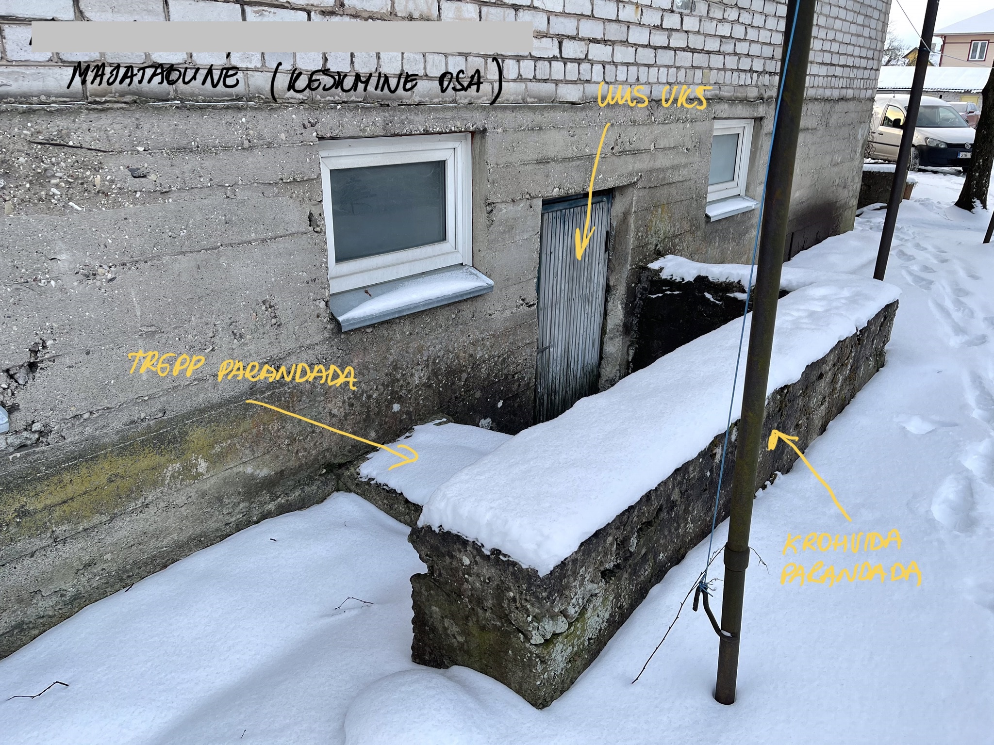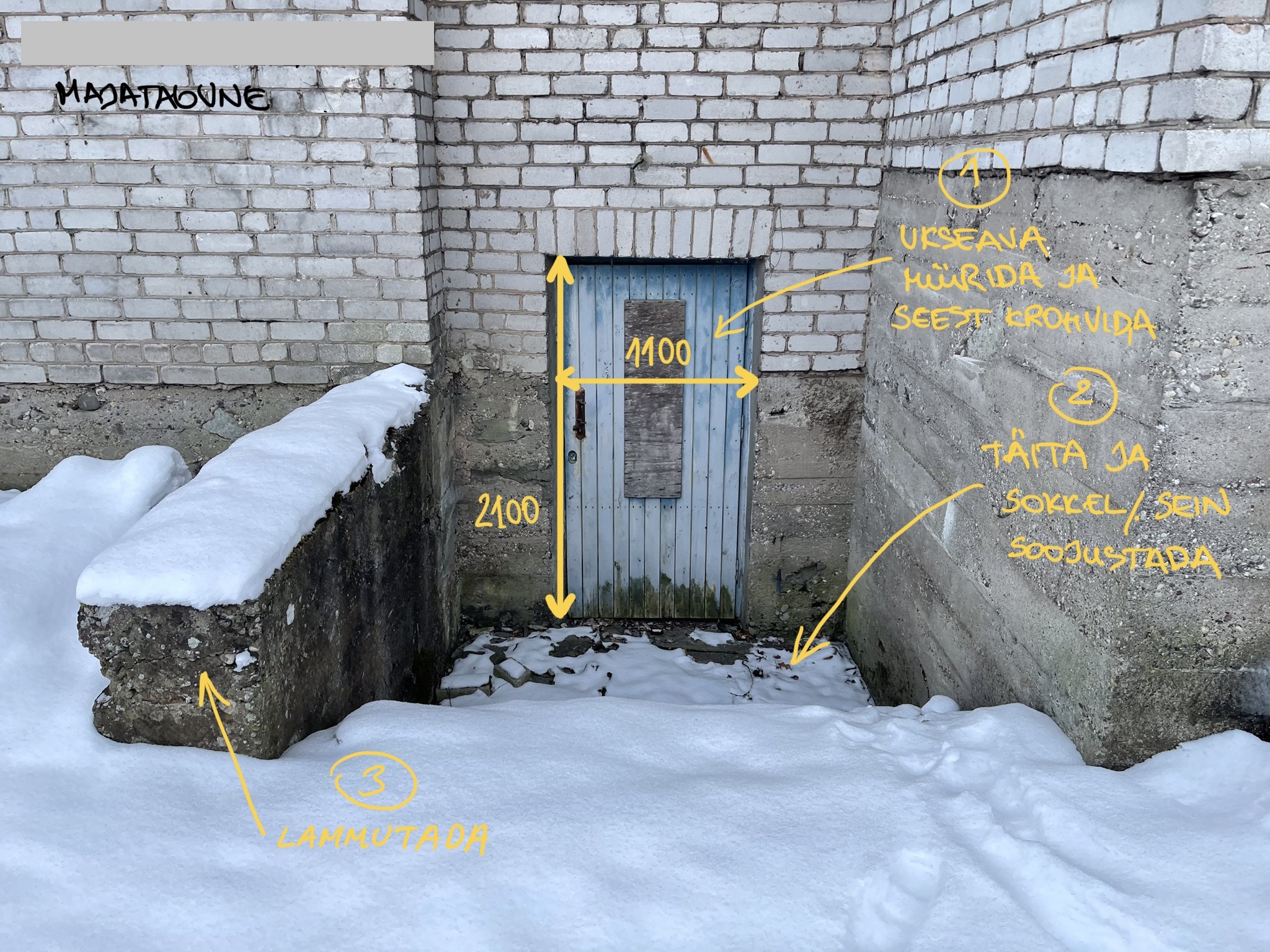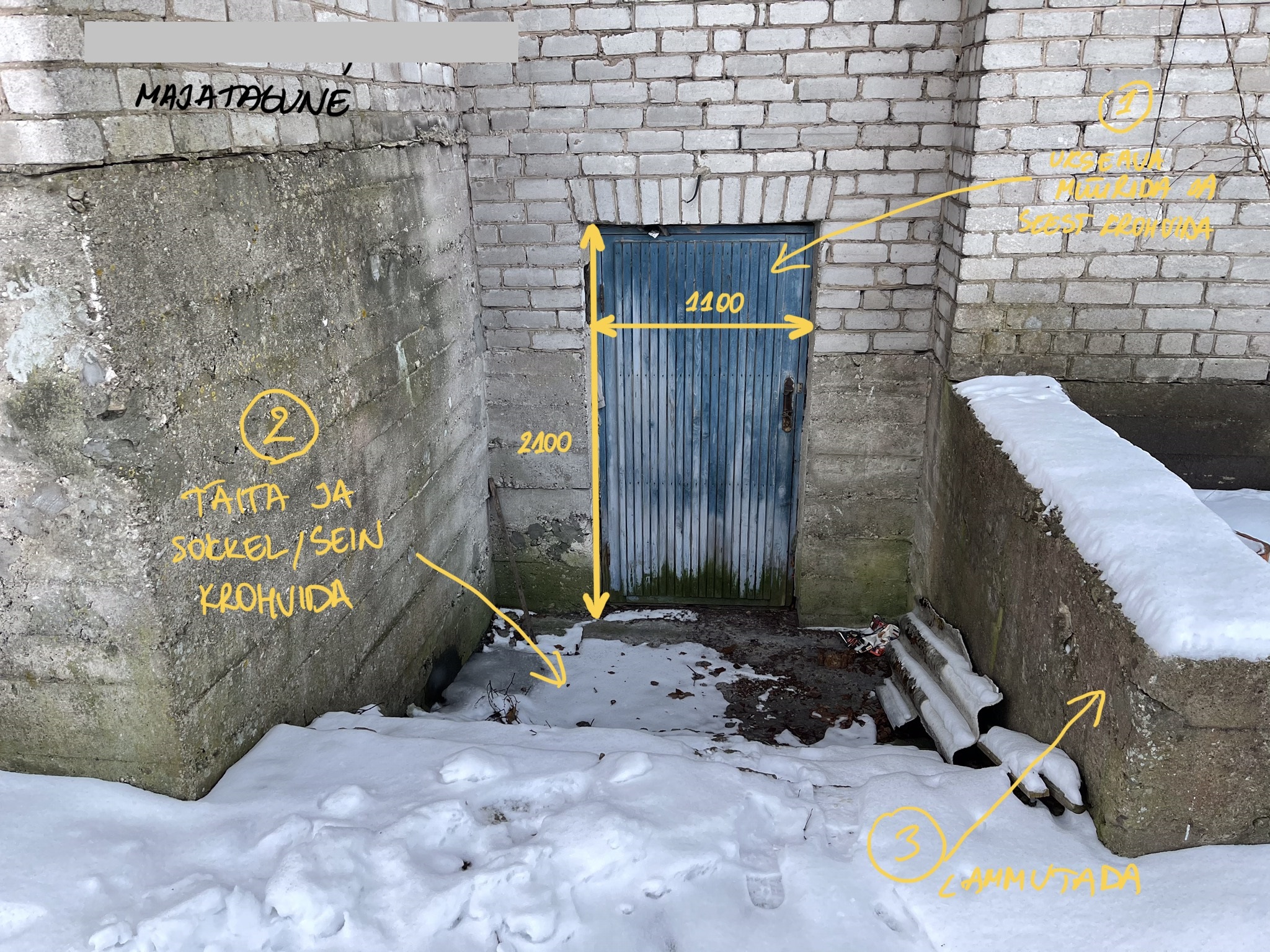- Avatäited. Töömahu hulka lugeda soojustatud välisuksed U-1, kogus 2 tk, vastavalt projektis esitatud avatäidete spetsifikatsioonile. Töömahu hulka mitte lugeda projektis esitatud teisi uksi ja aknaid (A-1, A-2, A-3, A-4, A-5, U-2, U-3, U-4). Need on tellija juba varasemalt paigaldanud. Aknaid ei tõsteta soojustuse tasapinda. Projektis kajastatud majataguseid uksi (keldriplaanil U-2 kogus 2 tk ja U-3 kogus 1 tk) ei paigaldata ja ukseavad laotakse kinni, näiteks Fibo 5 (300 mm) plokkidest ja krohvitakse mõlemalt poolt ning soojustatakse väljast koos sokliga;