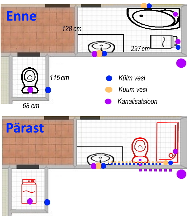 4) WC-poti paigaldamine ja torustikuga ühendamine (toru majapidamisruumi seina taga), uue kanalisatsiooni toru umbes 1 m. Õhuke seina on tellist või kuivkrohvitud.