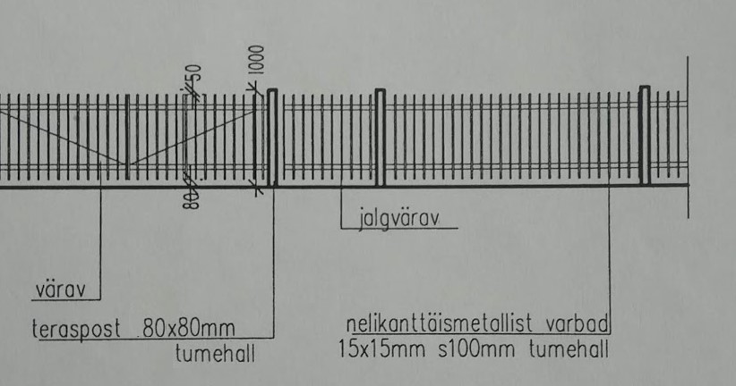 Aia postid neljakandilised 80x80 mm mõõdus. Aia varbad neljakandilised 15x15 mm mõõdus. Kahe varba vahe 100mm ning pikkus 1000mm. Aia postid jäävad varbadega samale kõrgusele.