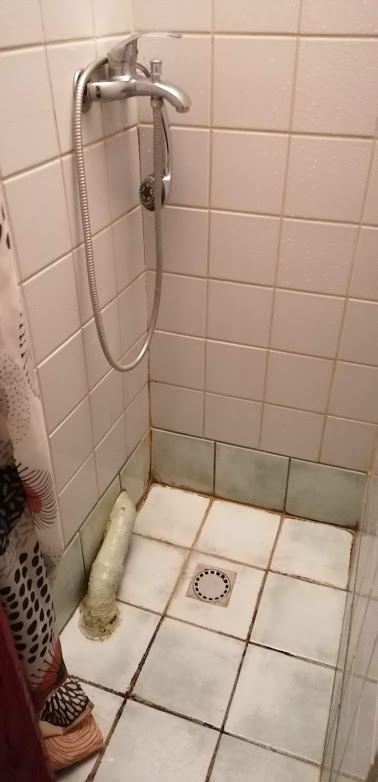 1. Lõhkuda välja kogu ruumi plaaditud põrand (190X63 cm) koos dušinurka ehitatud kõrgema osaga. WC poolses osas on põrandaplaadid juba osaliselt praktiliselt lahti ning need on kleebitud vana puitpõranda/papi peale. Dušinurka ehitatud plaaditud kõrgenduse all võib olla mingil määral ka peno+ betoonikiht. Kogu põrand tuleb täies ulatuses üles võtta ning ilmselt tuleb puuduliku hüdroisolatsiooni tõttu välja vahetada põrandatalad.