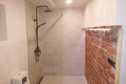 4. Valada uus põrand, paigaldada põrandaküte ning korralik hüdroisolatsioon. Oluline on, et põrandale tekiks piisav kalle, et ei tekiks probleemi hilisema vee äravooluga. Esimene eelistus on, et põrand jääks ühetasaseks, s.t. sellist kõrgendust nagu on praegu eriti ei soovi. Selleks, et vesi ei ujutaks üle kogu WC-d, oleks ilmselt vaja tekitada dušinurga ala ja WC piirkonna vahele plaatidest väike „äär“ või muu lahendus, mis kindlustaks vee püsimise dušinurga piirkonnas. Põrandale paigaldada trapp või duširenn (valik on veel otsustamisel).