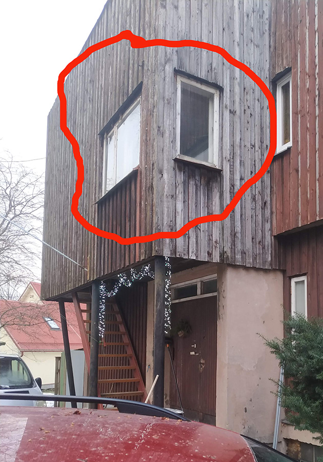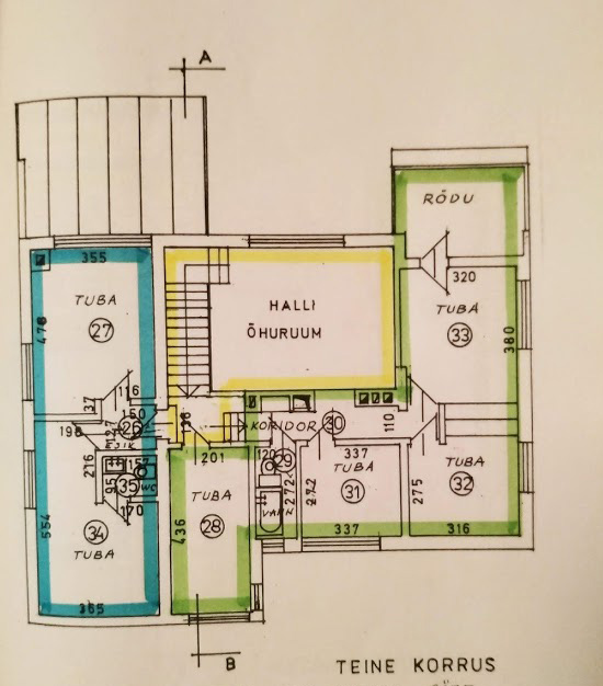 Ruumi põrandast saan lisada osalise pildi, hetkel kogu põrandapind pole vaba, st kõike pildistada ei saa. Samuti lisan pildi maja teise korruse plaanist ning õuest tehtud pildi, mis näitab, mis osas tuba majast eendub.