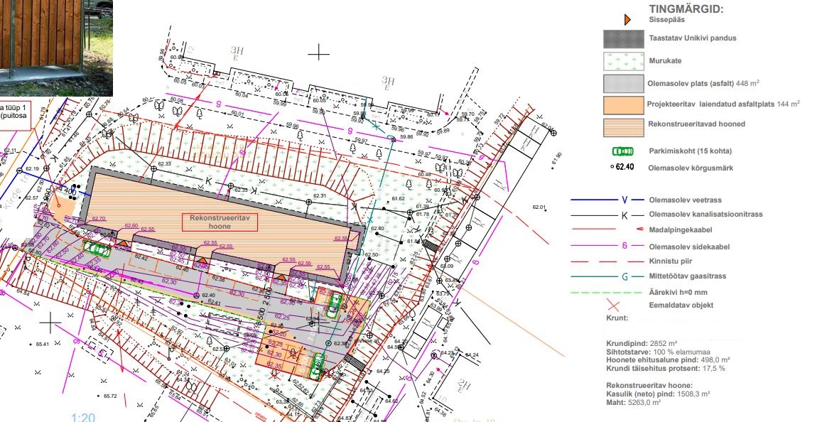 Olemasolev plats (asfald) 448ruutmeetrit ning juurde lisandub projekteeritav laiendatud asfaltplats 144ruutmeetrit. Kokku ~600 ruutmeetrit