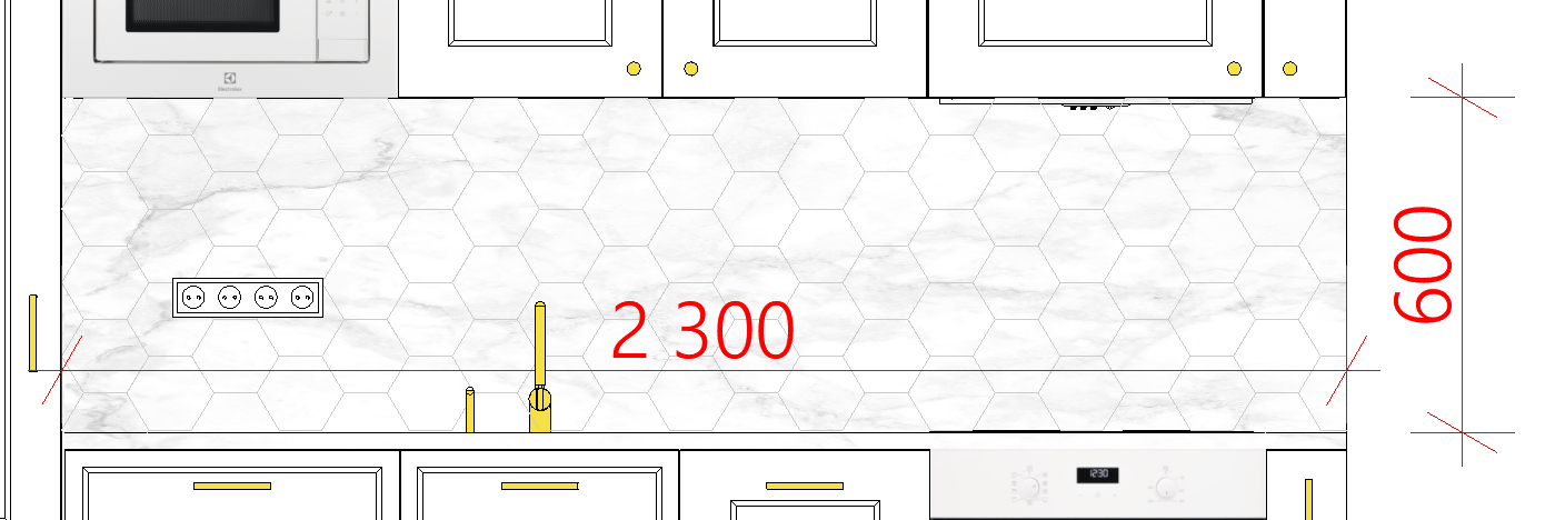 Plaatida heksagonplaatidega köögi tagasein (2300mm; h600mm) ja osaliselt külgsein (u 350mm; h600mm). Lõigata välja üks 4x pistikupesa auk.