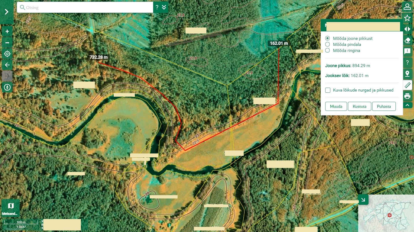 Liitumispunkt on Eesti Energia poolt planeeritud. Vaja oleks viia kaitsekõrgis maakaabel 4x16 liitumispunktist (pildil tähis 162,01 - mets on kogu krundilt maha võetud... mõned üksikud puud alles) kõrvalkrundile (kokku ca 894m, pildil lõpu tähis 732,28), sinna paigaldada uus väliskilp (peab olema lahendus edasi hoonesse viimiseks ja väljundid nii 3 faasi kui ka tavaline 220V) ning teha vajalikud toimetused, et oleks võimalik elektrit tarbima hakata. Joonisel üks võimalik maakaabli viimise teekond, mis tundub pinnast arvestades lihtsam: jõe äärne muldkeha, sealt üles metsateele. Pärast kogu maakaabli kraav kinni ajada ja taastada metsatee esialgne olukord.