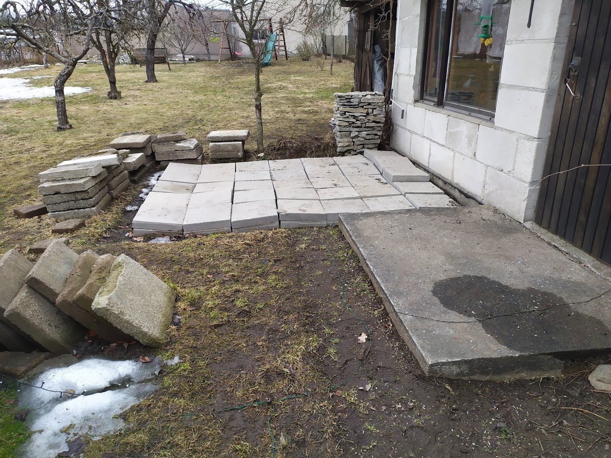 Otsime kevadeks kedagi, kes ehitaks lõpuni eramaja sisehoovi kõnnitee ning istumisnurga. Kõnnitee kivid on endal juba olemas ning samuti osaliselt välja kaevatud ala kuhu kivid paigaldada tuleks. Kõnnitee pikkus on umbes 6m ja laius 1m. Istumisala suurus umbes 4x6 ruutu. Mõõdud on umbkaudsed.