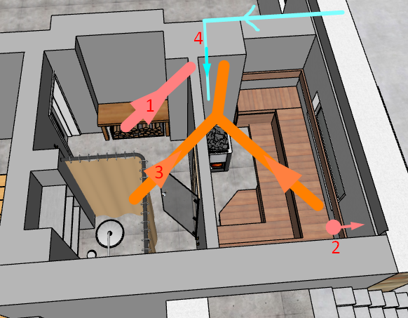 3) Sundväljatõmme duširuumi ja lava kohalt (mida kasutada pärast sauna ruumi kuivatamiseks)
