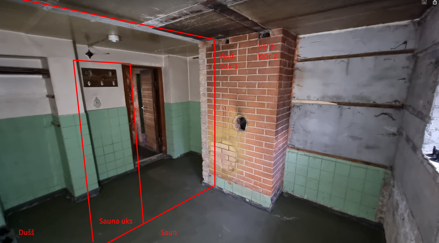 "Sauna ventilatsioon 2 ja 3" piltide pealt on näha praegune seis, kus vahesein on veel ehitamata.