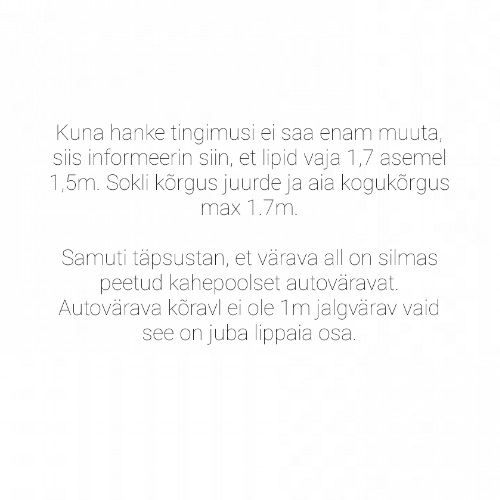 Ehitamist vajab kahepoolne vertikaalne lippaed koos tiibväravaga. Aia kogupikkus on ligikaudu 35 meetrit millest värava laius tuleks 3,5m. Värav ilma lukuta ja ainult seest avatav. Lippide pikkus 1700, laius 95-120mm. Samm üle ühe, lipid siin ja sealpool ei kattu. Aiaosa all ääres moodulsokkel. Värava raam, aiapostid jm konstruktsioon värvitud pruun. Põõnad ja lipid immutatud pruun - nt Pinotexi toon Palisander. Pakkumist küsiksin kahes osas. 1) Postid, väravaraam ja sokkel koos paigaldusega 2) lisaks eelnevale ka immutatud puitosad ehk valmis aed. Pakkumises kirjeldada kasutatavaid materjale ning paigaldusviise. Töödega saab alustada esimesel võimalusel.